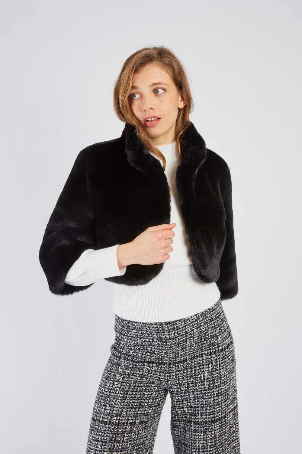 Giacca cortissima in morbida pelliccia sintetica, ideale per riscaldare un outfit formale. Discreta chiusura frontale con gancio. Maniche a 3/4 per un look elegante e raffinato. Uno stile chic e senza tempo, perfetto per le serate o le occasioni speciali in inverno.