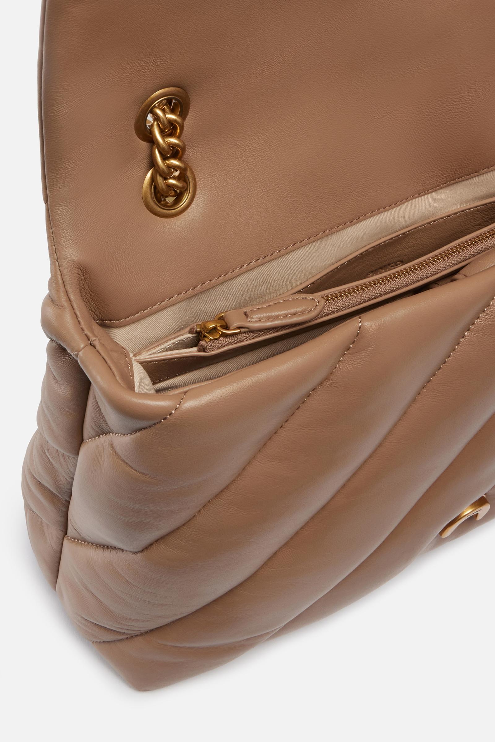 Borsa grande a tracolla Big Love Bag Puff in morbida nappa caratterizzata da maxi trapuntatura obliqua. La chiusura è completata dall'iconica fibbia in metallo Love Birds Diamond Cut. L'interno è foderato in microfibra scamosciata e comprende tramezza chiusa con zip e tasca a parete. La tracolla combina la classica catena metallica rotonda al pratico spallaccio in nappa. Attiva la tua borsa PINKO: verifica l'autenticità del tuo prodotto e accedi all'esperienza personalizzata avvicinando il tuo smartphone al ricamo Love Birds che trovi sul retro della borsa!Pelle: PELLE DI PECORA 100% - Accessorio: Zinco 100% - Fodera: COTONE 100%