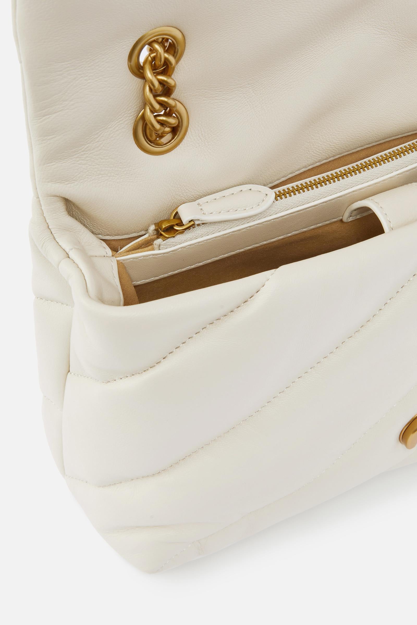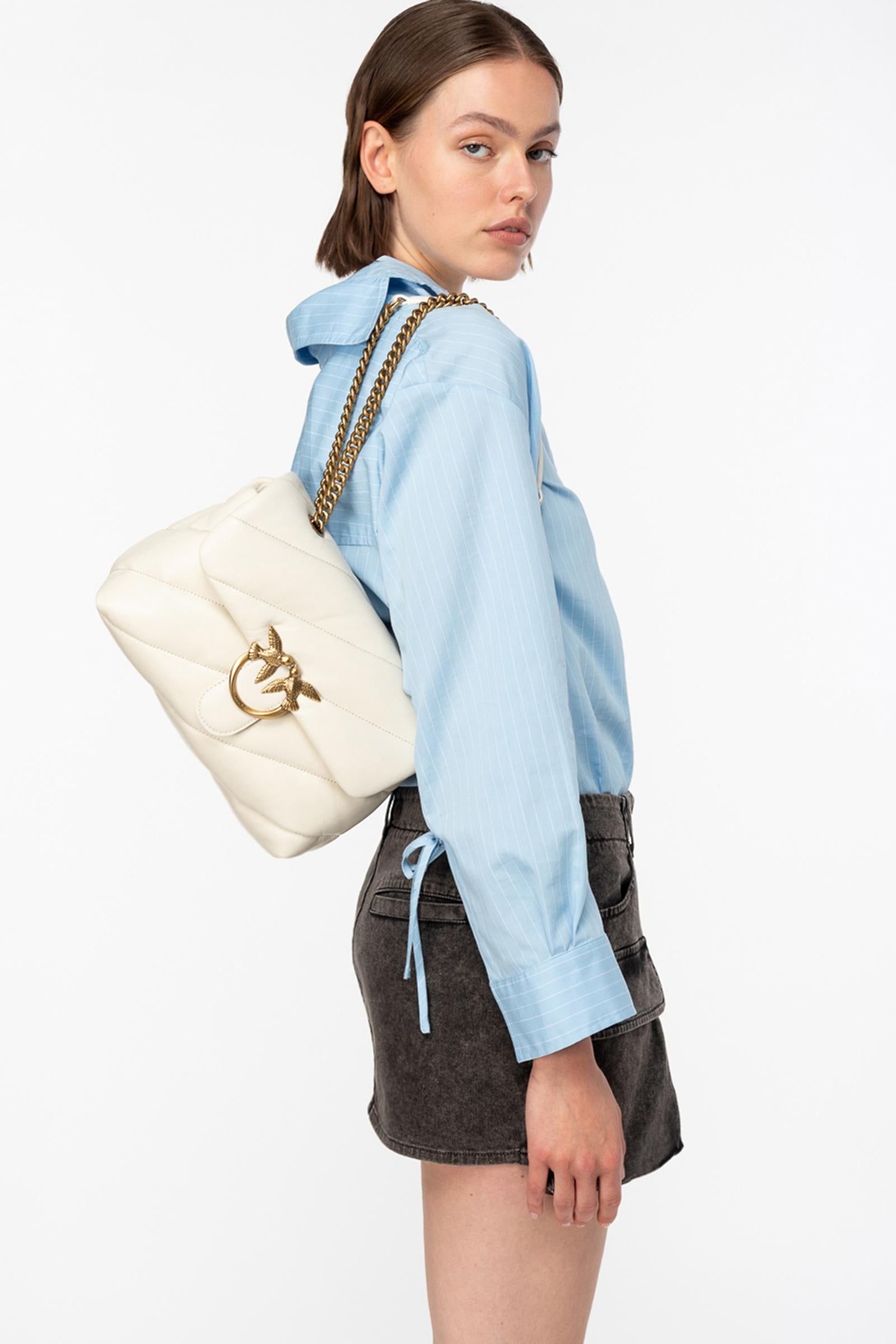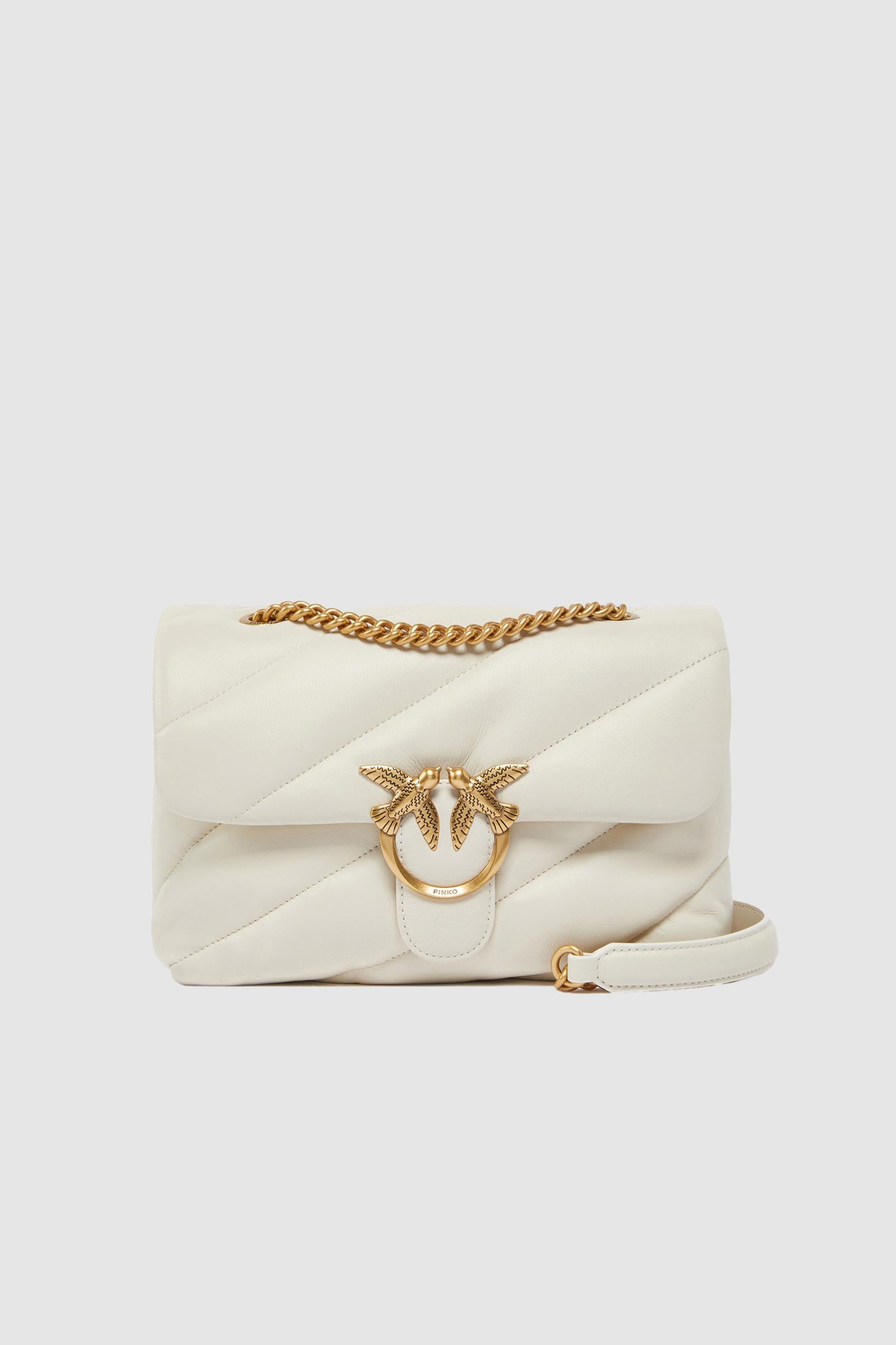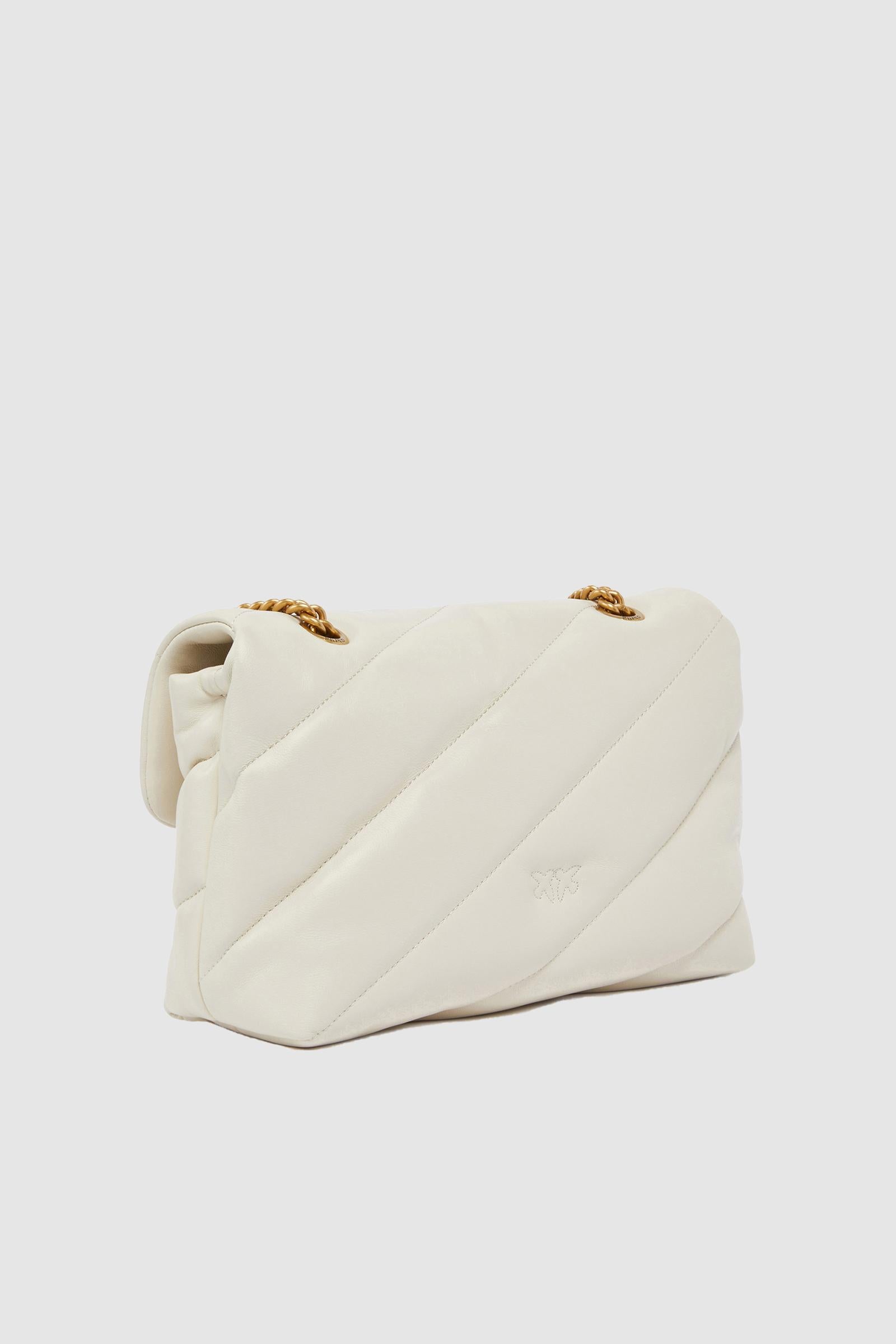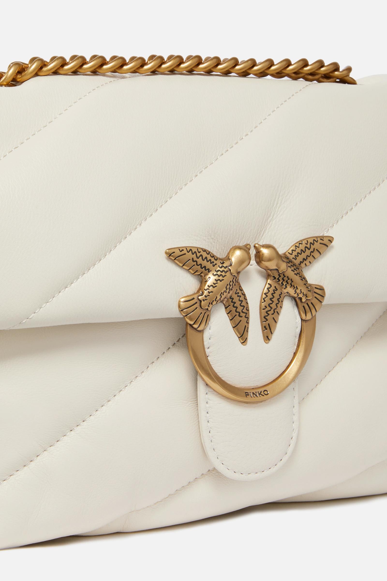 Classica borsa a tracolla Love Bag Puff in nappa morbida trapuntata con maxi pattern obliquo. La chiusura con patta è personalizzata con fibbia iconica in metallo Love Birds Diamond Cut. L'interno è foderato in tessuto scamosciato e include tramezza chiusa con zip e tasca a parete. Completa di tracolla che combina la classica catena metallica rotonda al pratico spallaccio in nappa. Attiva la tua borsa PINKO: verifica l'autenticità del tuo prodotto e accedi all'esperienza personalizzata avvicinando il tuo smartphone al ricamo Love Birds che trovi sul retro della borsa!Pelle: PELLE DI PECORA 100% - Accessorio: Zinco 100% - Fodera: COTONE 100%