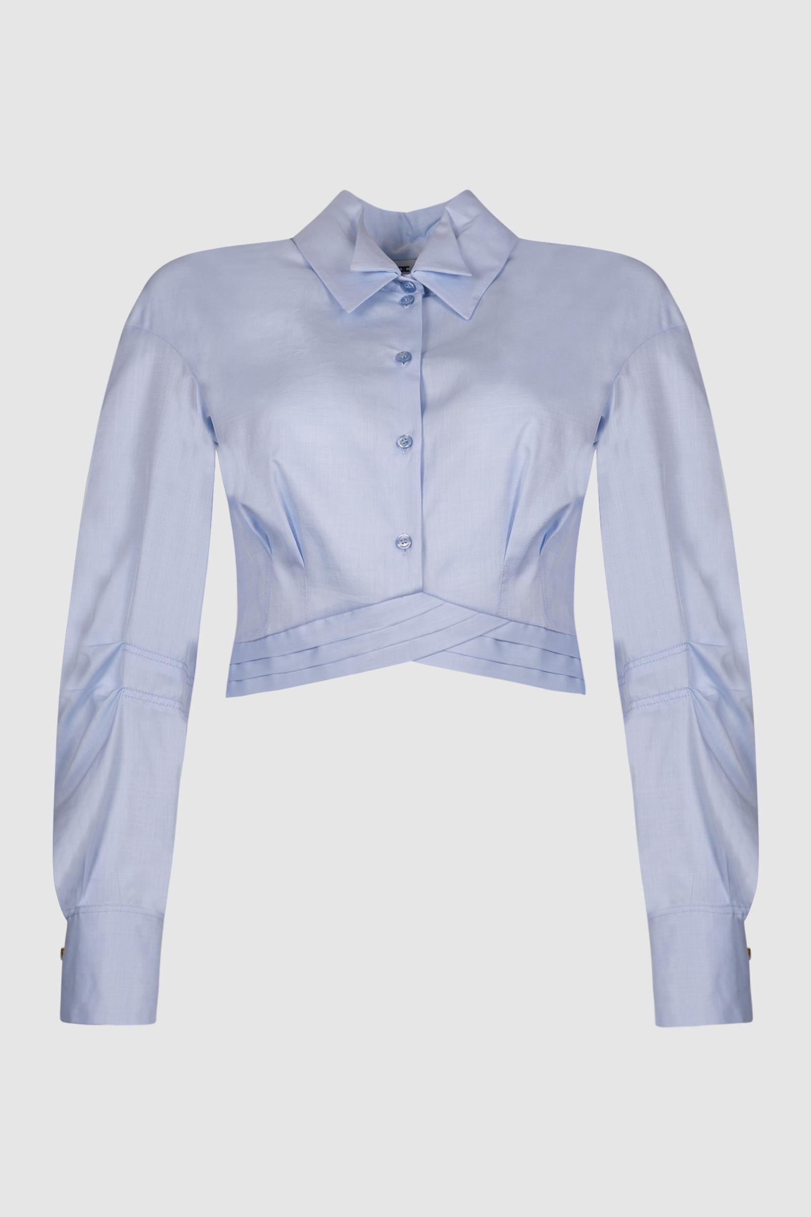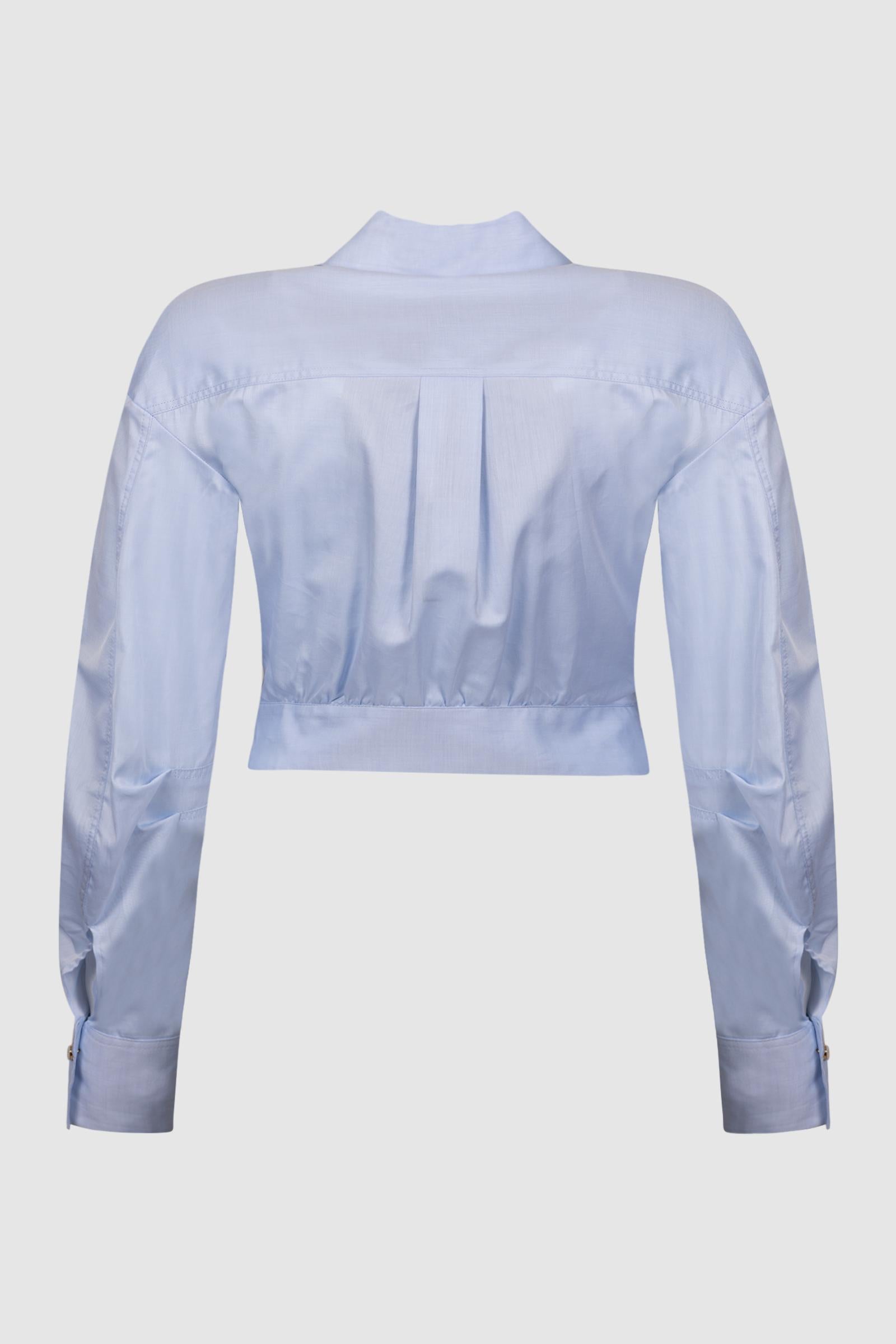 Camicia in popeline di cotone dalla vestibilità regular. Si distingue per i giochi di volumi che dialogano con dettagli sartoriali come il doppio colletto di ispirazione smoking, le maniche ampie e il fascione con pieghe sul punto vita.Chiusura con bottoni