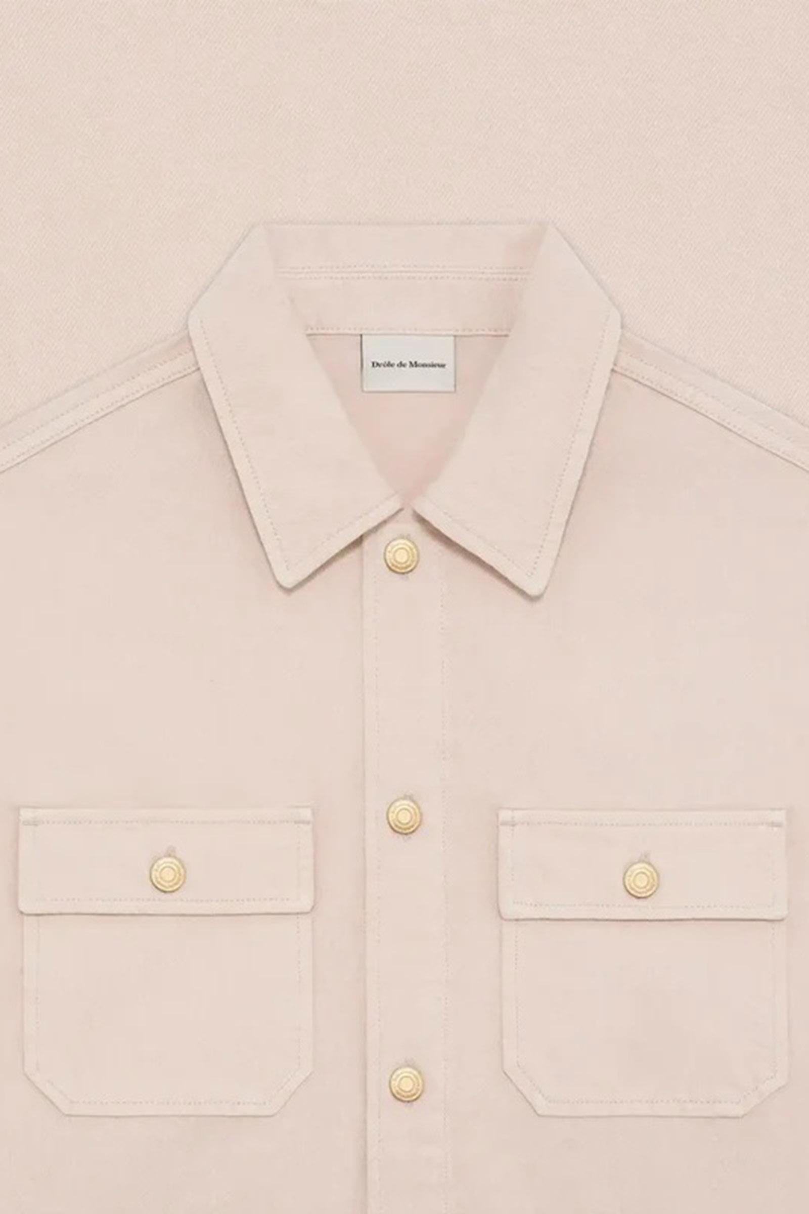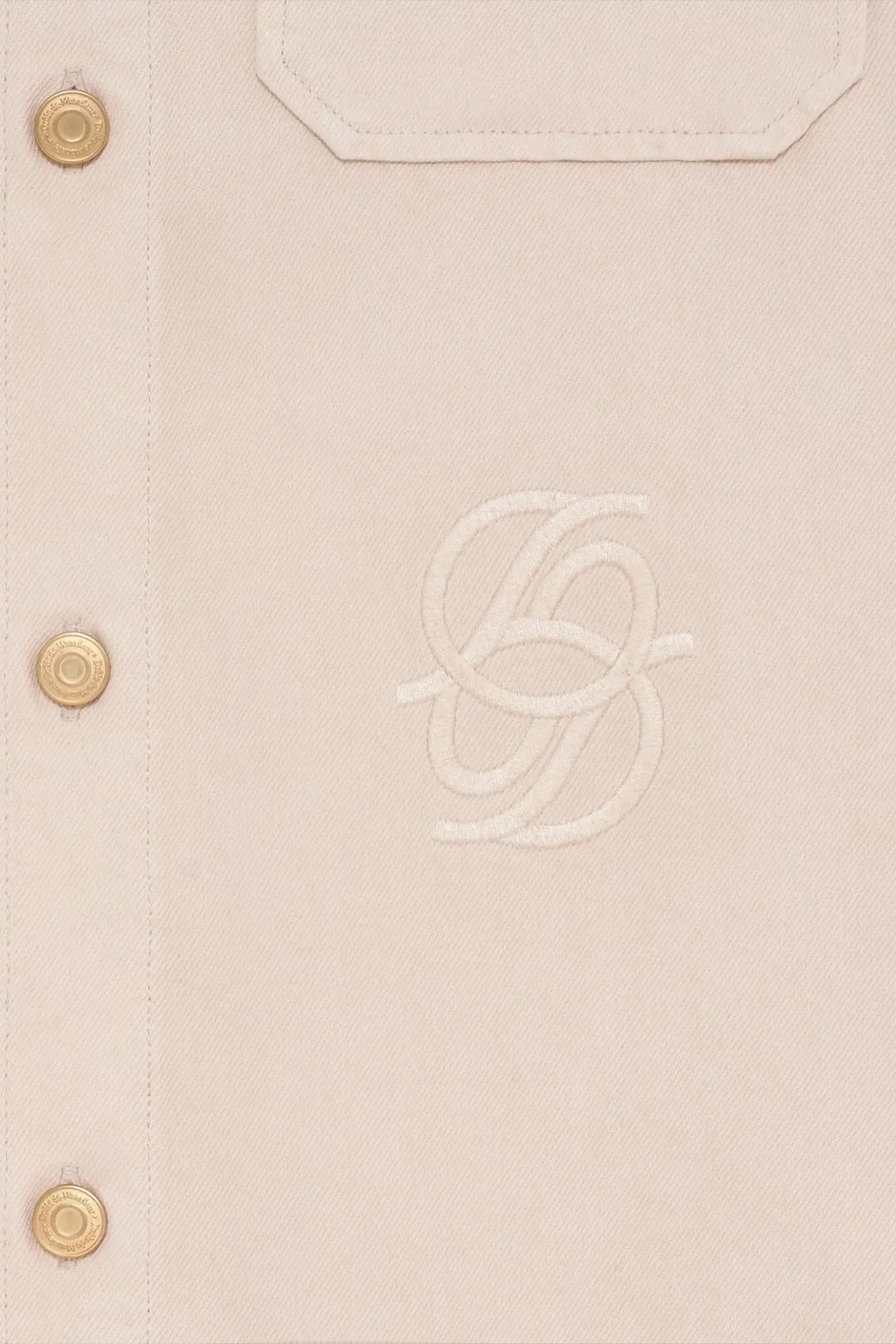 Questa camicia in denim beige 100% cotone presenta due tasche con patta sul petto e bottoni in denim, cinque bottoni in denim sul davanti, un ricamo a "D" specchiato tono su tono sotto il taschino sul petto e polsini aderenti.