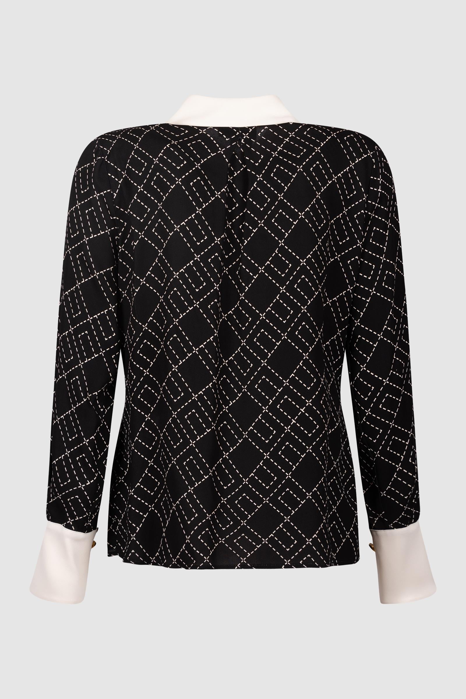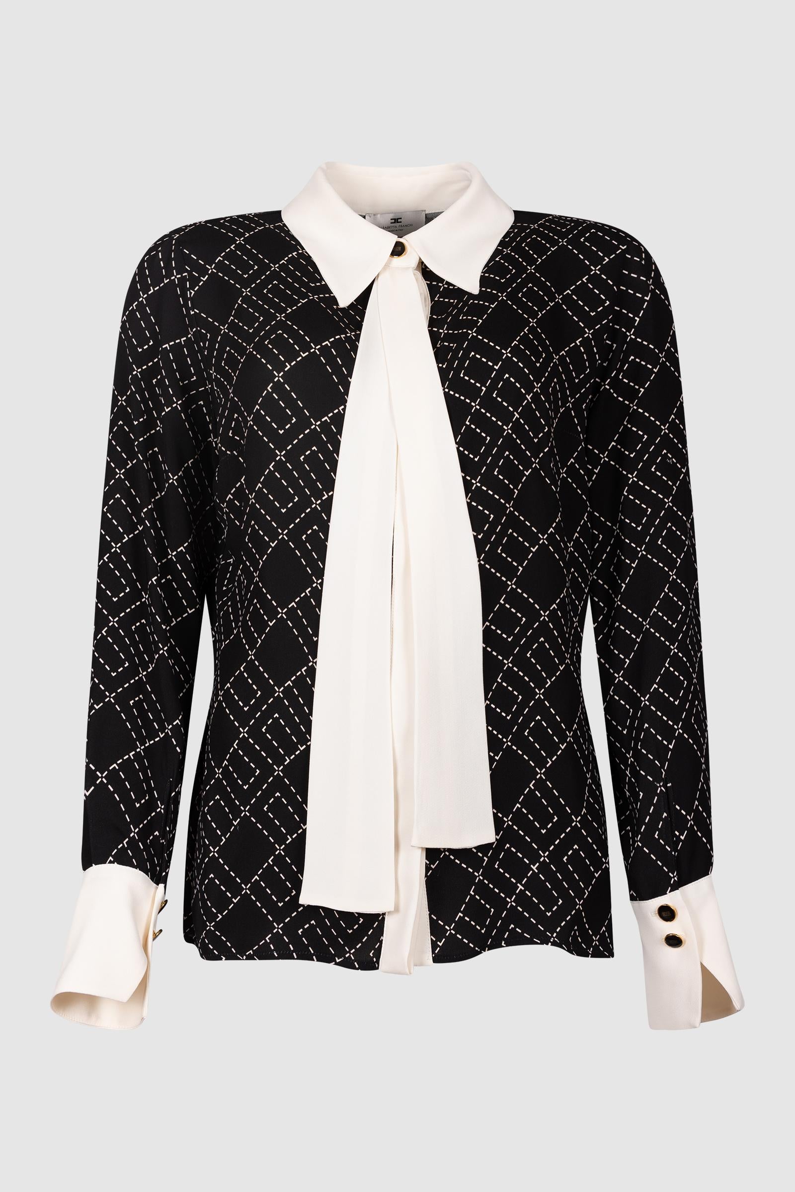 Camicia in georgette dalla vestibilità slim. Presenta colletto con doppio foulard, polsi alti e asimmetrici con bottoni smaltati e si distingue per la stampa con pattern di collezione che crea un dinamico motivo bi-color, esaltato dai bordi a contrasto.