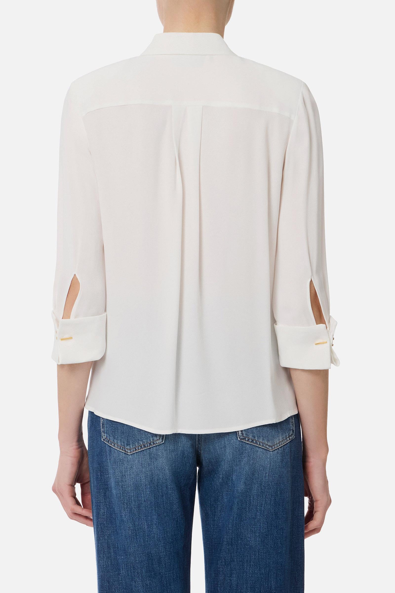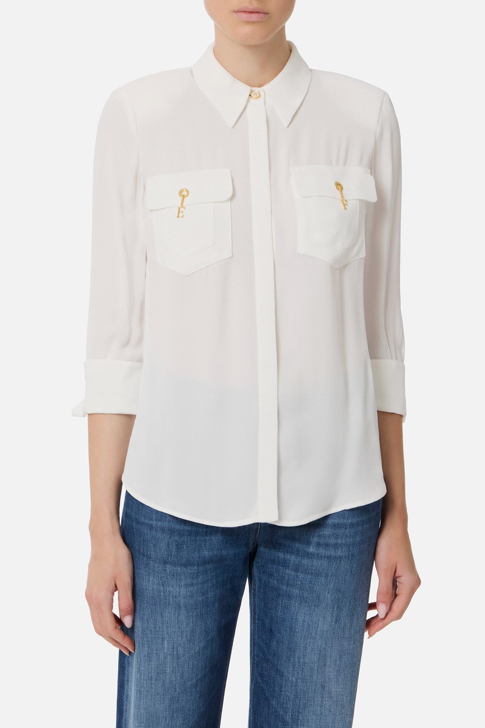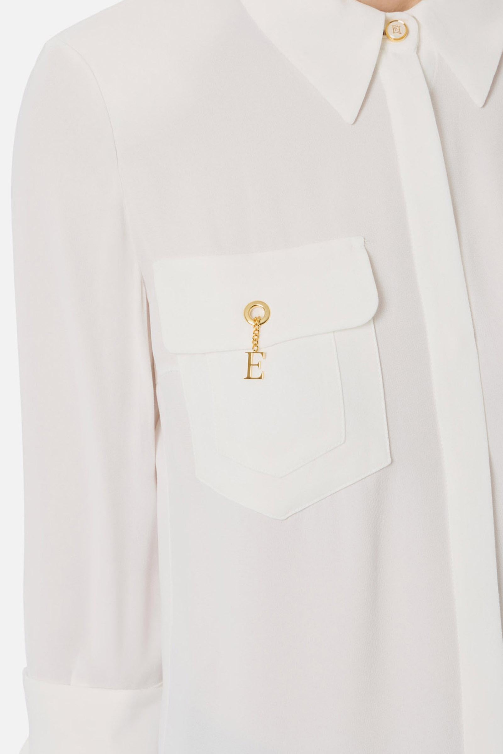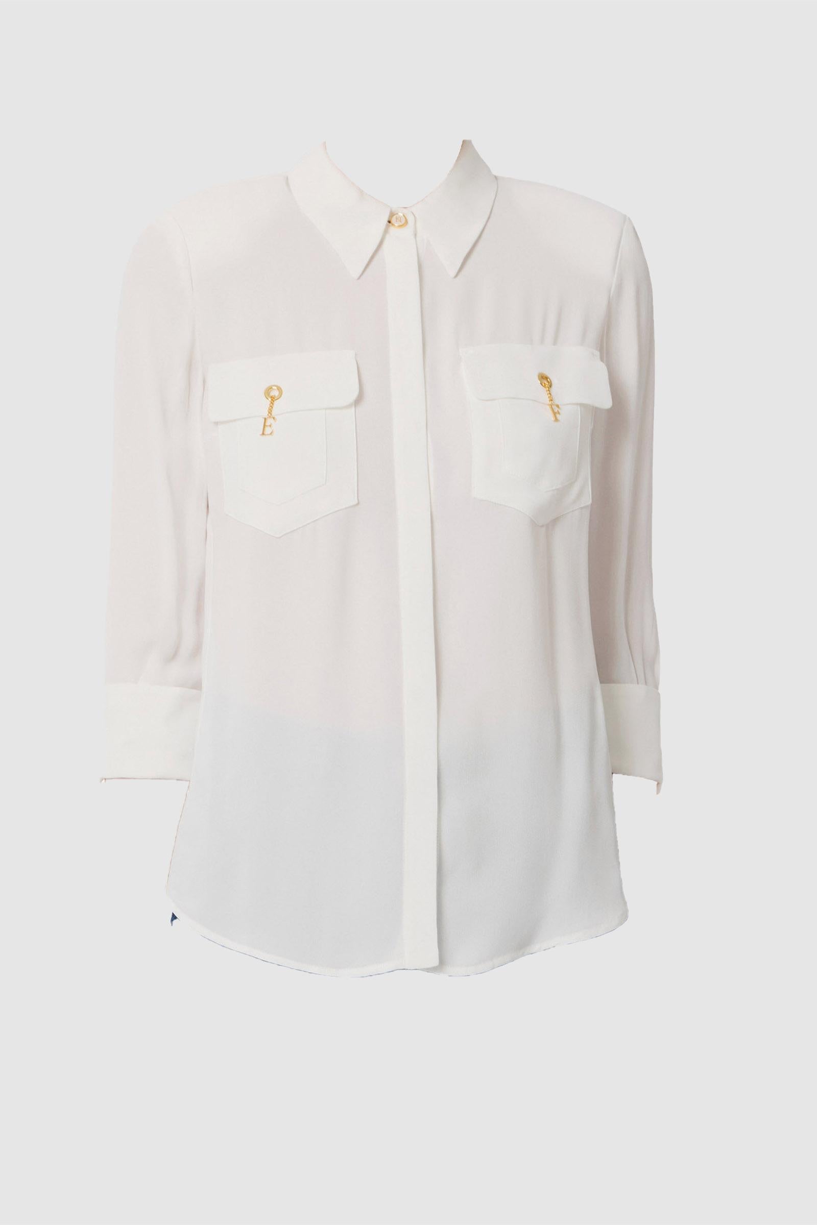Camicia in georgette di viscosa dalla trama compatta. Il capo ha colletto classico, maniche ¾ e tasche con patta. Focus sui dettagli gioiello: il bottone smaltato a vista, i gemelli pendenti con catena e quelli sui polsi illuminano il capo con molteplici note preziose. Vestibilità slim