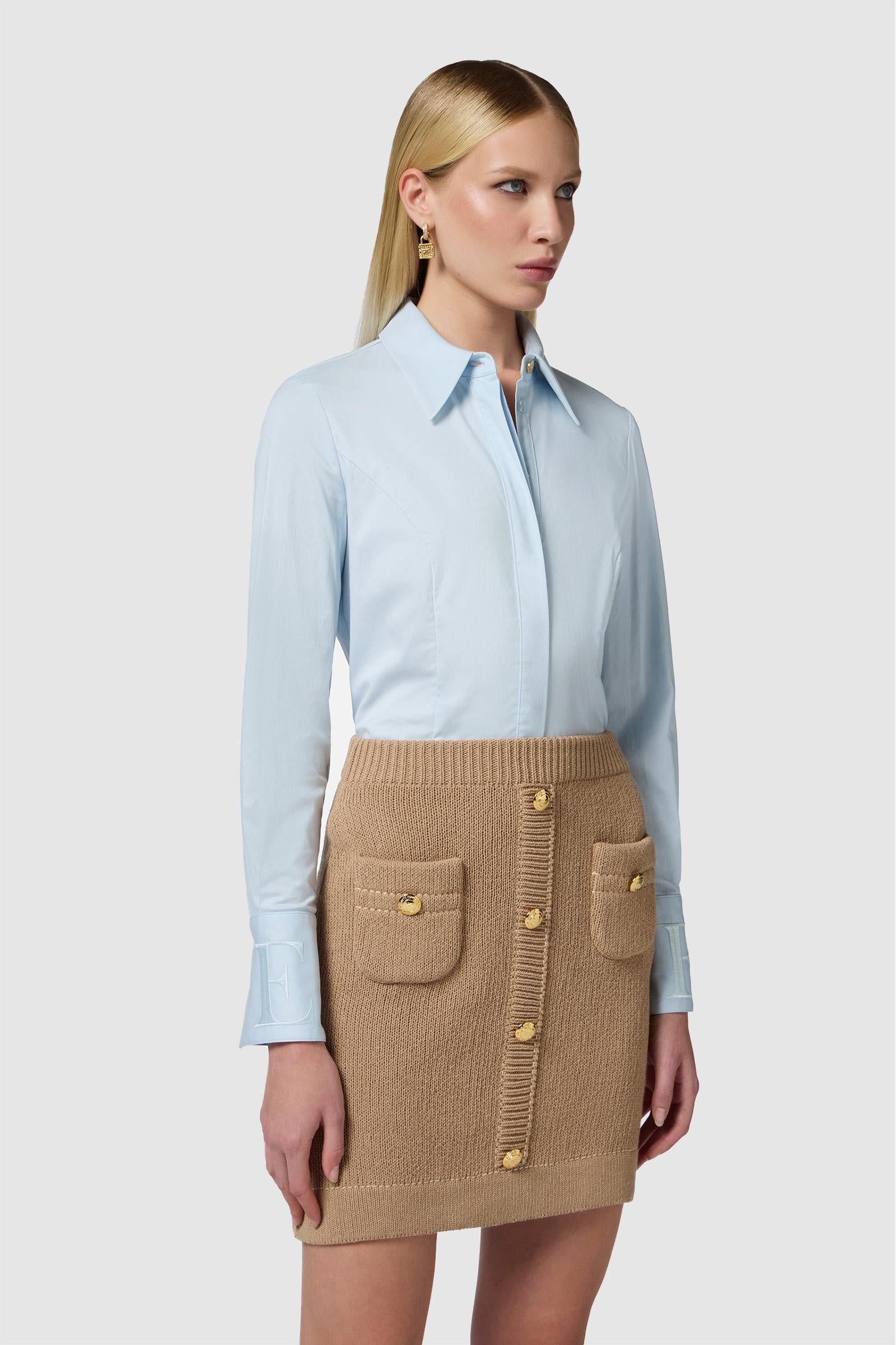 Camicia in misto cotone con maniche lunghe e colletto regolare. Si distingue per i polsi con logo che regalano una nota grafica al capo. Una nota di luce è data dai bottoni in metallo dorato che decorano collo e polsi. Vestibilità slim.Bottoni in metallo dorato con logo
