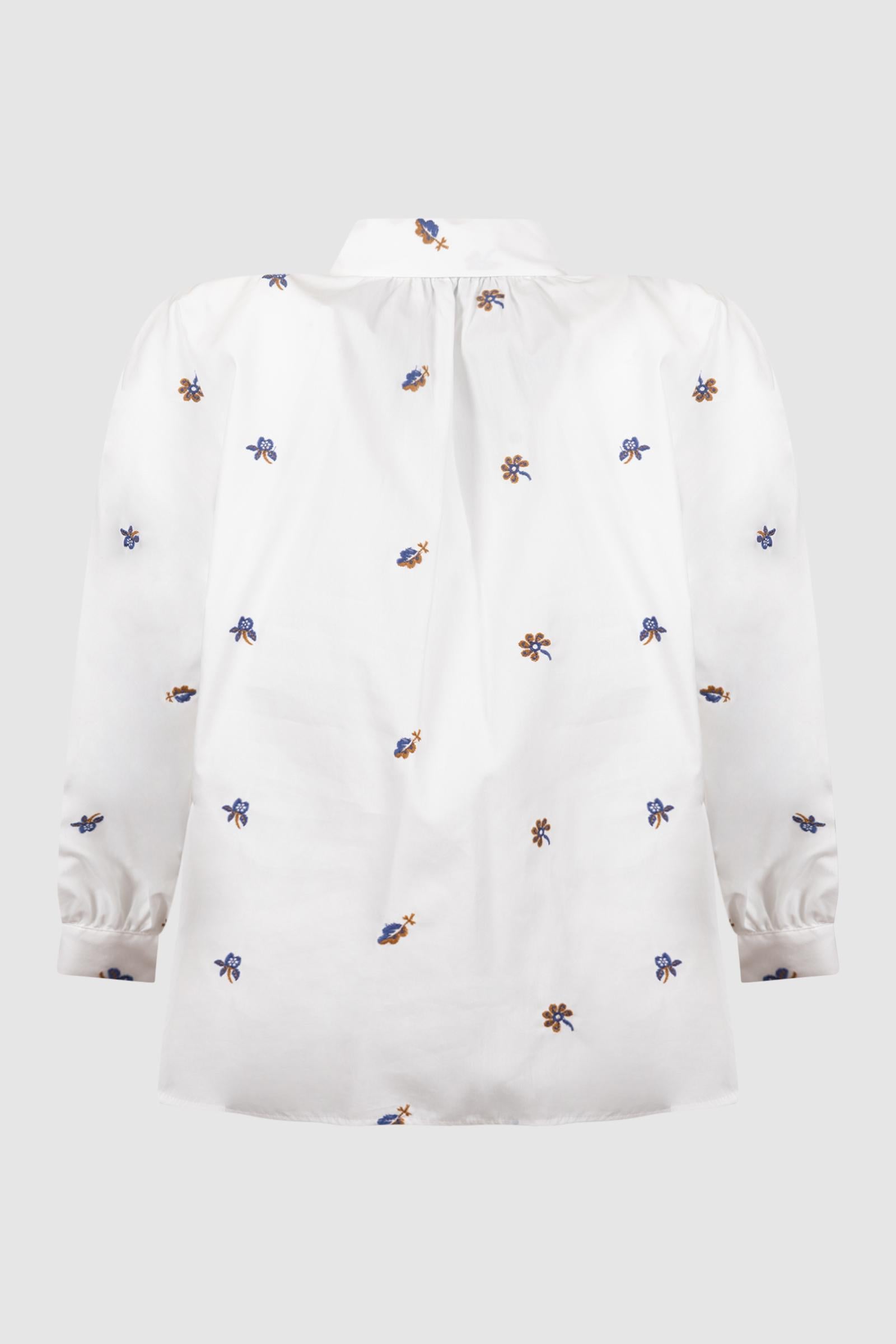 Camicia con maniche a sbuffo, rifinita da piccoli ricami all over e dettagli arricciati sul collo e fondo manica.