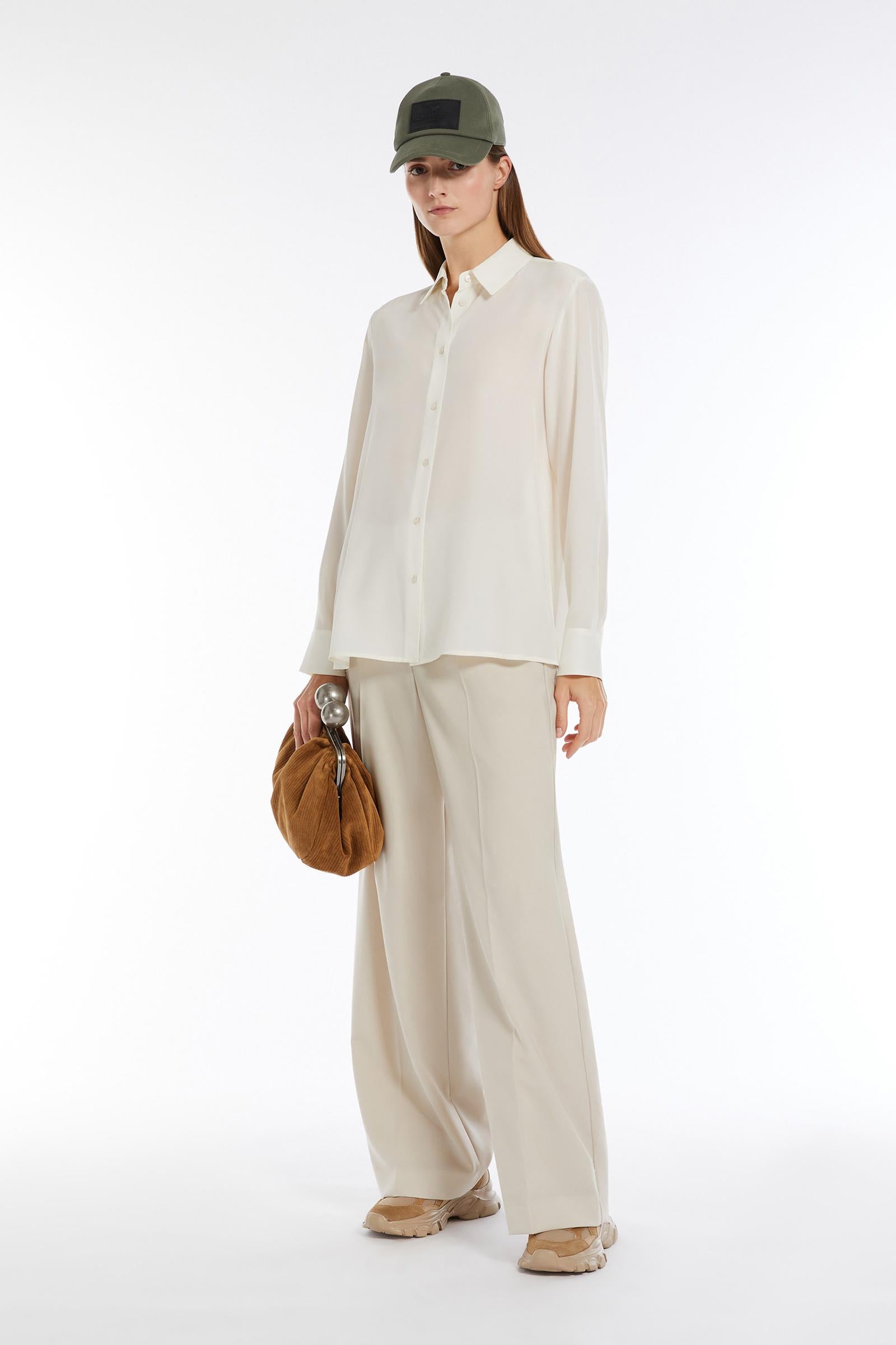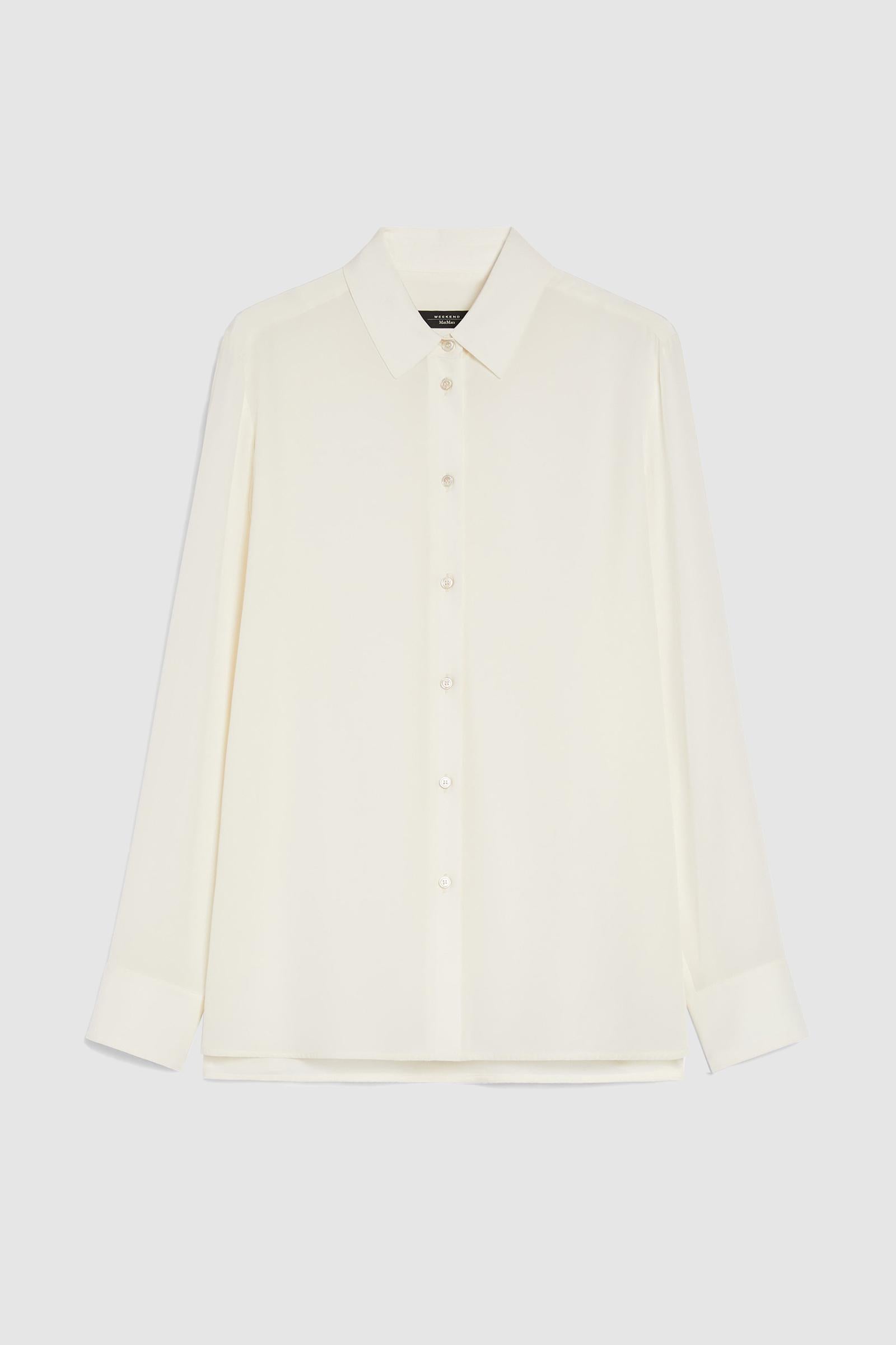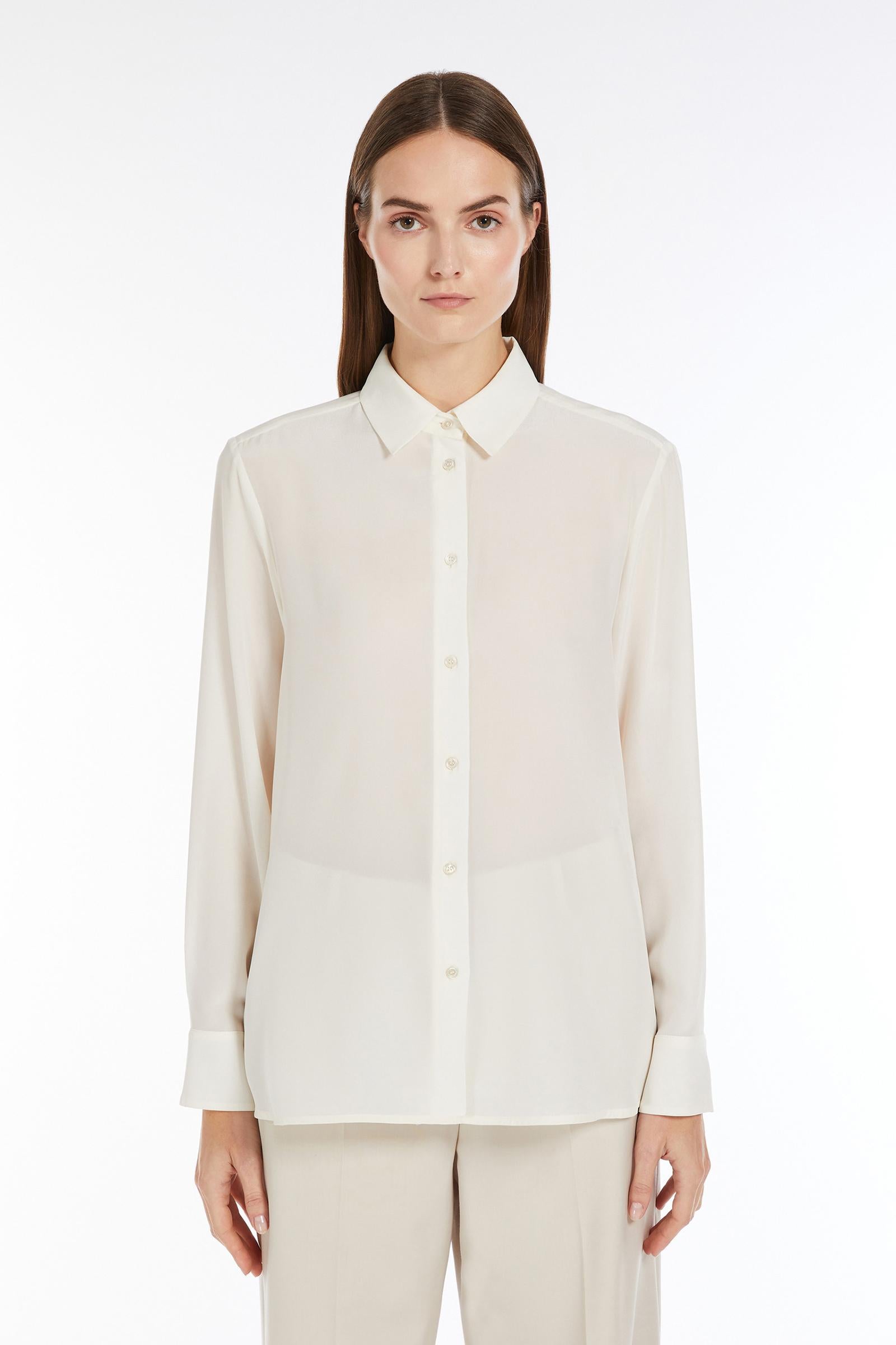 Camicia dalla linea morbida in prezioso tessuto di pura seta, caratterizzata da una silhouette leggermente svasata al fondo, colletto classico e maniche lunghe a giro con polsino e bottone. Rifinita con fondo stondato, carré sul retro e piega centrale sulla schiena. Chiusura frontale con bottoni a vista. Composizione: 100% seta.