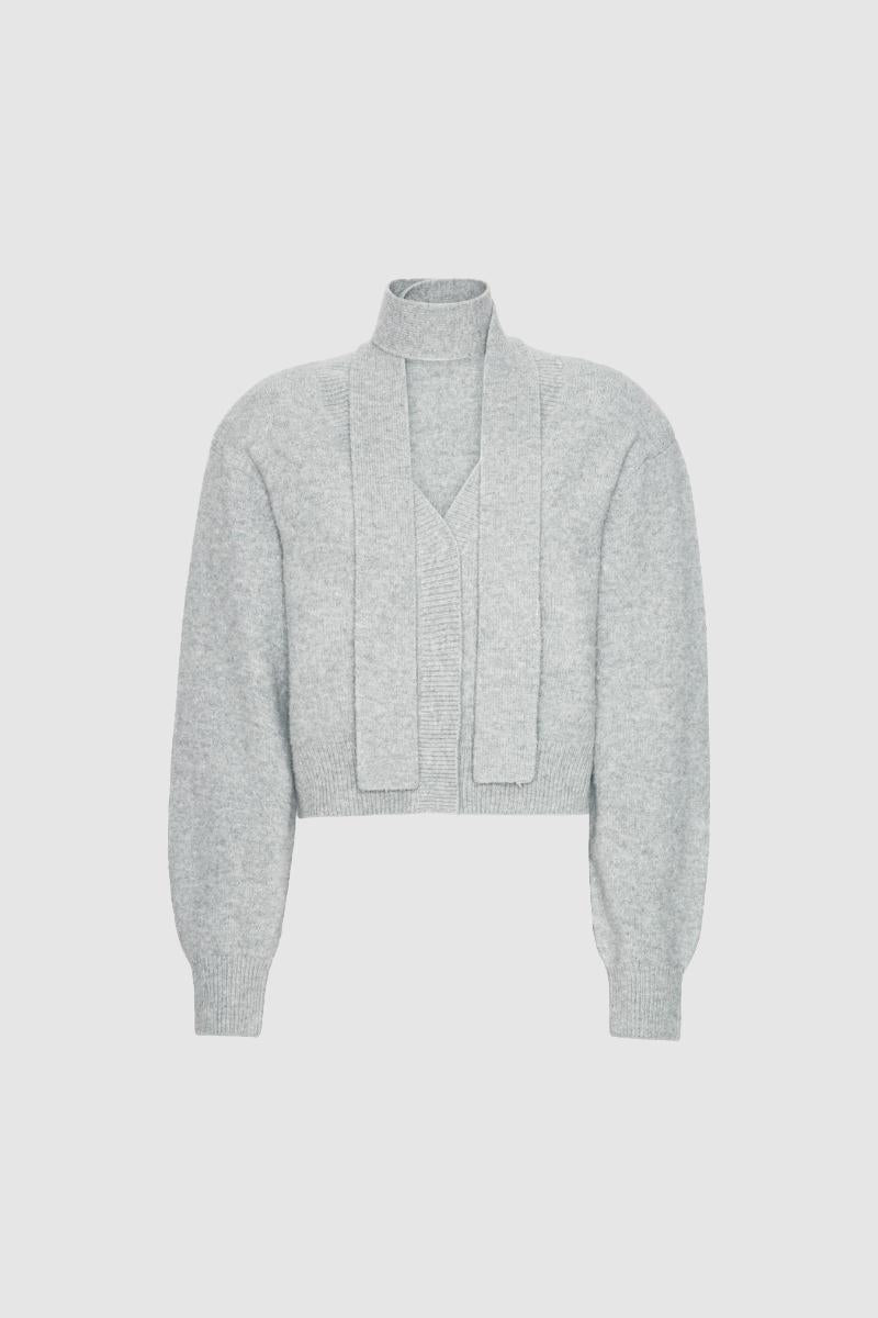 Il Cardigan con Sciarpa in Maglia Grigio Chiaro è un cardigan in maglia leggermente corto con profondo scollo a V, spalle larghe e sciarpa rimovibile abbinata. Realizzato in morbido misto lana e alpaca con orlo e polsini a coste.