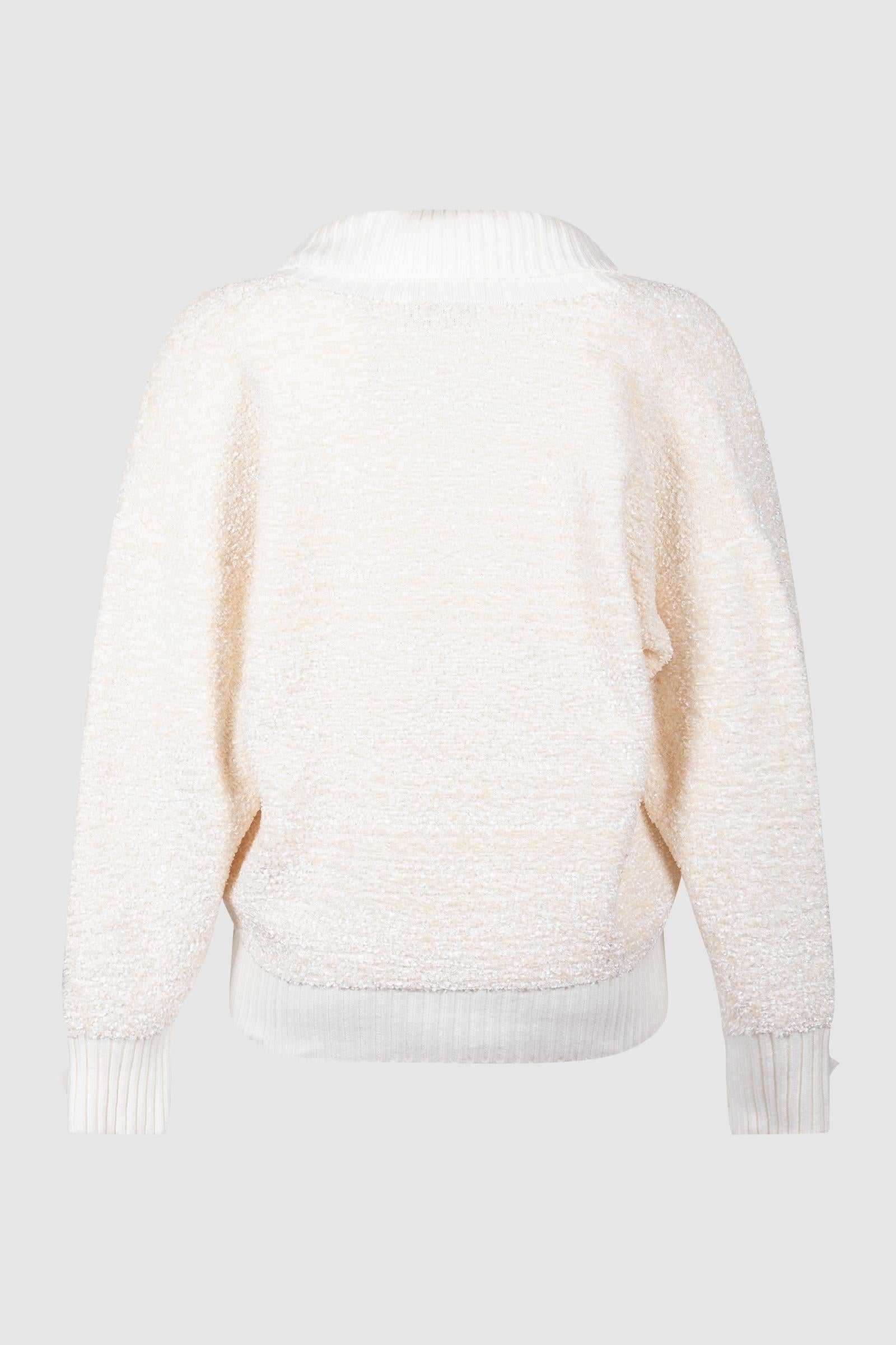 Raffinato e senza tempo, questo cardigan è il capo perfetto per aggiungere un tocco di classe ai tuoi look quotidiani. Realizzato in un morbido tessuto lavorato effetto bouclé, offre comfort e stile in ogni occasione.