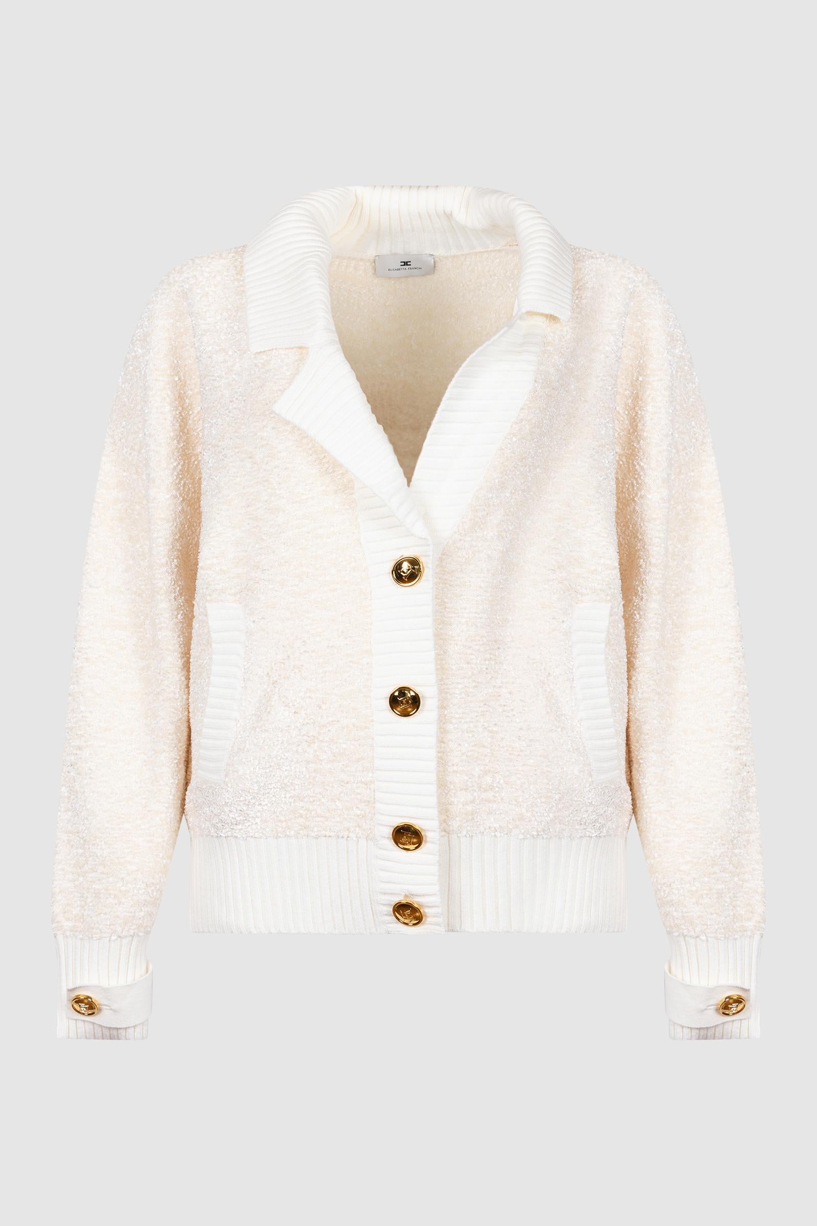 Il design è arricchito da dettagli in maglia a coste su collo, polsini e fondo, che conferiscono struttura e carattere al modello. I bottoni dorati a contrasto, posizionati sia sul davanti che sui polsini, donano un'eleganza sofisticata e luminosa, trasformando un capo casual in un vero must-have.