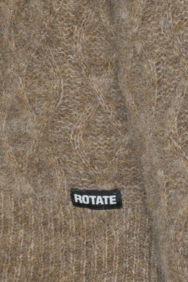 Il cardigan in maglia soffice marrone presenta una silhouette corta con profonda scollatura a V e chiusura frontale con bottoni. Il capo presenta una texture a trecce a rombi e presenta maniche lunghe con polsini e orlo a coste. Una piccola etichetta ROTATE è posizionata sul lato sinistro sopra la cintura.