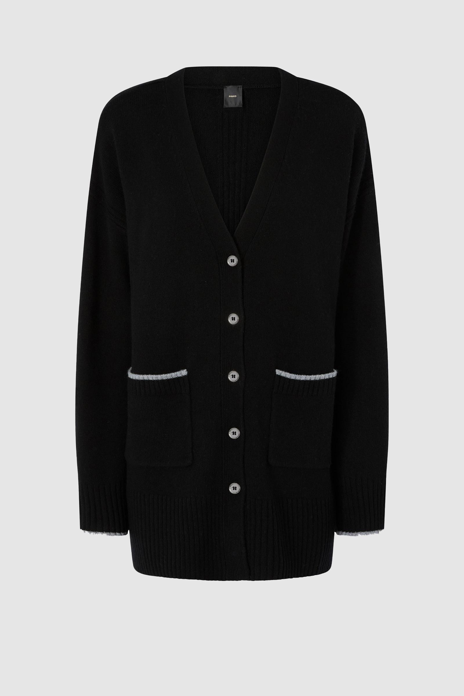 Cardigan lungo con scollo a V e spalle scese, realizzato in soffice misto lana merino e cashmere, il tessuto ideale per le giornate all'insegna del relax. Il filato a contrasto mette in risalto le tasche e gli orli delle maniche in modo discreto e raffinato. Il capo è stato sottoposto a prove di finissaggio per ridurre al minimo la possibile formazione di pilling, garantendo una maggiore morbidezza e durabilità del tessuto. Orlo e polsini sono lavorati a coste, mentre il tocco finale è dato dall'etichetta tono su tono con logo lettering PINKO dietro al collo.Filato Esterno: LANA 90% CASHMERE 10%
