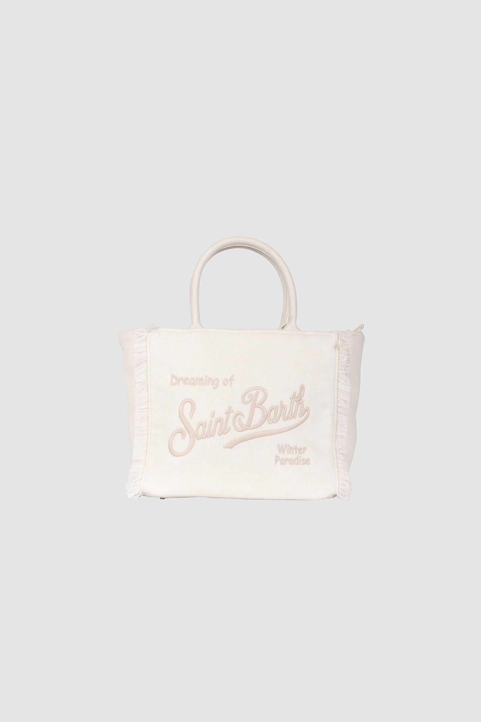 Elegante e raffinata, la borsa "Dreaming of Saint Barth - Winter Paradise" firmata MC2 Saint Barth è un must-have per la stagione invernale. Realizzata in morbido tessuto effetto lana, si distingue per il design sofisticato con logo ricamato tono su tono e dettagli con frange laterali. Dotata di doppi manici e tracolla regolabile e removibile, unisce stile e praticità per accompagnarti in ogni occasione.