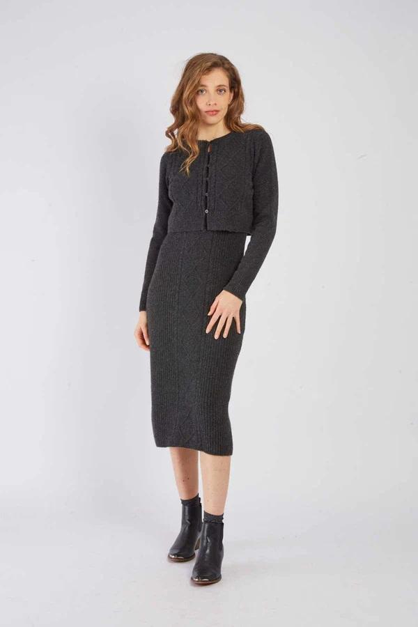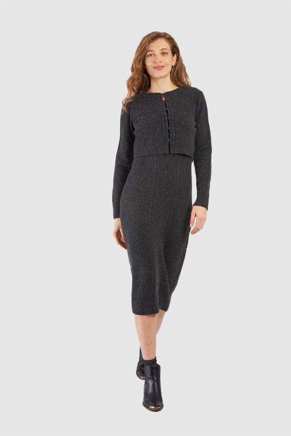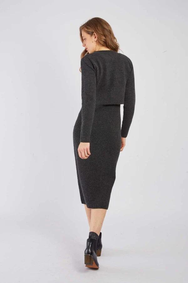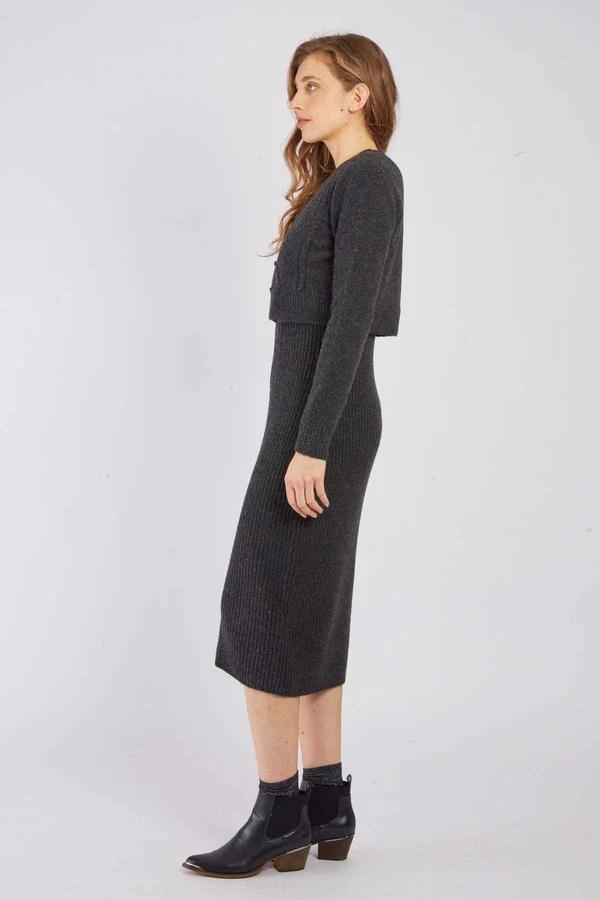 Questo completo in maglia tinta unita unisce eleganza e comfort. È composto da un abito midi aderente con spalline e da un cardigan abbinato a maniche lunghe con chiusura frontale a bottoni. La sua maglia morbida ed elasticizzata lo rende ideale per la mezza stagione o l'inverno. Indossali insieme o separatamente per creare diversi look.