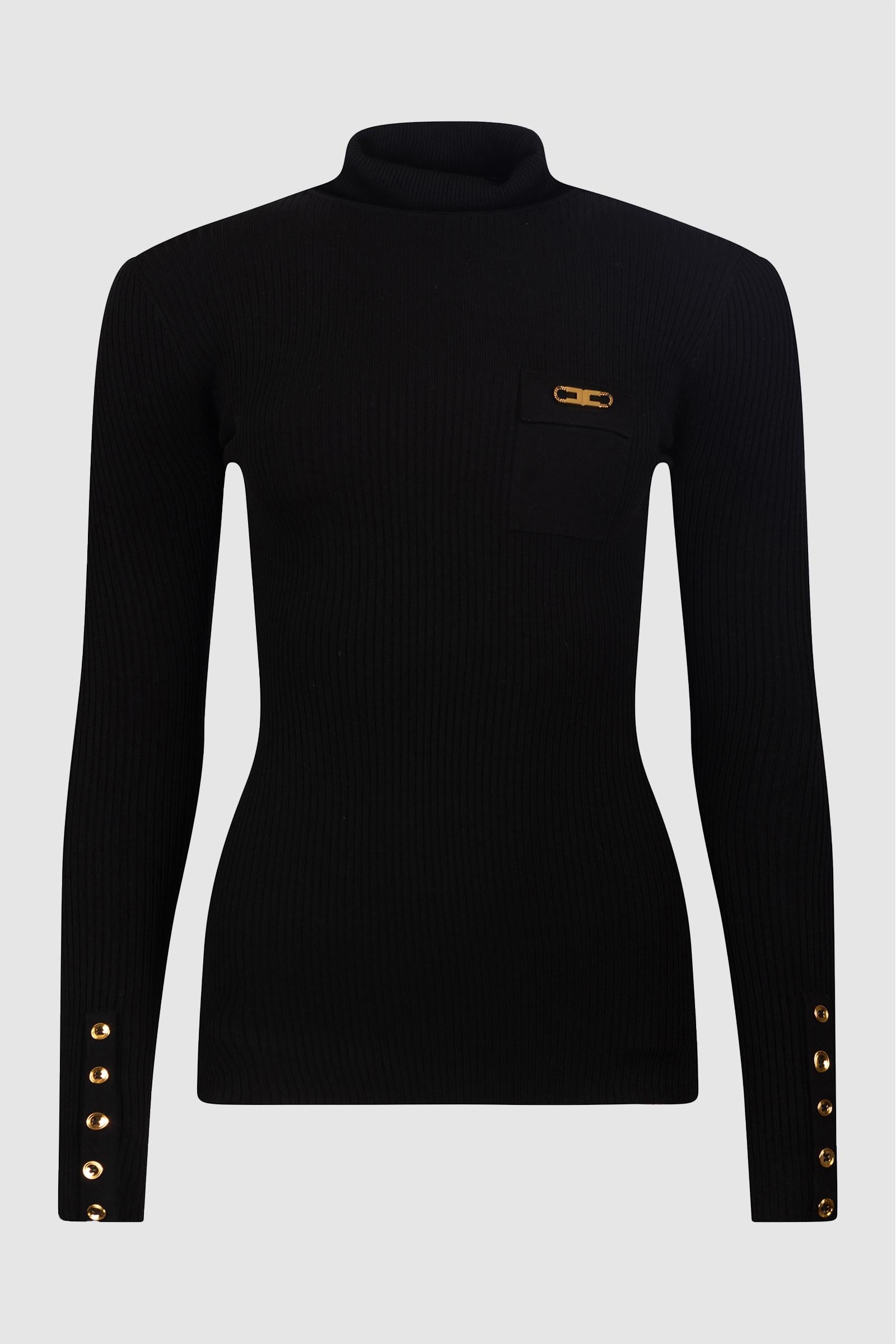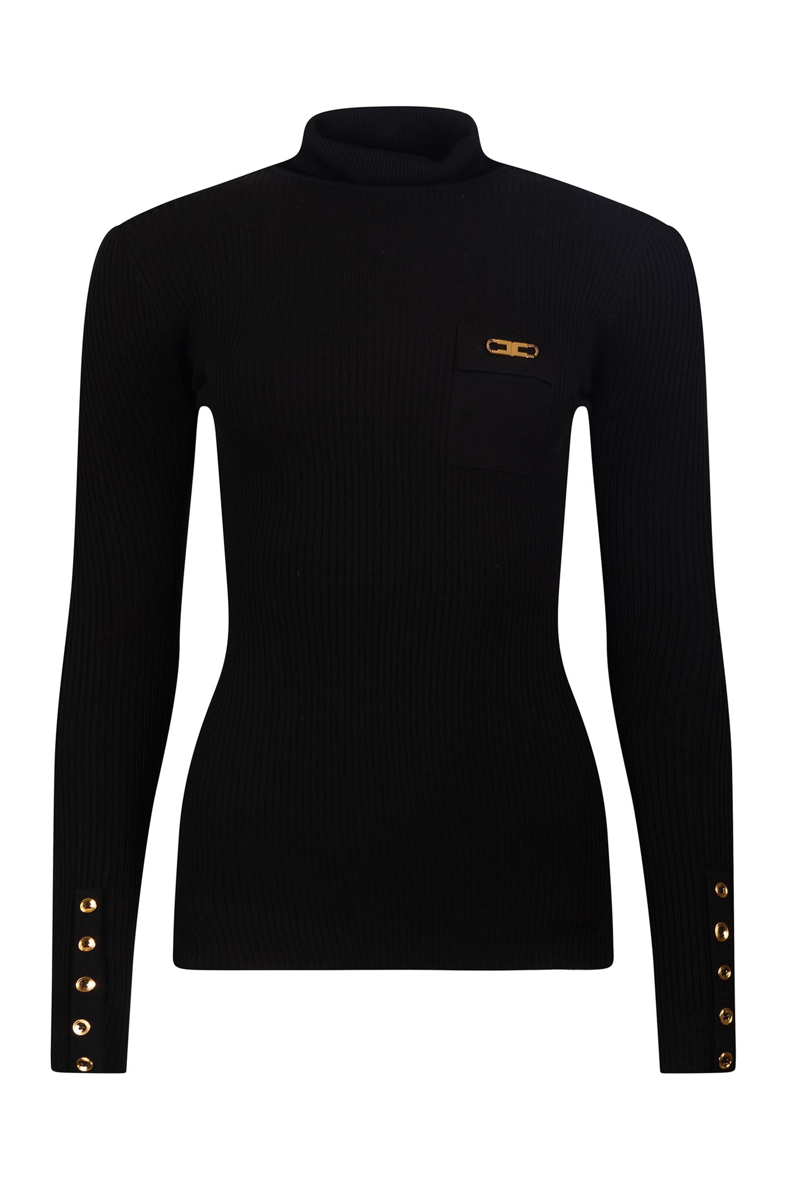 Un capo elegante e raffinato che unisce minimalismo e dettagli preziosi. Questo dolcevita firmato Elisabetta Franchi è realizzato in maglia a costine elasticizzata che valorizza la silhouette, garantendo al tempo stesso comfort e femminilità.