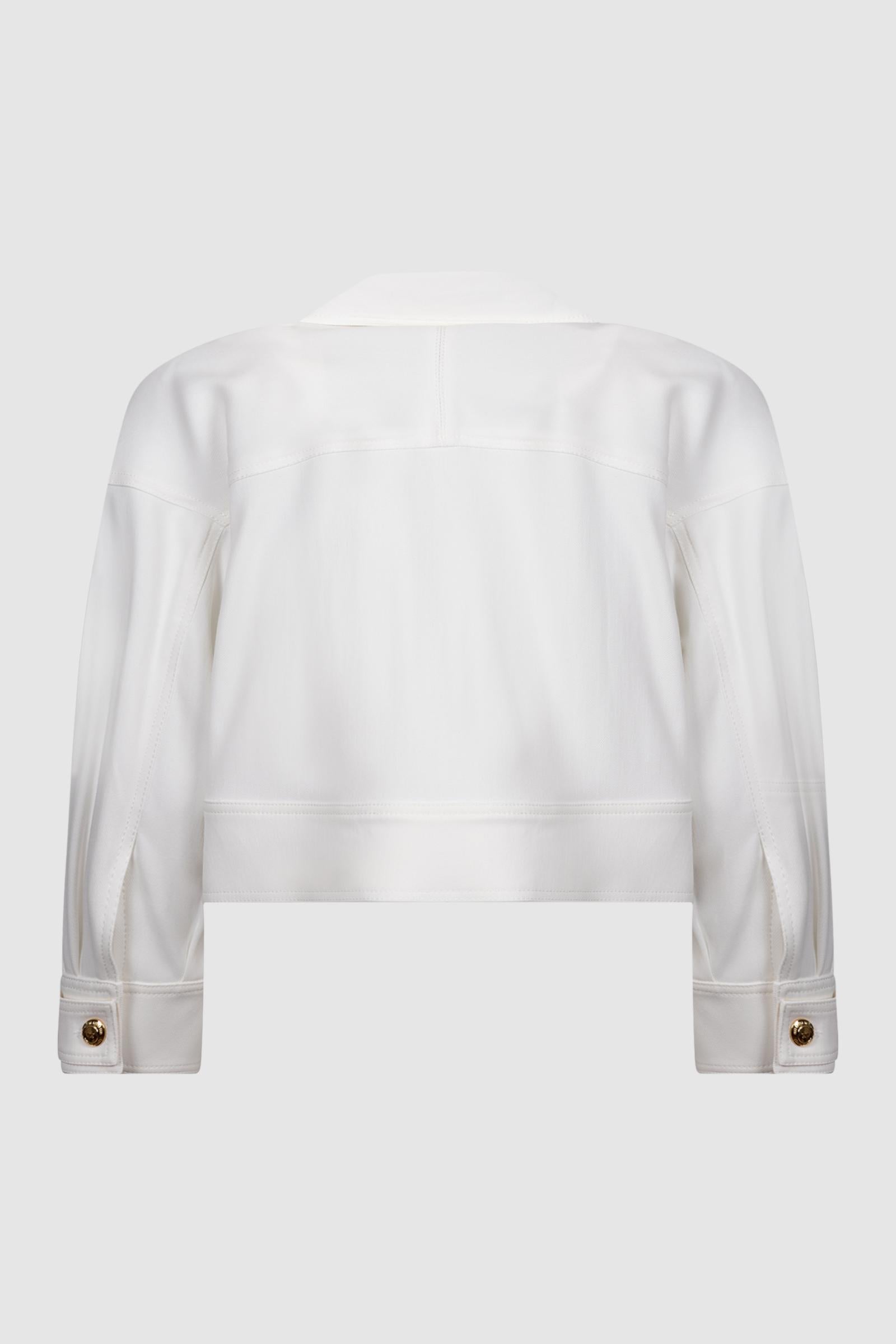 Caban in gabardina dalla vestibilità over. La giacca ha doppio colletto e maniche ¾ con alamari. Dettagli definiti con le tasche ricamate con logo a filo e i luminosi bottoni in metallo dorato.Fodera in georgette