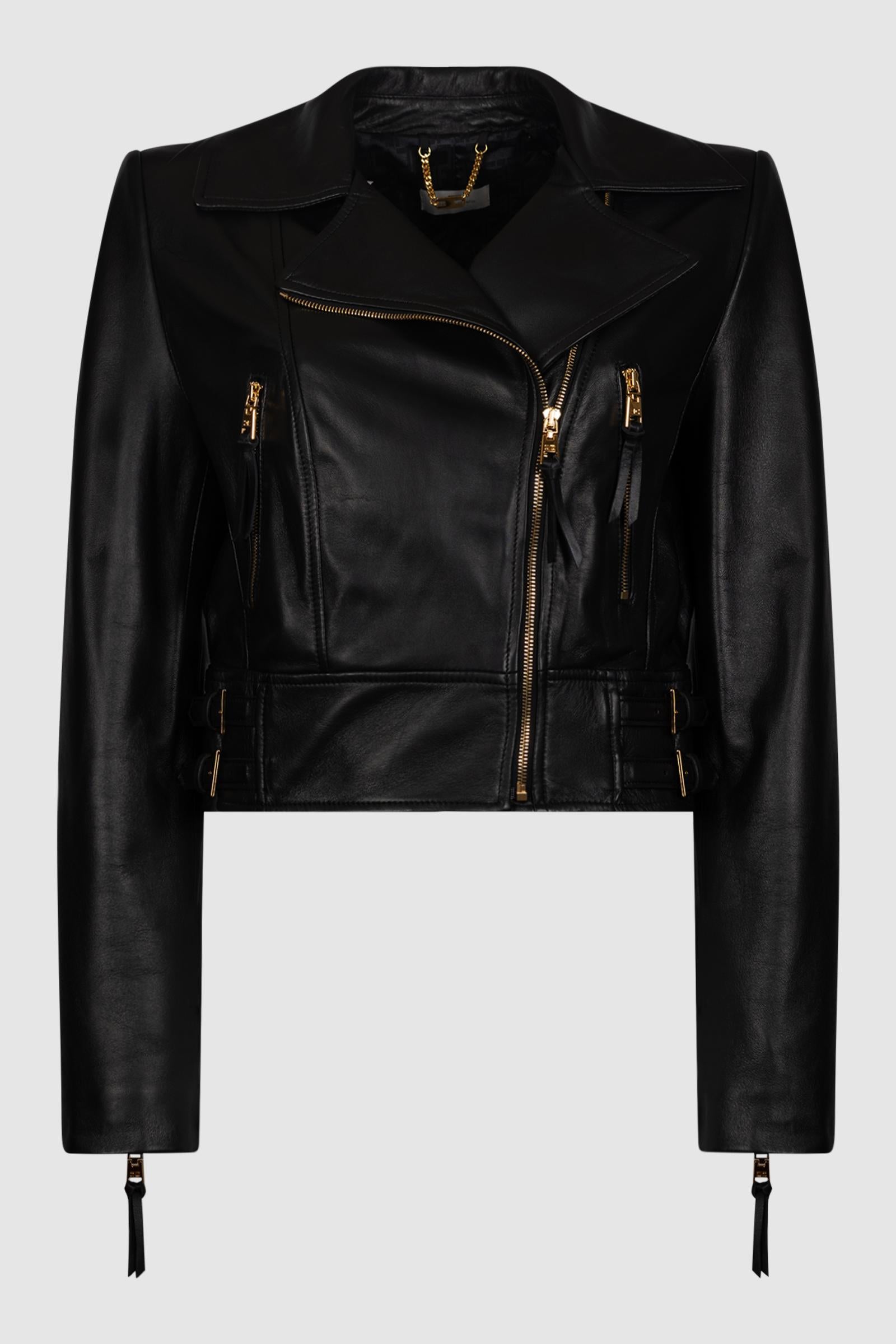 Chiodo in pelle dalla vestibilità regular. La giacca richiama i classici modelli biker con rever, tasche e chiusura asimmetrica con zip. Reinterpretata per l'eleganza contemporanea con spalle strutturate, ha fascione in vita con cinturini sul davanti e logo embossed ottenuto con tecnica a rilievo sul retro. Le anelle in metallo dorato aggiungono note luminose.Spalline imbottite
