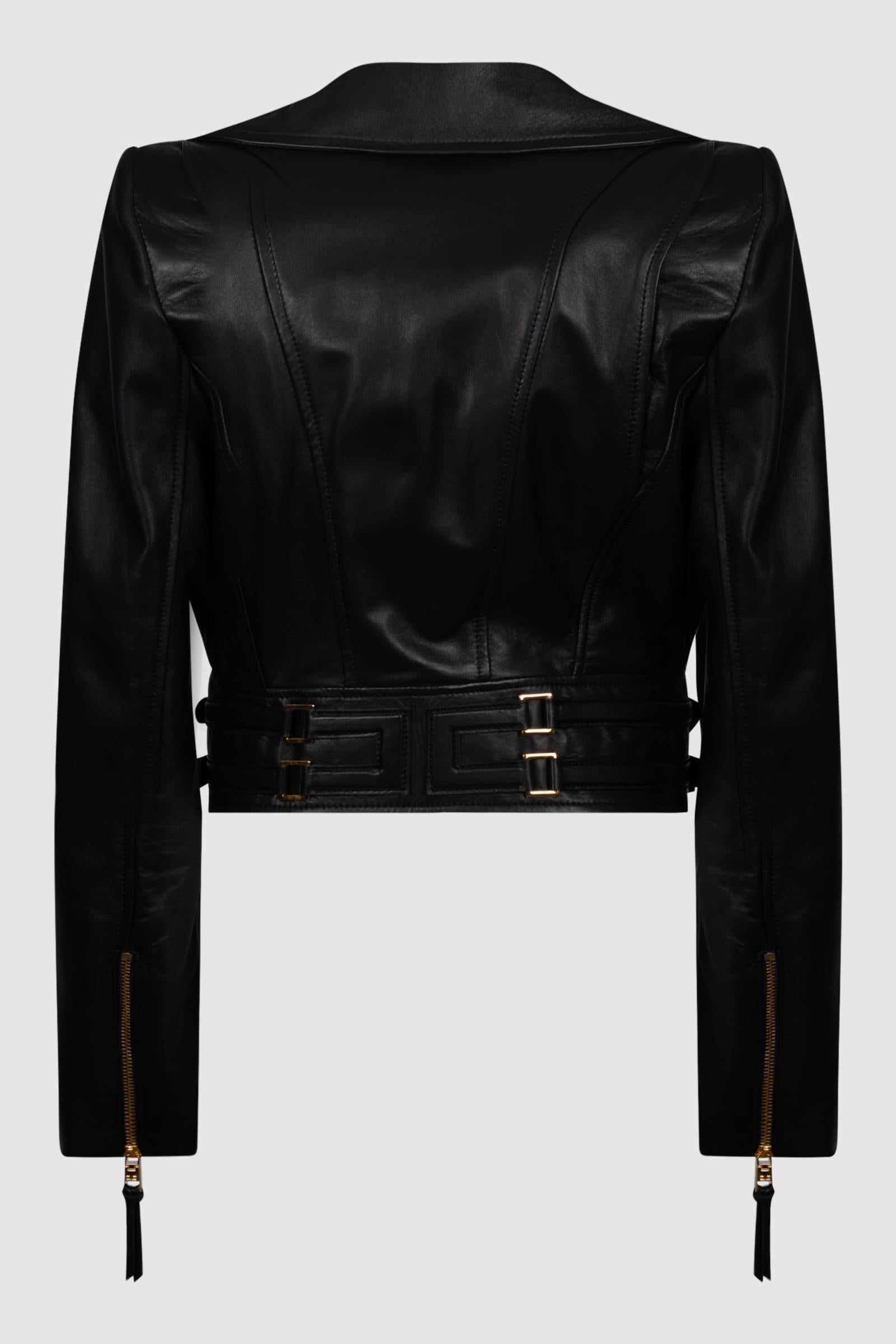 Chiodo in pelle dalla vestibilità regular. La giacca richiama i classici modelli biker con rever, tasche e chiusura asimmetrica con zip. Reinterpretata per l'eleganza contemporanea con spalle strutturate, ha fascione in vita con cinturini sul davanti e logo embossed ottenuto con tecnica a rilievo sul retro. Le anelle in metallo dorato aggiungono note luminose.Spalline imbottite