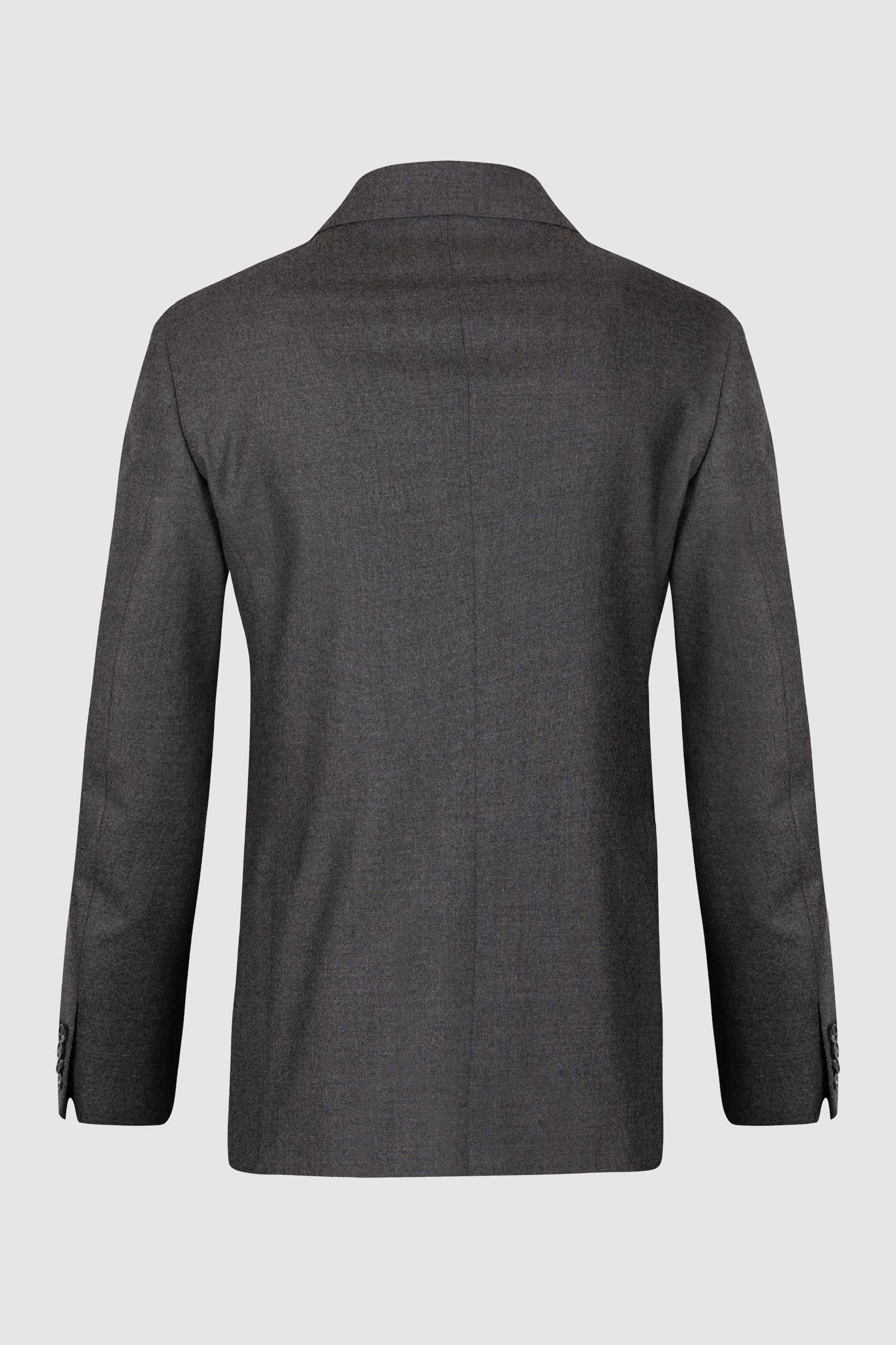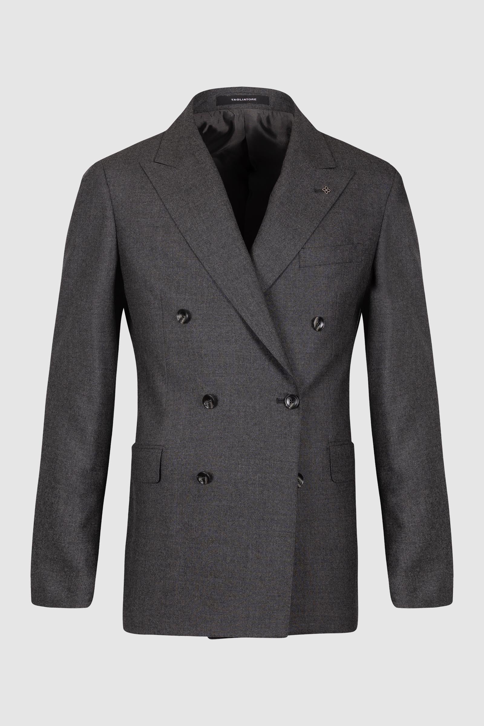 Modello doppiopetto a sei bottoni con chiusura a due, tipico della tradizione sartoriale italiana.