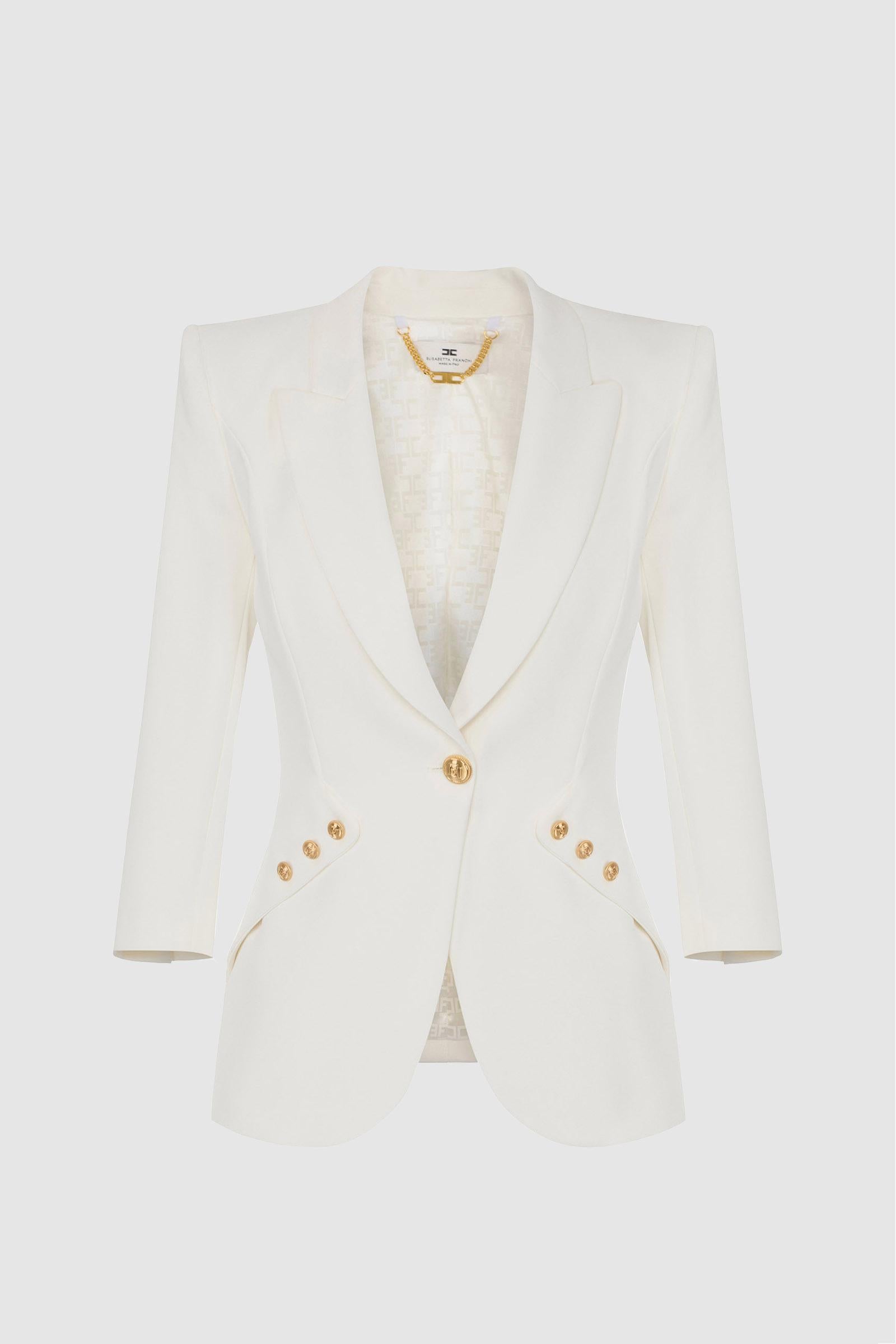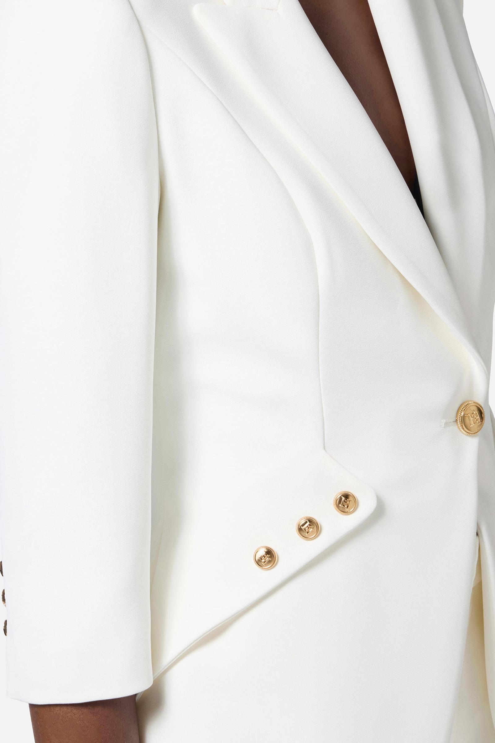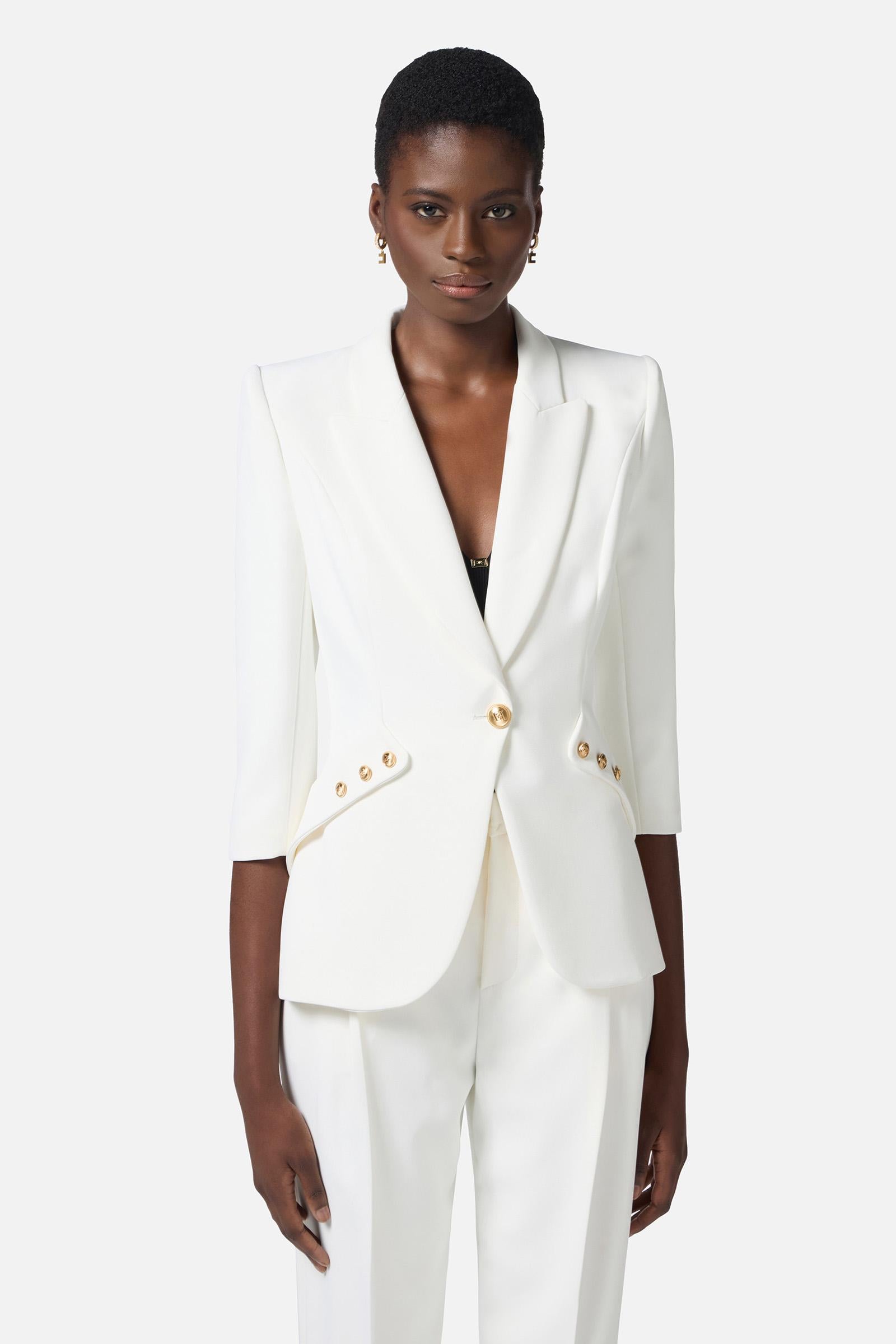 Giacca in doppio crêpe leggero. Il blazer ha rever a lancia e spalle strutturate che regalano una silhouette affilata insieme alle patte applicate in diagonale. La chiusura doppiopetto è illuminata dai bottoni in metallo dorato con logo. Vestibilità regular.Composizione:95%Poliestere 05%Elastane
