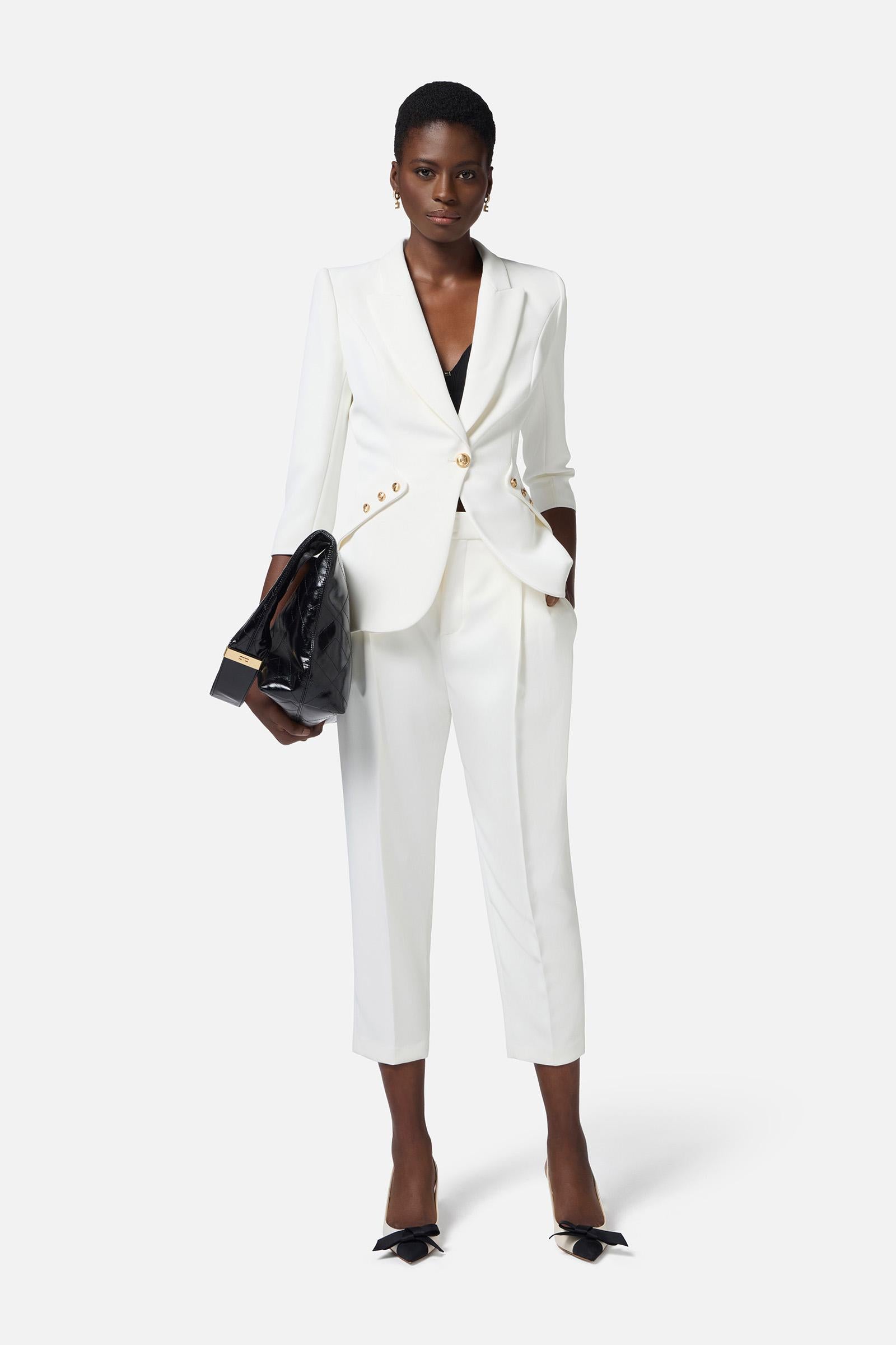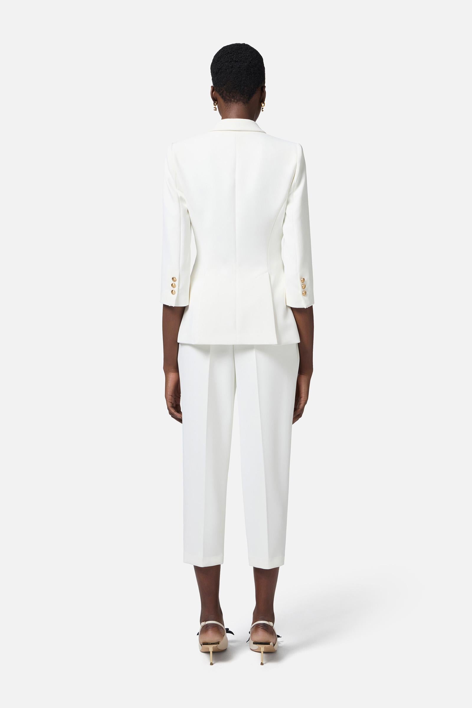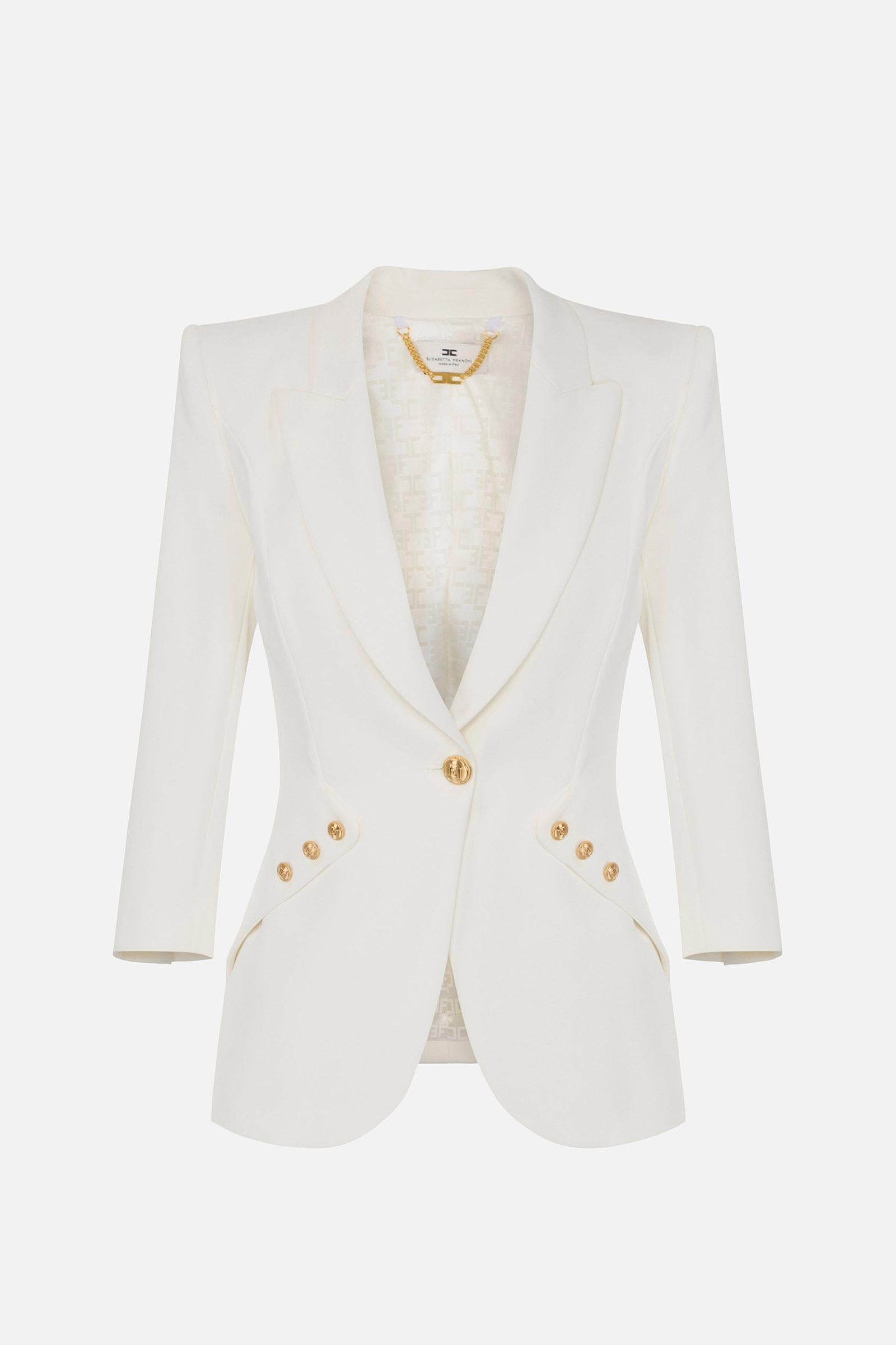 Giacca in doppio crêpe leggero. Il blazer ha rever a lancia e spalle strutturate che regalano una silhouette affilata insieme alle patte applicate in diagonale. La chiusura doppiopetto è illuminata dai bottoni in metallo dorato con logo. Vestibilità regular.Composizione:95%Poliestere 05%Elastane