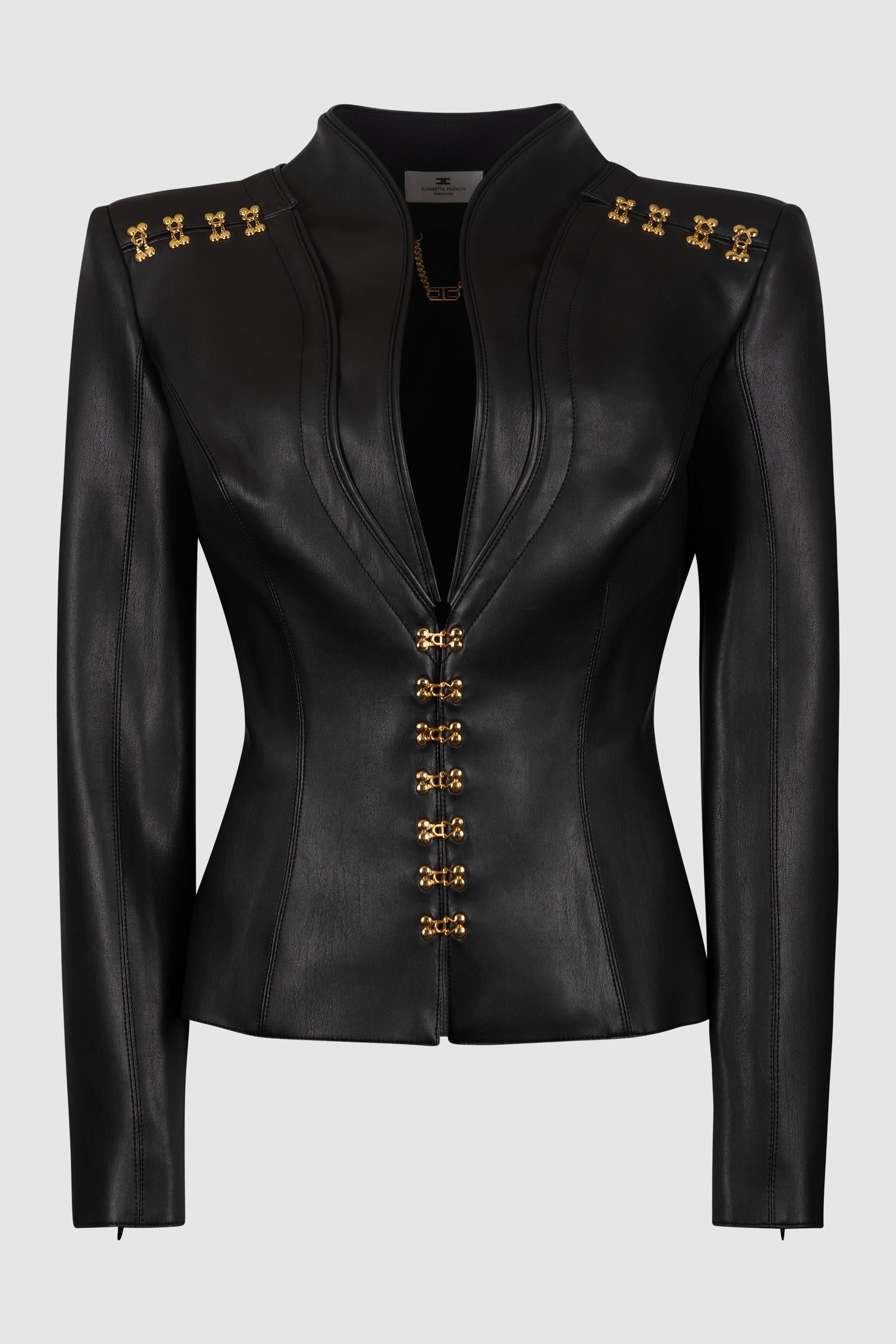Realizzata in pelle pregiata con chiusura frontale a ganci dorati e decori metallici sulle spalle, scolpisce la silhouette con un taglio strutturato e iper-femminile.