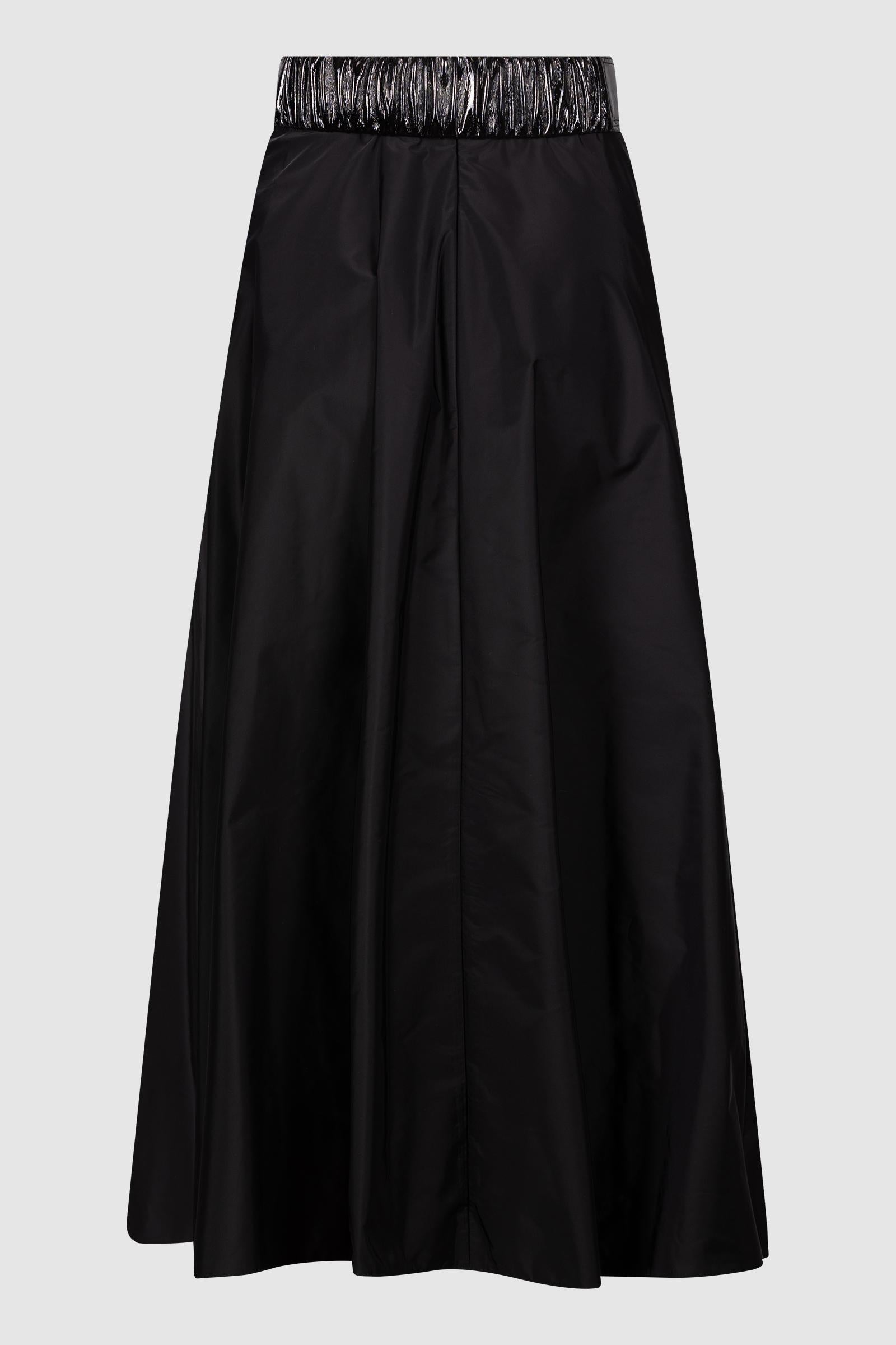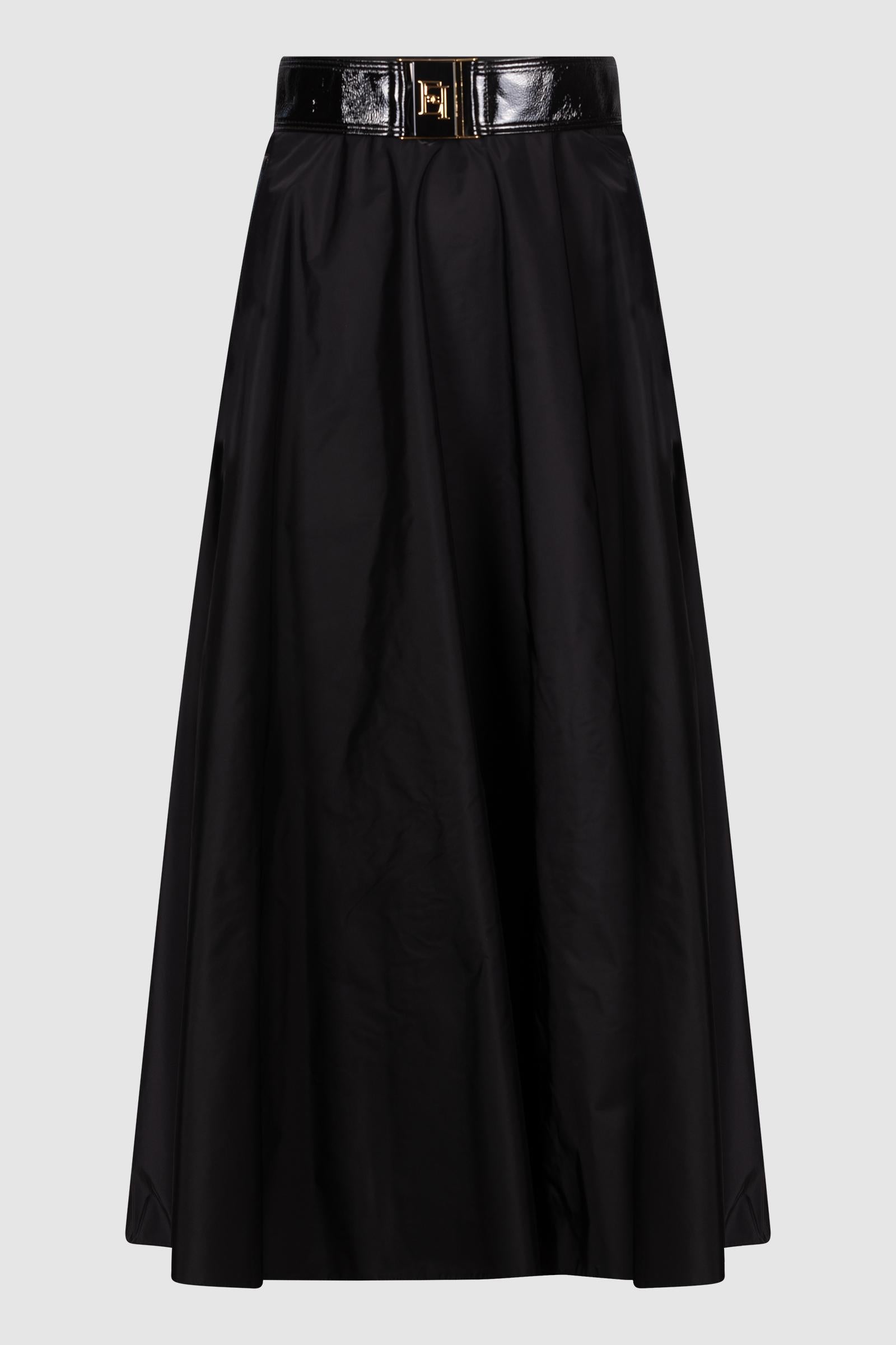 Gonna Elisabetta Franchi realizzata in tessuto tecnico leggero con linea svasata e fluida. Il punto vita è valorizzato da una cintura in vernice lucida con fibbia logata in metallo dorato, che aggiunge un tocco elegante e sofisticato. Un capo femminile e versatile, perfetto per look da sera o occasioni speciali.