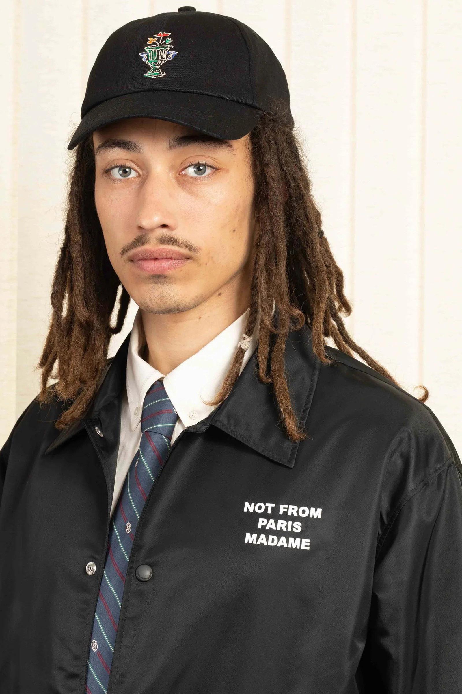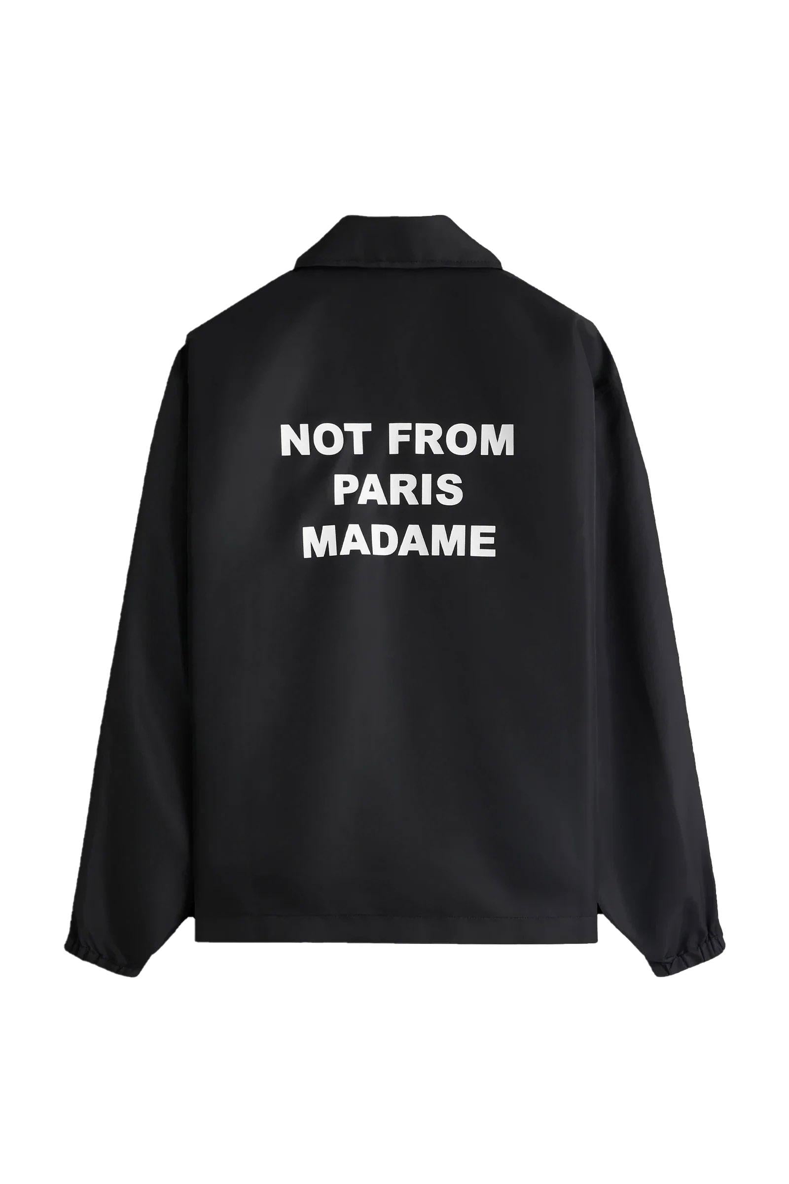 Un capo senza tempo. Questa giacca nera idrorepellente con polsini elasticizzati e bottoni automatici incisi è stampata con lo slogan "Not From Paris Madame" sul davanti e sul retro.