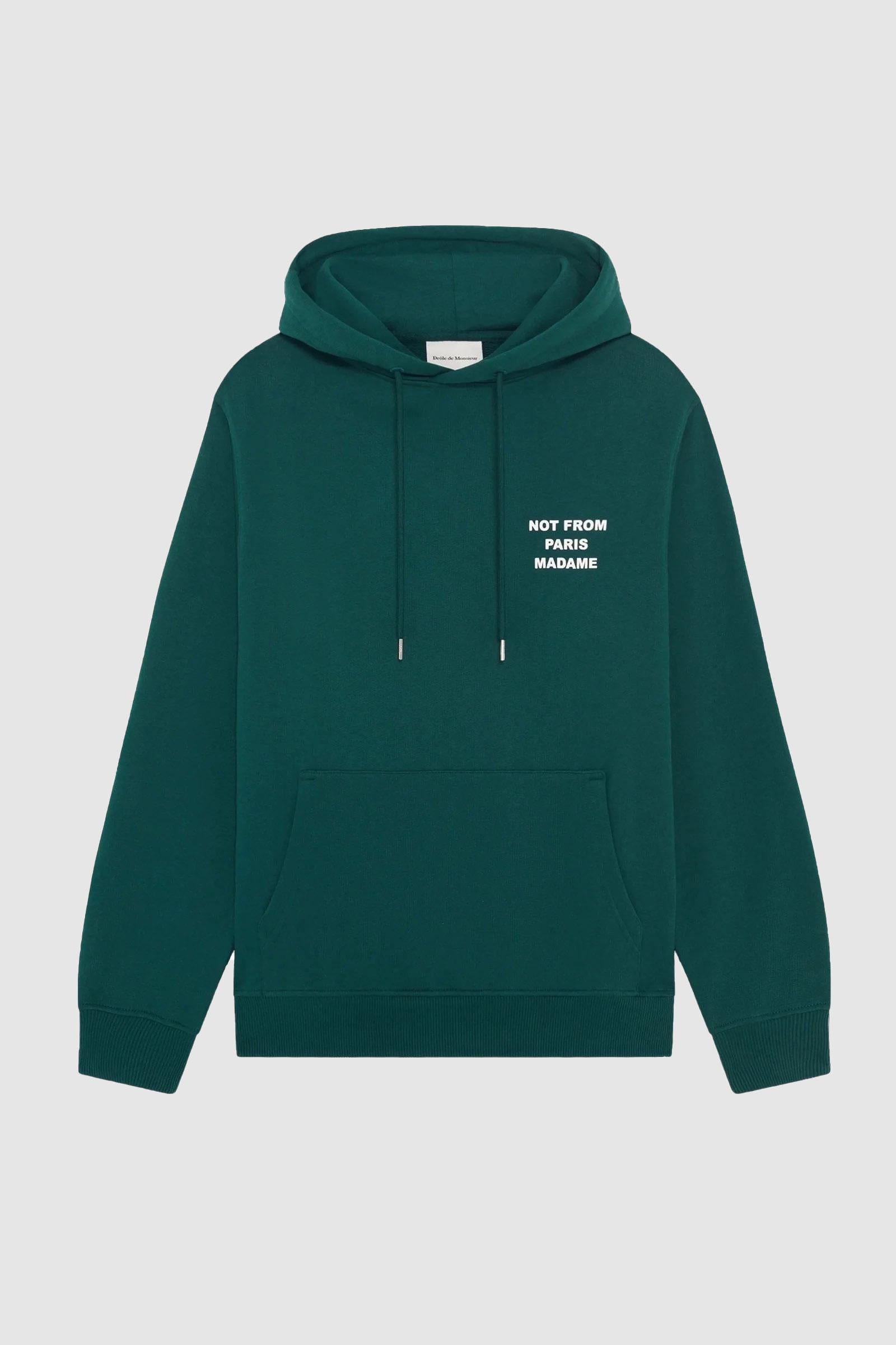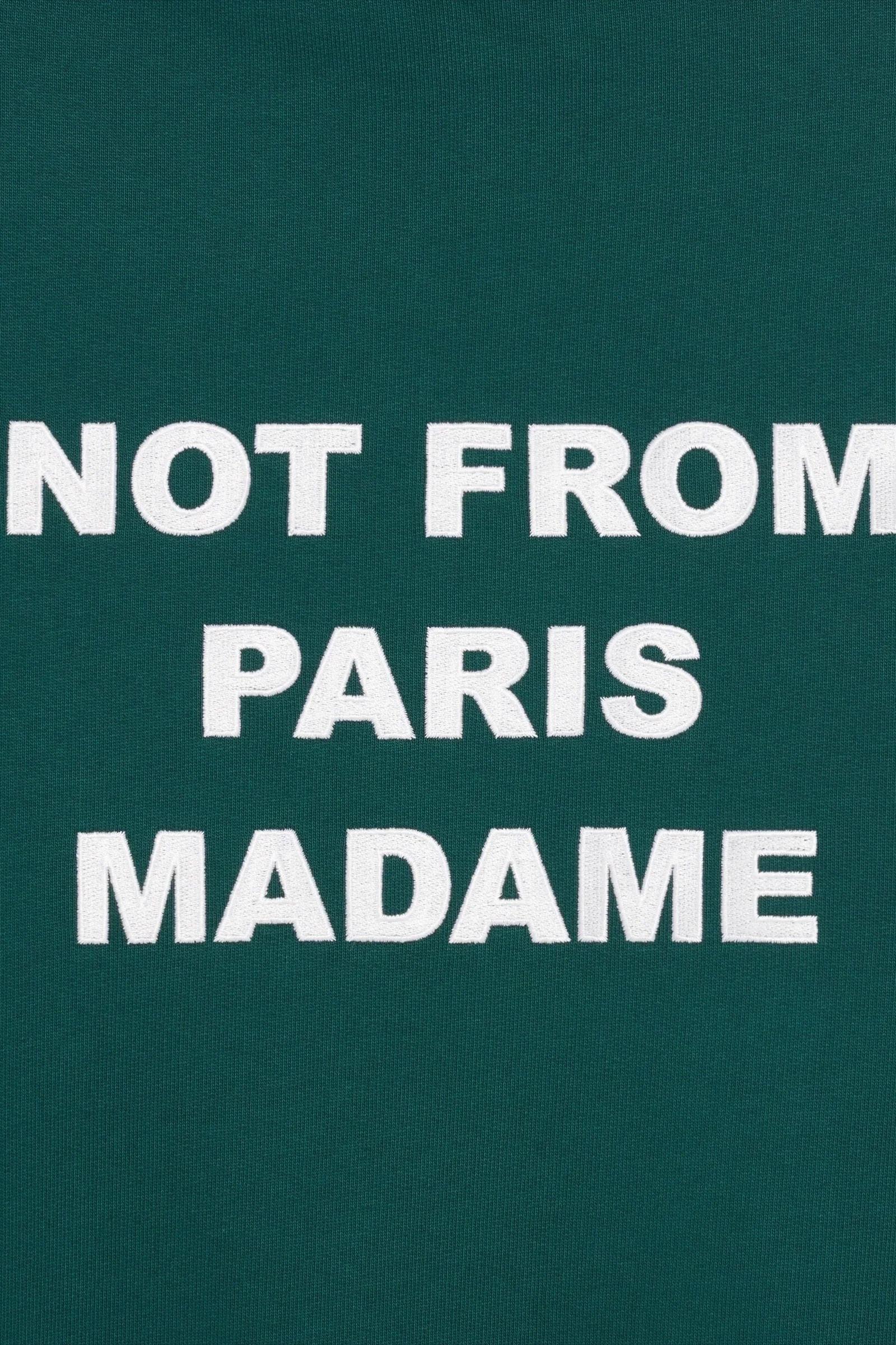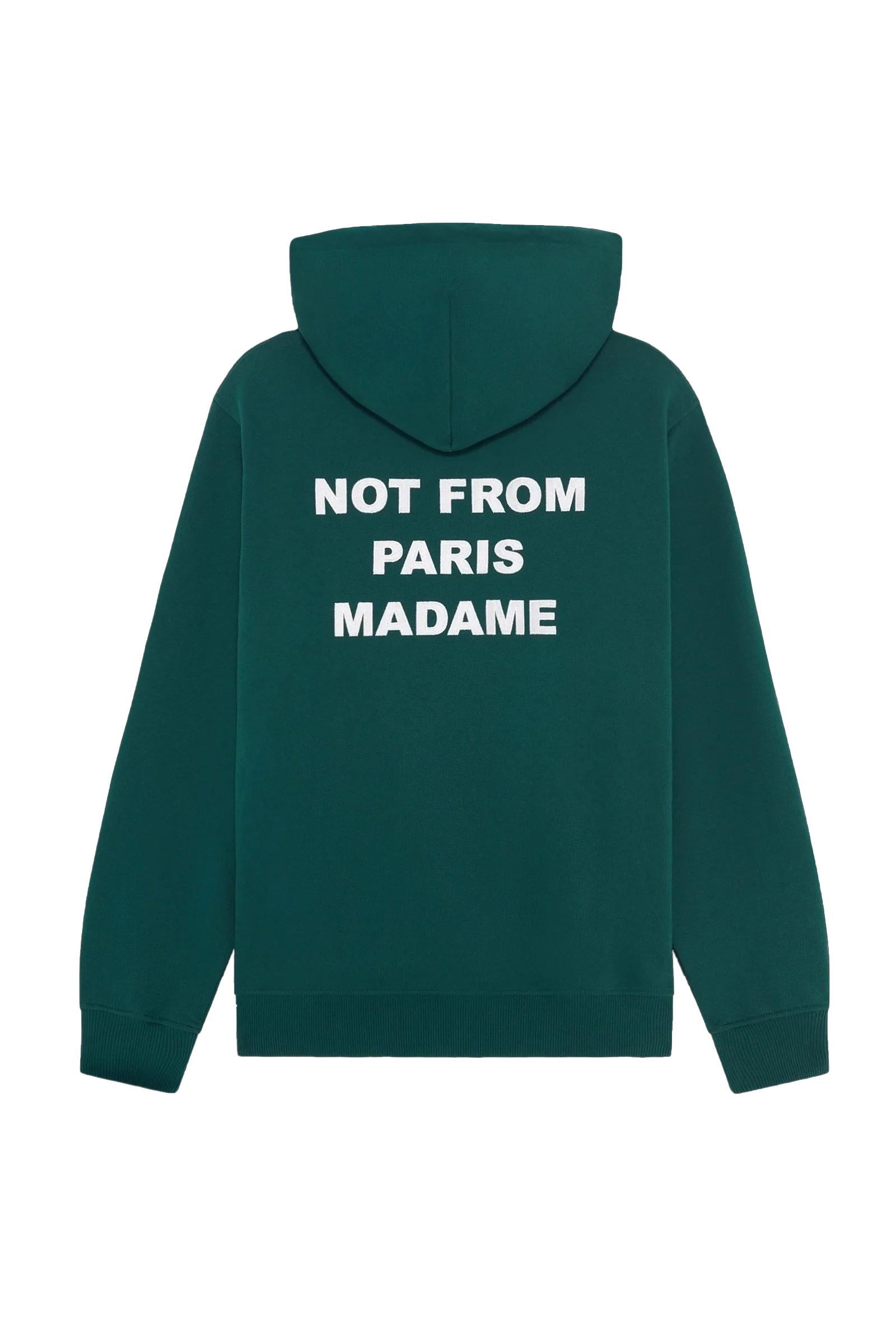 Questa felpa con cappuccio in spugna francese 100% cotone verde scuro con orlo e polsini a coste è stampata con lo slogan "Not From Paris Madame" sul davanti e ricamata sul retro.