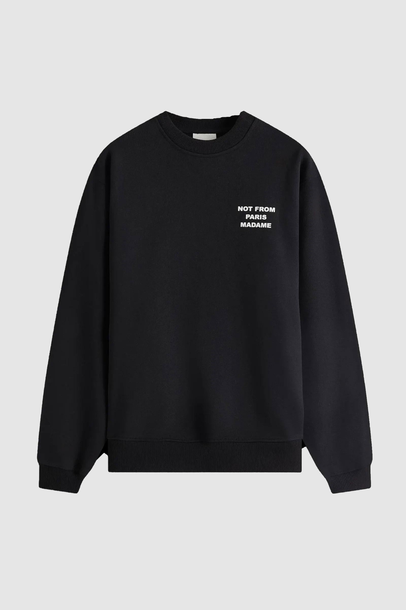 Questa felpa nera in 100% cotone French Terry con orlo e polsini a coste è stampata con lo slogan "Not from Paris Madame" sul davanti e ricamata sul retro.