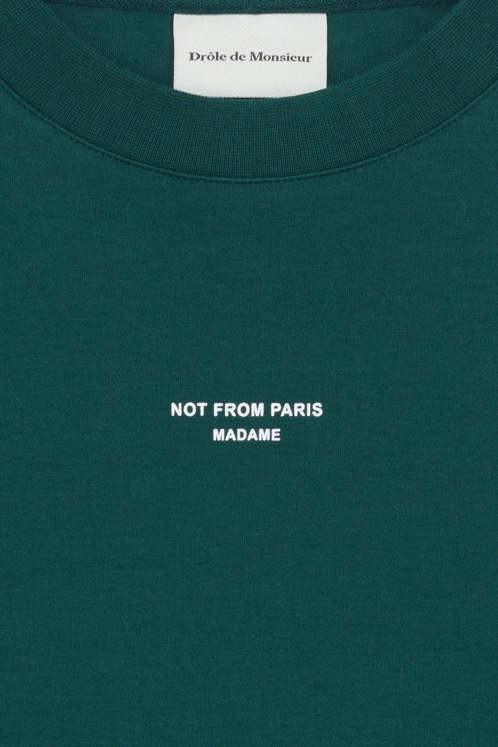 Questa t-shirt verde scuro in 100% cotone interlock con scollo a costine è stampata con lo slogan "Not from Paris Madame".