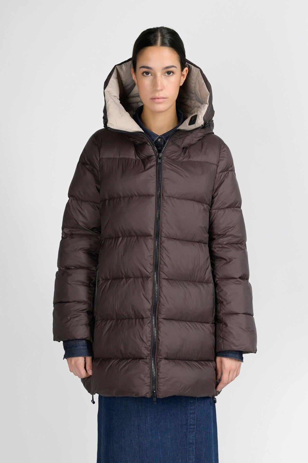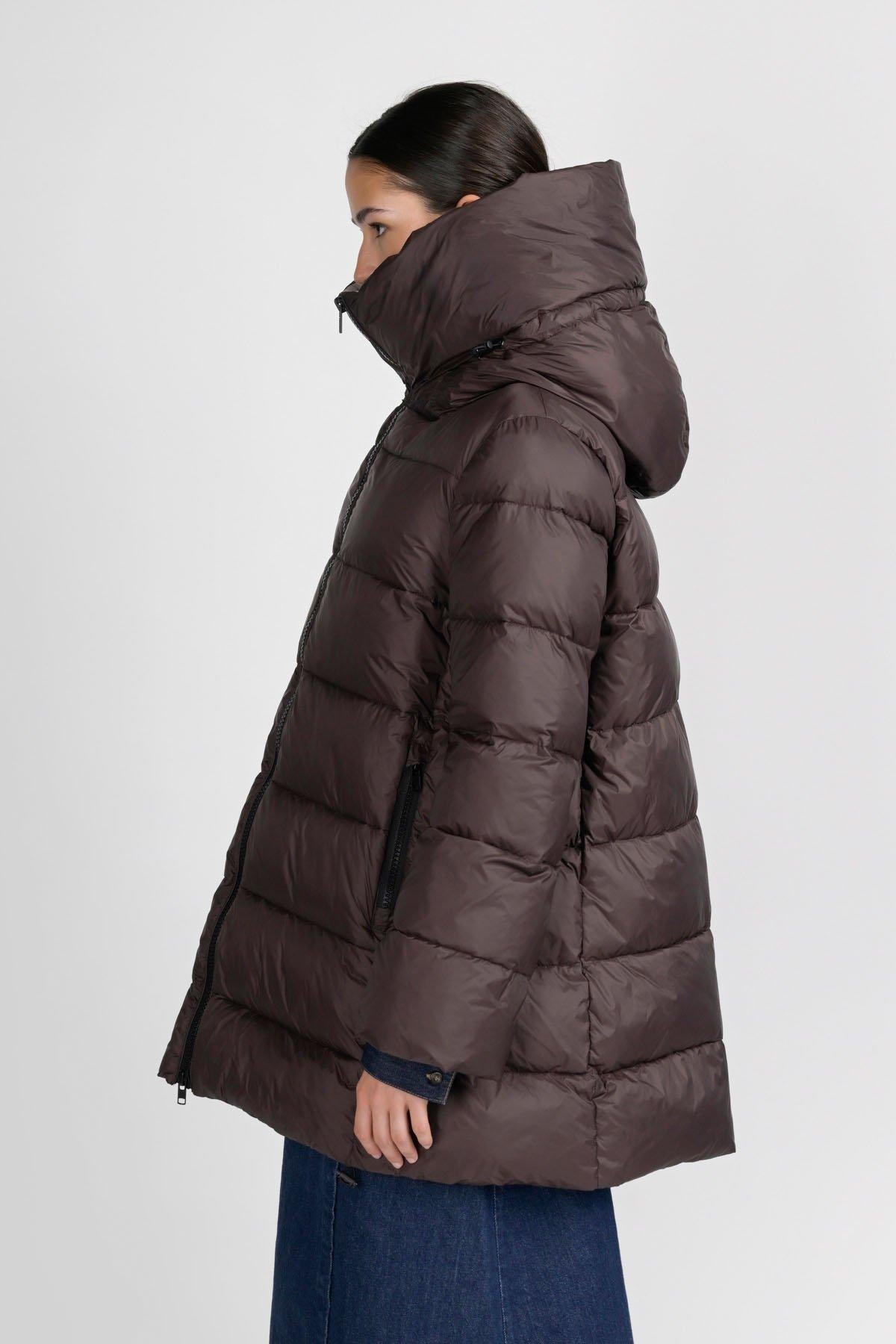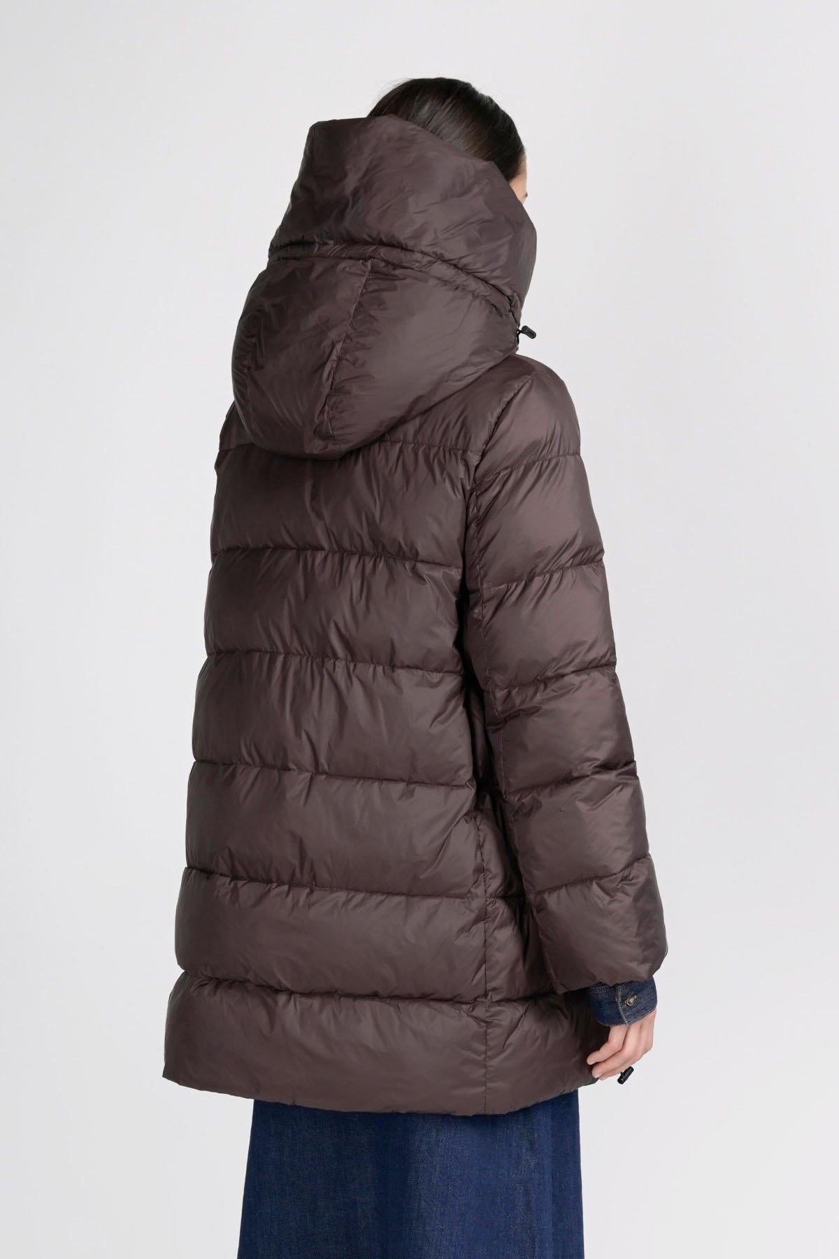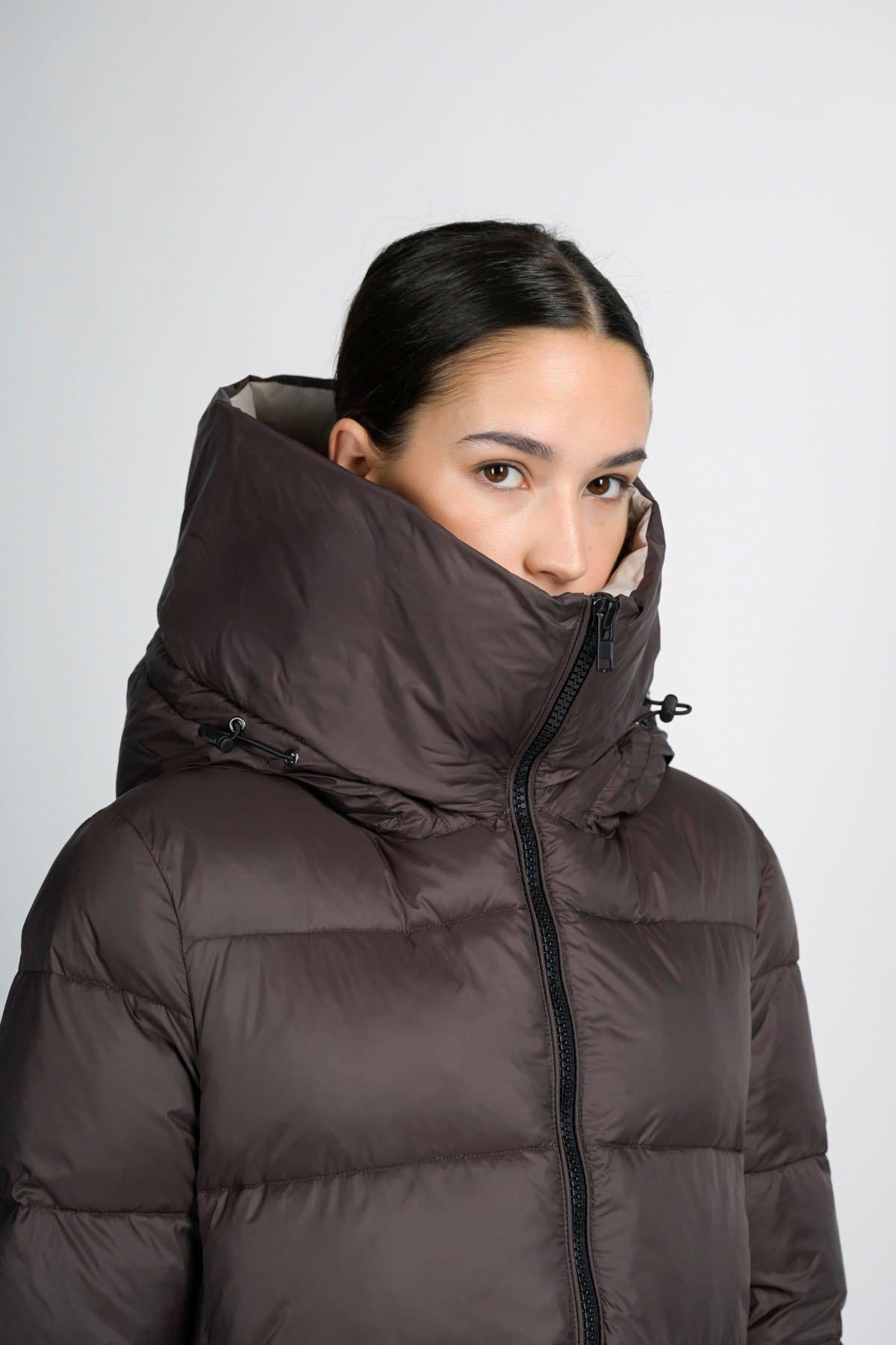Volete stare al caldo, senza rinunciare all'eleganza? Questo piumino imbottito lungo fa sicuramente al caso vostro. I materiali che lo compongono: nylon al 100% per l'esterno e una fibra sintetica proveniente da materiali riciclati per l'interno, lo rendono super leggero, ma anche super caldo. Il cappuccio integrato imbottito e una coulisse sul fondo permettono di chiuderlo completamente, lasciando all'esterno vento e freddo. Perfetto per i weekend in montagna, abbinato ad outfit e accessori eleganti, non vi farà sfigurare nelle occasioni più formali.