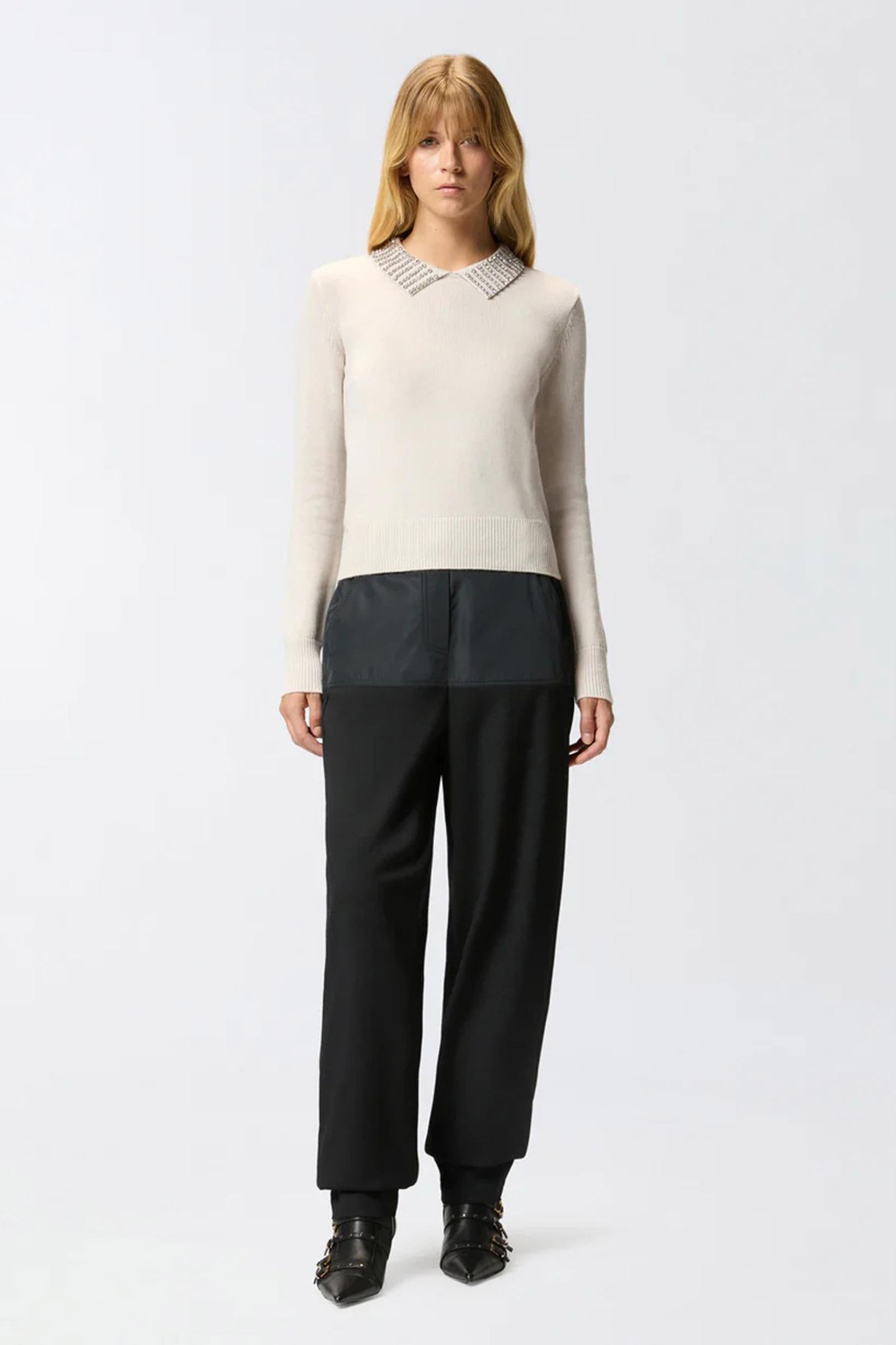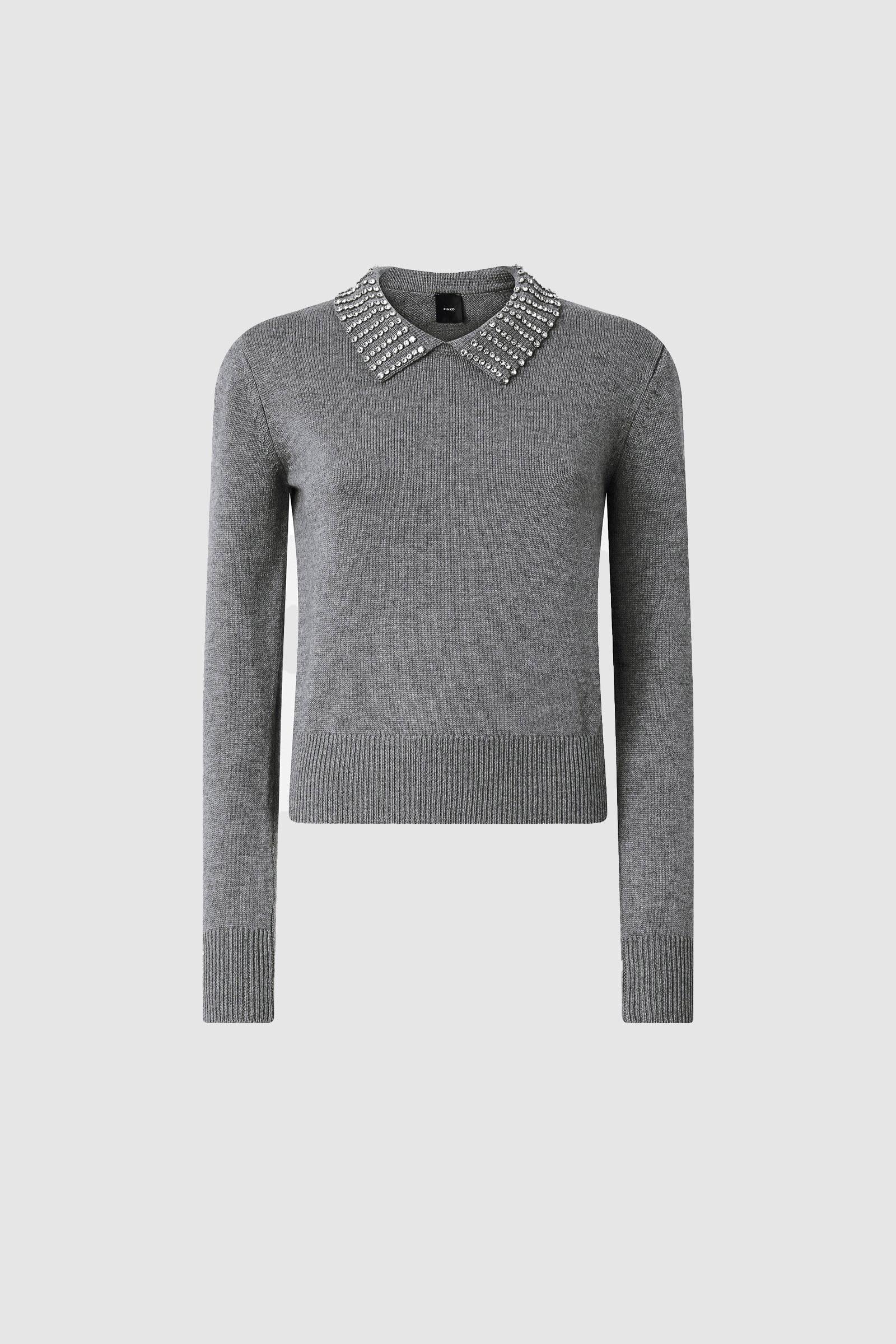 Maglia a maniche lunghe dalla vestibilità aderente con colletto stile polo. Il colletto cattura subito gli sguardi grazie alle applicazioni di strass che impreziosiscono il design. Orlo e polsini sono lavorati a coste, mentre sul davanti in basso spicca l'etichetta tono su tono con logo lettering PINKO. Il capo è stato sottoposto a prove di finissaggio per ridurre al minimo la possibile formazione di pilling, garantendo una maggiore morbidezza e durabilità del tessuto.Filato Esterno: NYLON 48% VISCOSA 27% LANA 20% CASHMERE 5% - 1° Ricamo: Vetro 100% - 2° Ricamo: ACCIAIO 100%