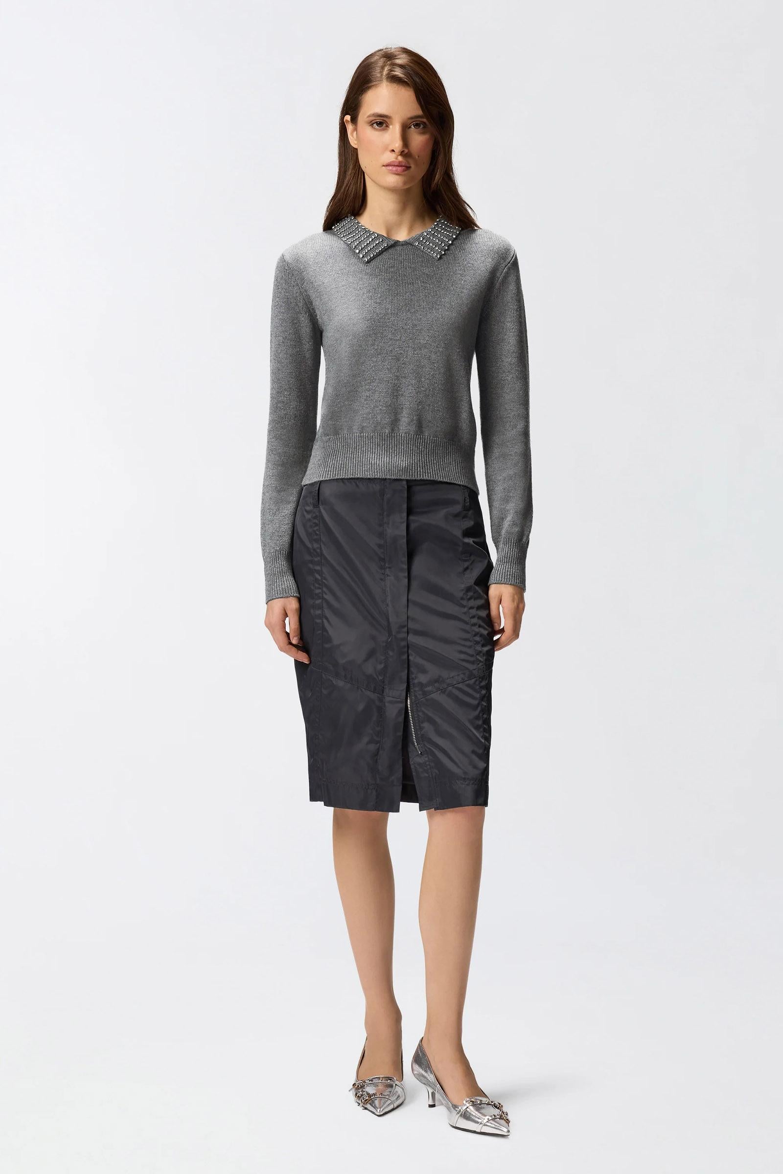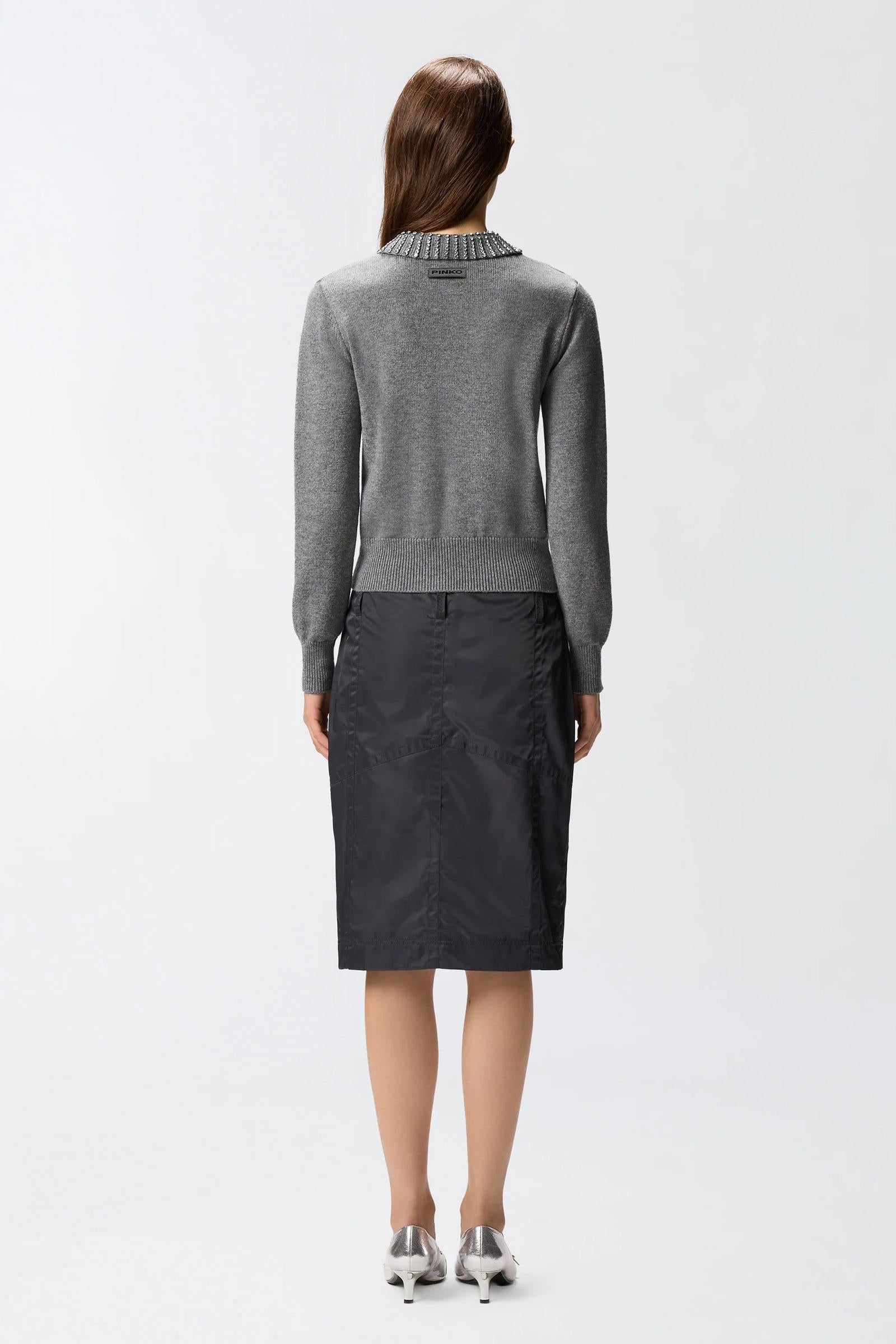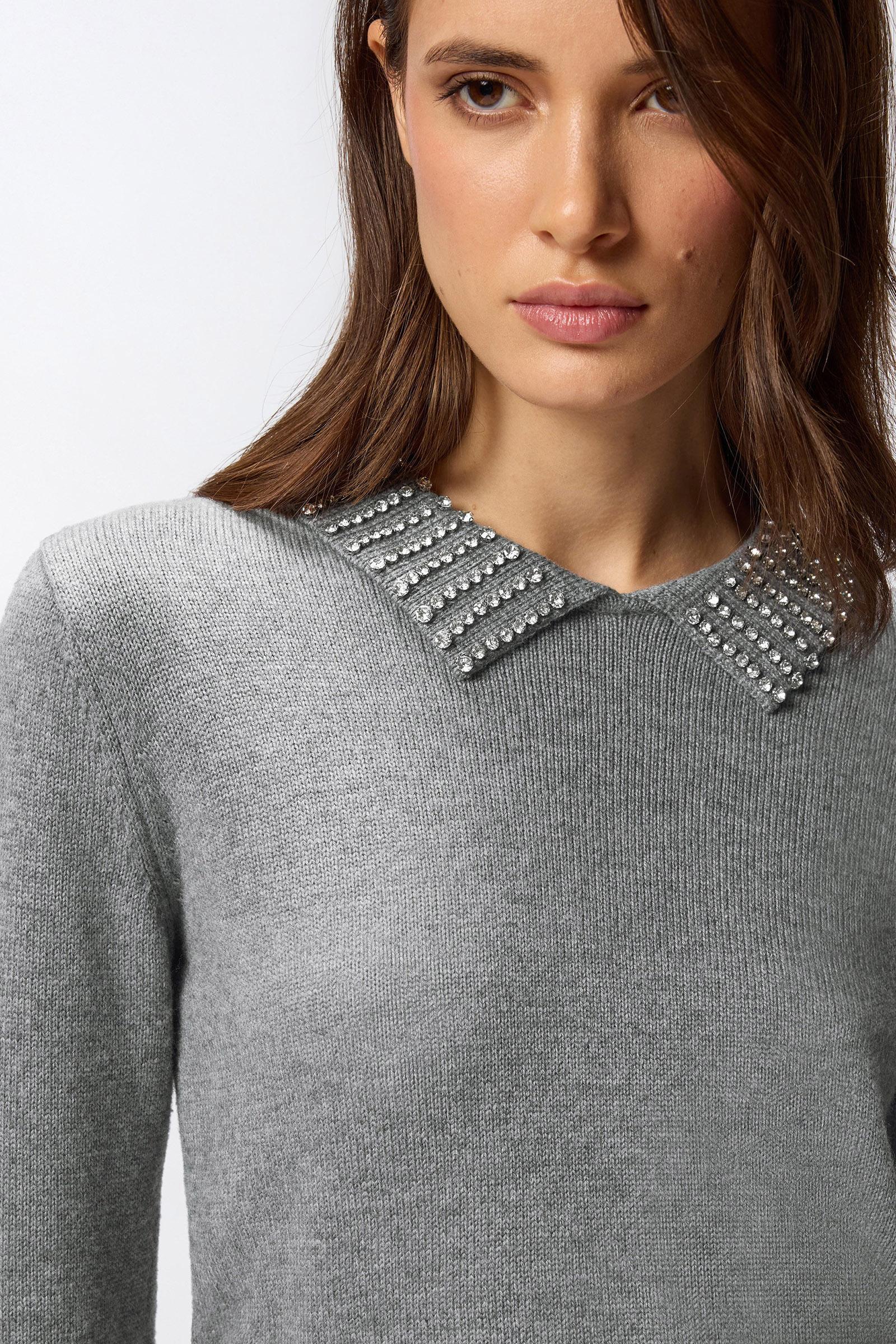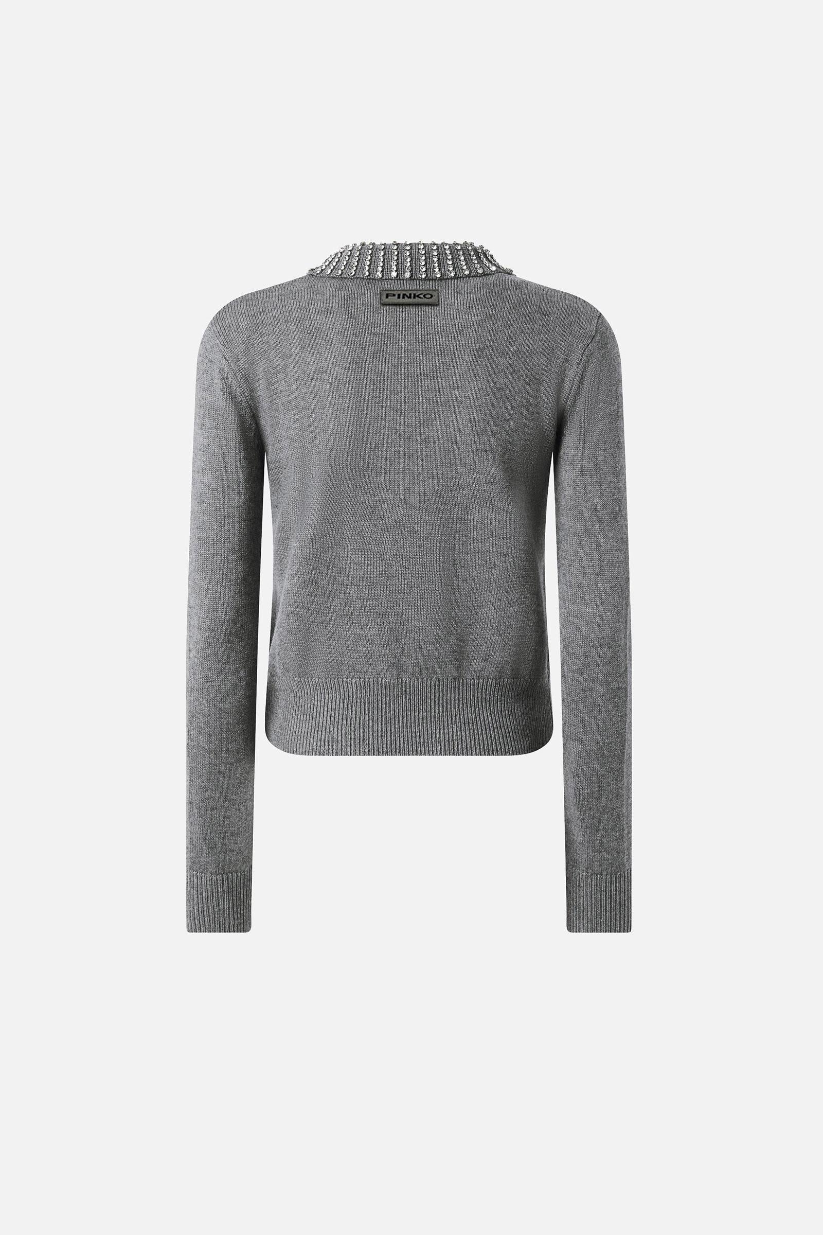 Maglia a maniche lunghe dalla vestibilità aderente con colletto stile polo. Il colletto cattura subito gli sguardi grazie alle applicazioni di strass che impreziosiscono il design. Orlo e polsini sono lavorati a coste, mentre sul davanti in basso spicca l'etichetta tono su tono con logo lettering PINKO. Il capo è stato sottoposto a prove di finissaggio per ridurre al minimo la possibile formazione di pilling, garantendo una maggiore morbidezza e durabilità del tessuto.Filato Esterno: NYLON 48% VISCOSA 27% LANA 20% CASHMERE 5% - 1° Ricamo: Vetro 100% - 2° Ricamo: ACCIAIO 100%