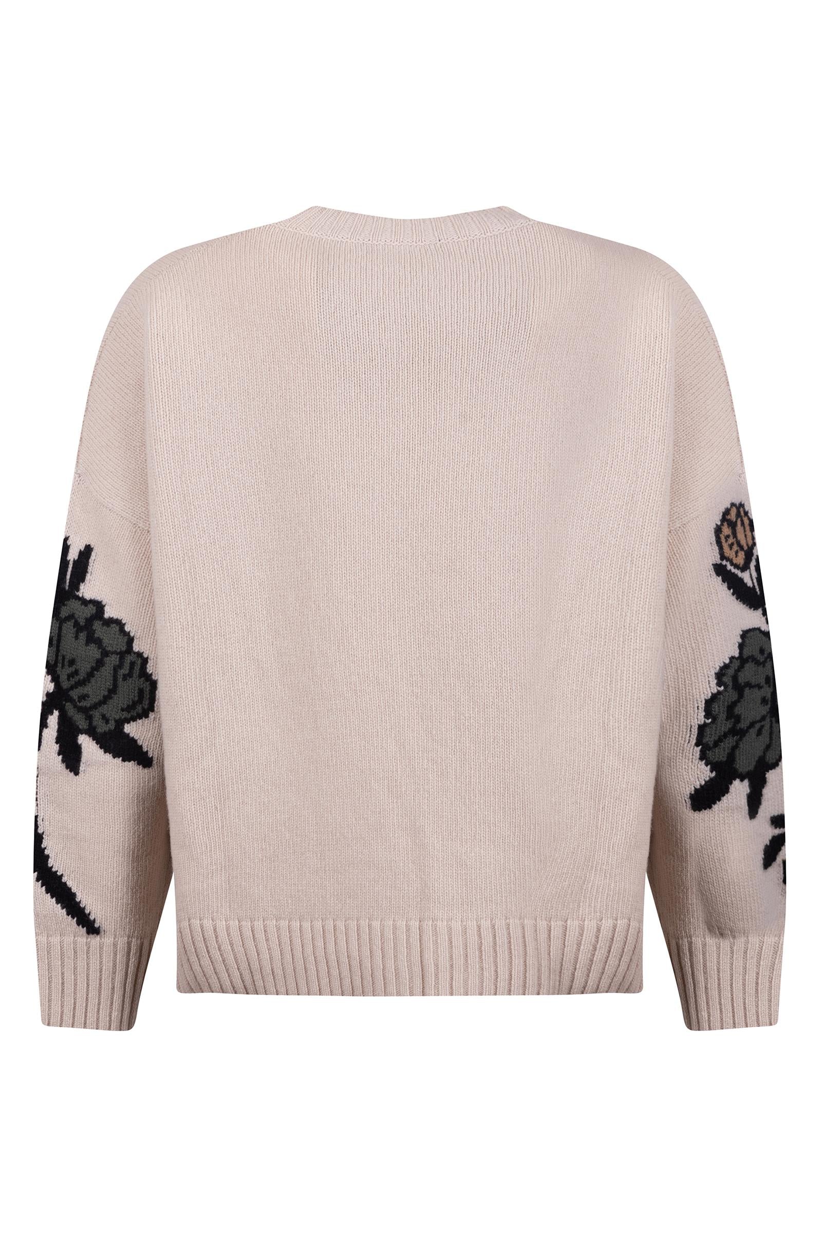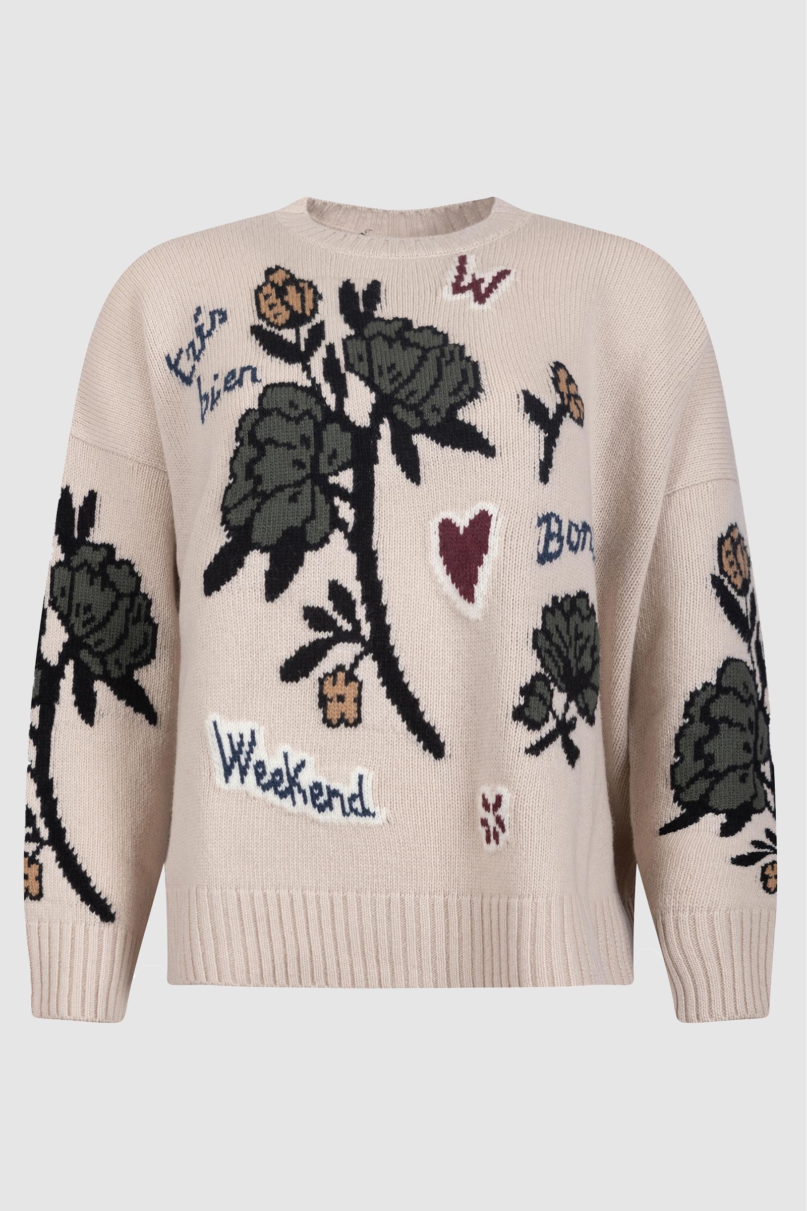 Un capo raffinato e creativo firmato Weekend Max Mara, pensato per chi desidera unire comodità e dettagli artistici. Realizzata in morbida maglia color beige, questa sweater oversize è impreziosita da intarsi floreali multicolor e scritte decorative come "Weekend", "Très Bien" e "Bon".