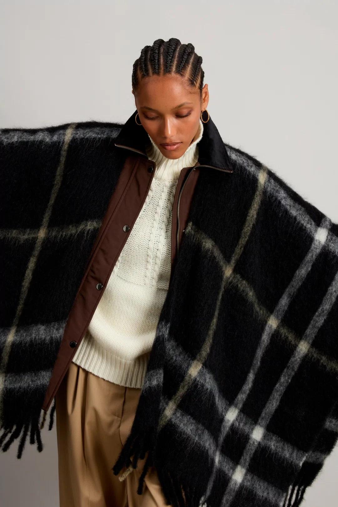 Questa mantella in misto alpaca, mohair e lana unisce calore e stile grazie a un motivo a quadri dal fascino senza tempo. Le frange sul fondo completano il design con un tocco dinamico e contemporaneo. Un capo che esprime la qualità artigianale del Made in Italy e l'attenzione ai dettagli, perfetto per arricchire i tuoi look nei primi freddi autunnaliRealizzata in misto alpaca, mohair e lana