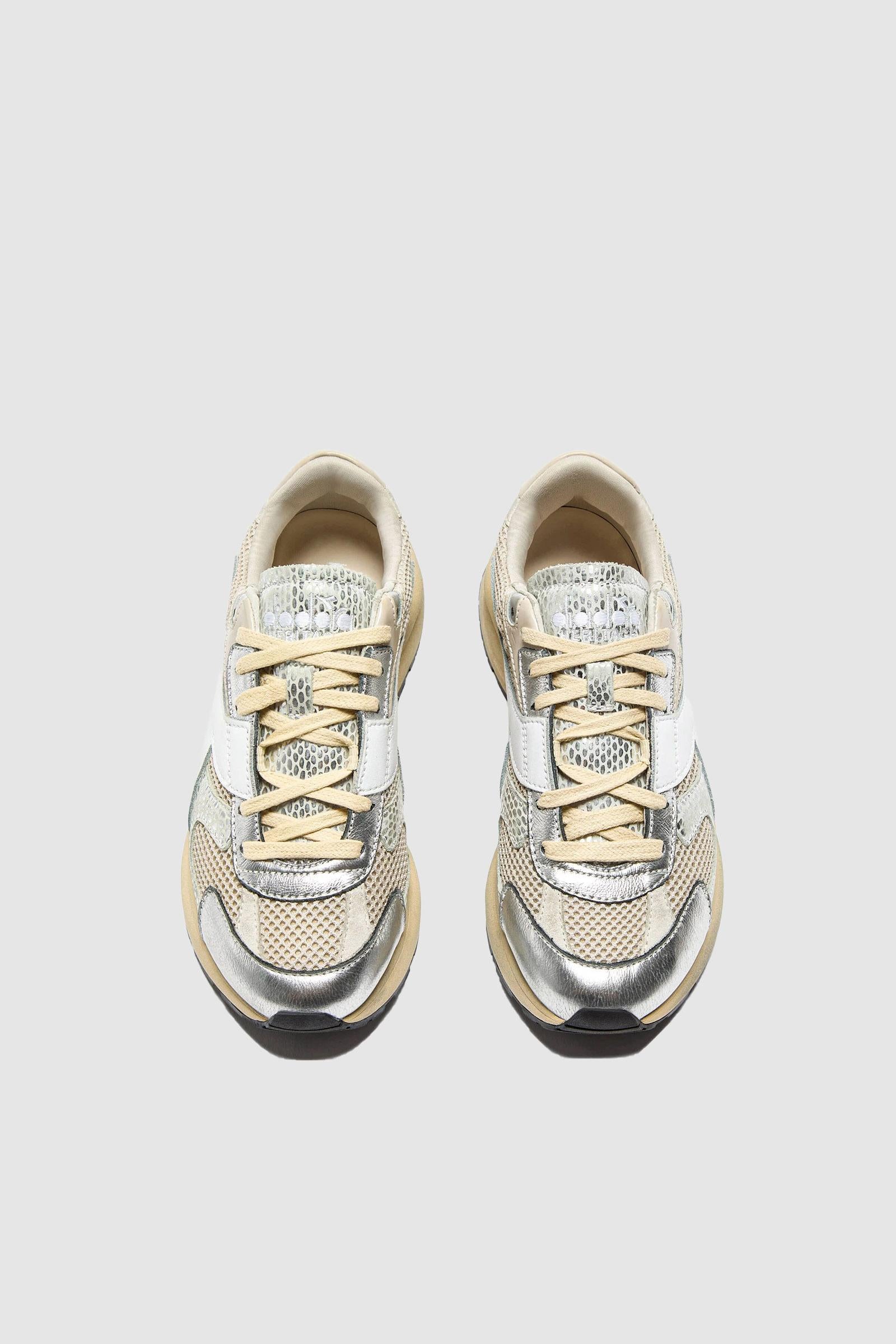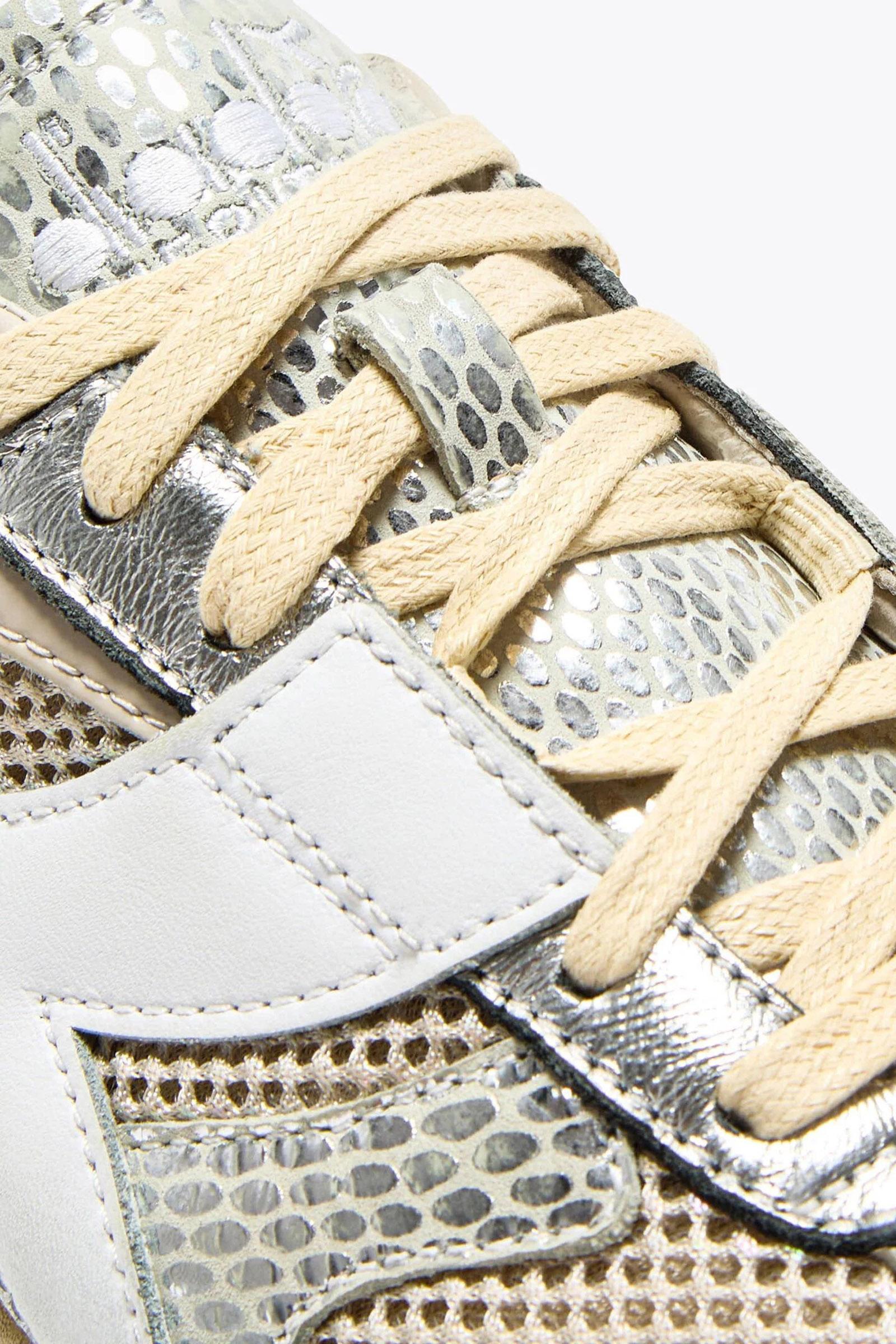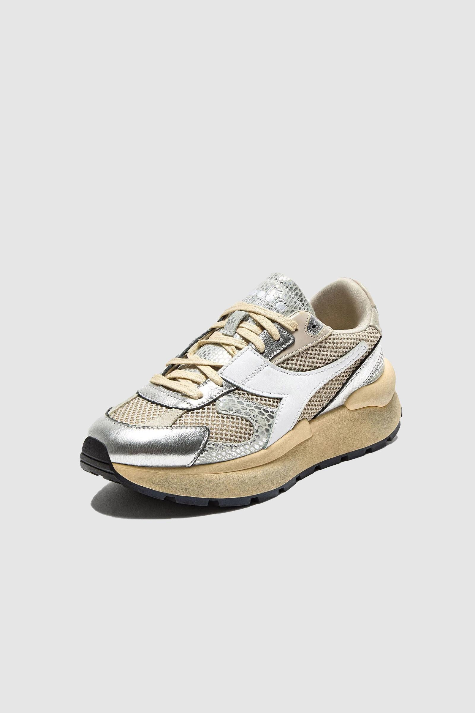 Un mesh leggerissimo con effetto shiny fa risaltare tutta la tomaia, mentre la pelle metallizzata crea un pattern a serpente impossibile da ignorare. Lavorata con il trattamento stone wash e wax, per combattere la tua nostalgia per le scarpe sportive anni '70.