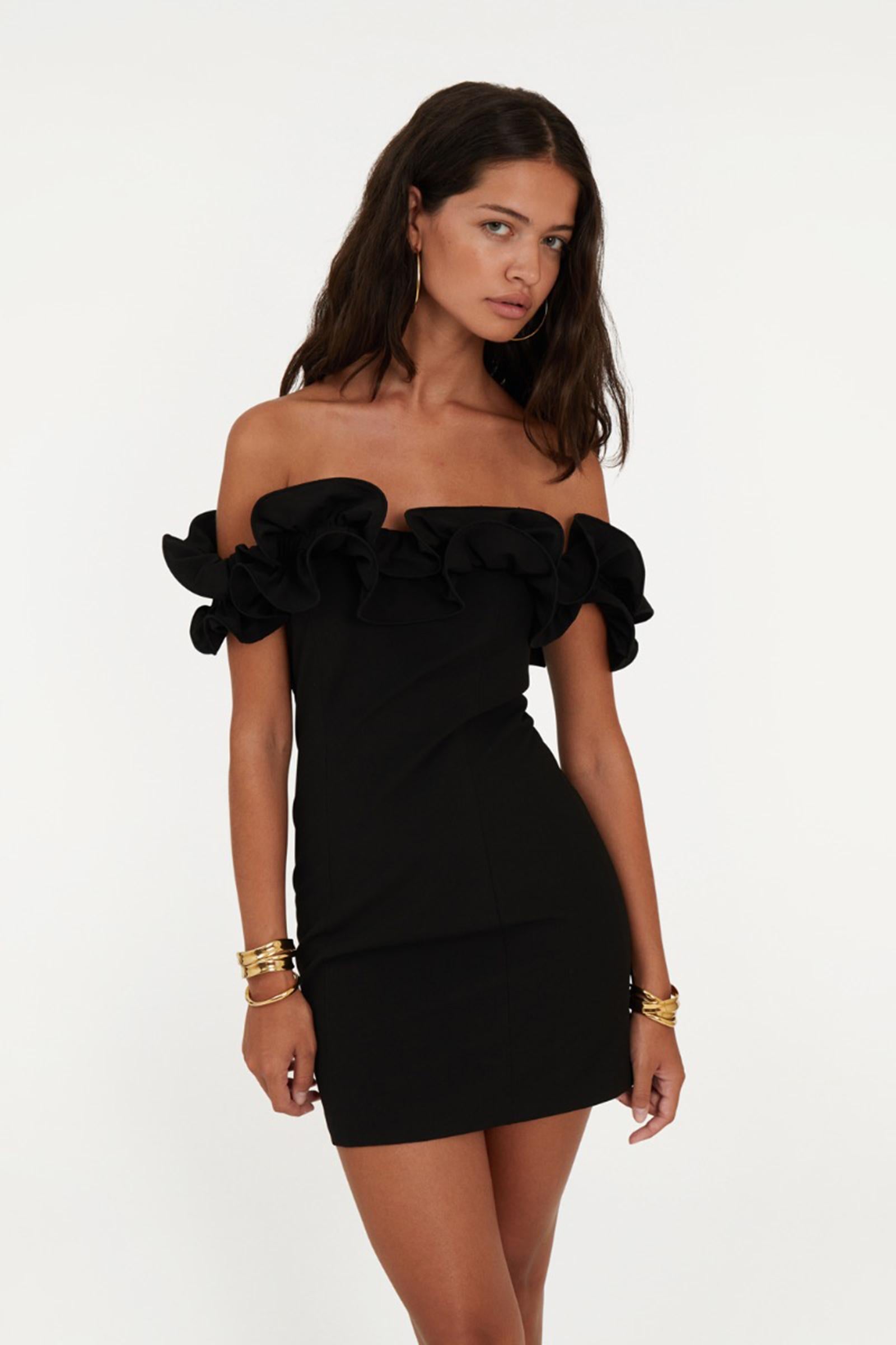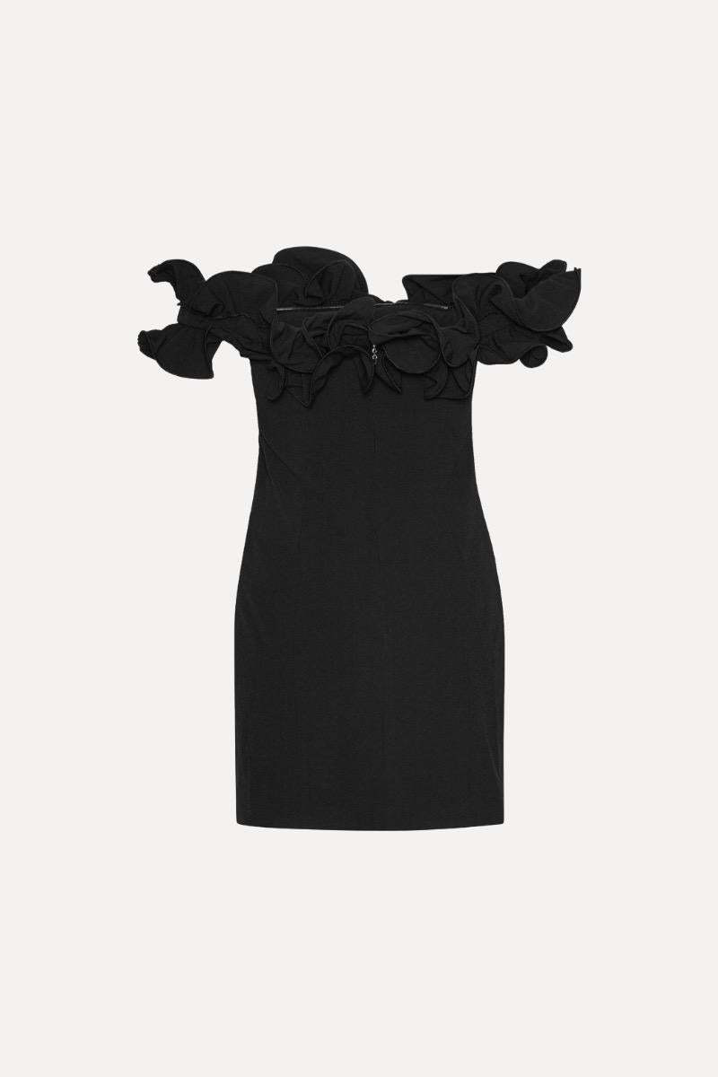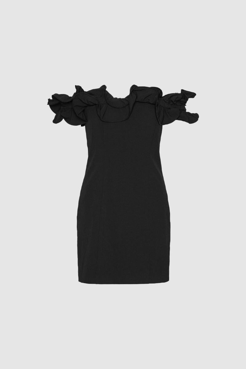 Il Mini Ruffle Dress Black presenta un design senza spalline con voluminosi dettagli a balze e una silhouette elegante di lunghezza mini. Questo elegante abito può essere abbinato ai Capri Ruffle Pants Black per un outfit coerente e di grande impatto.Composizione: Rivestimento: 61% poliestere (riciclato) 35% viscosa 4% elastan, Fodera: 92% poliestere (riciclato) 8% elastan
