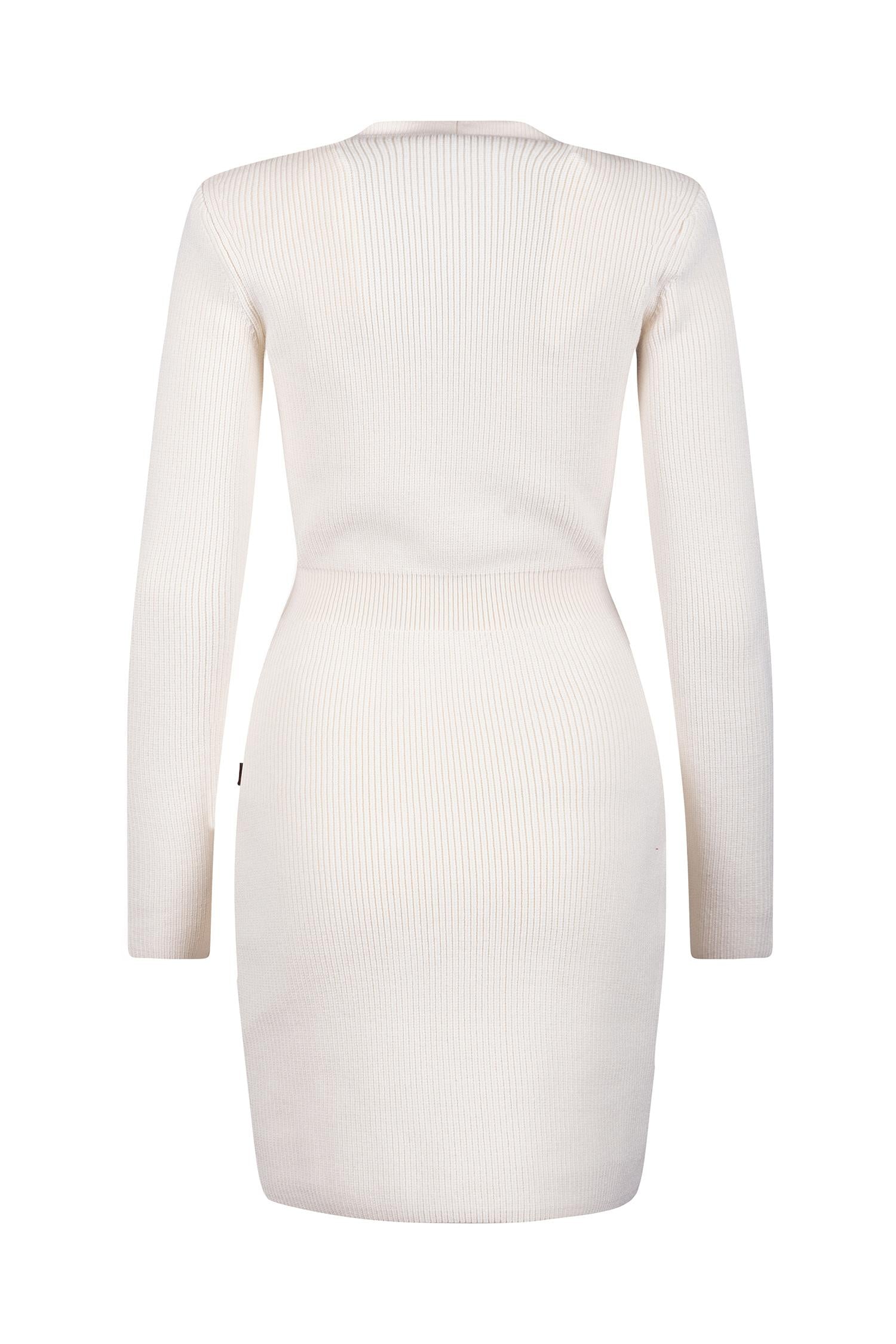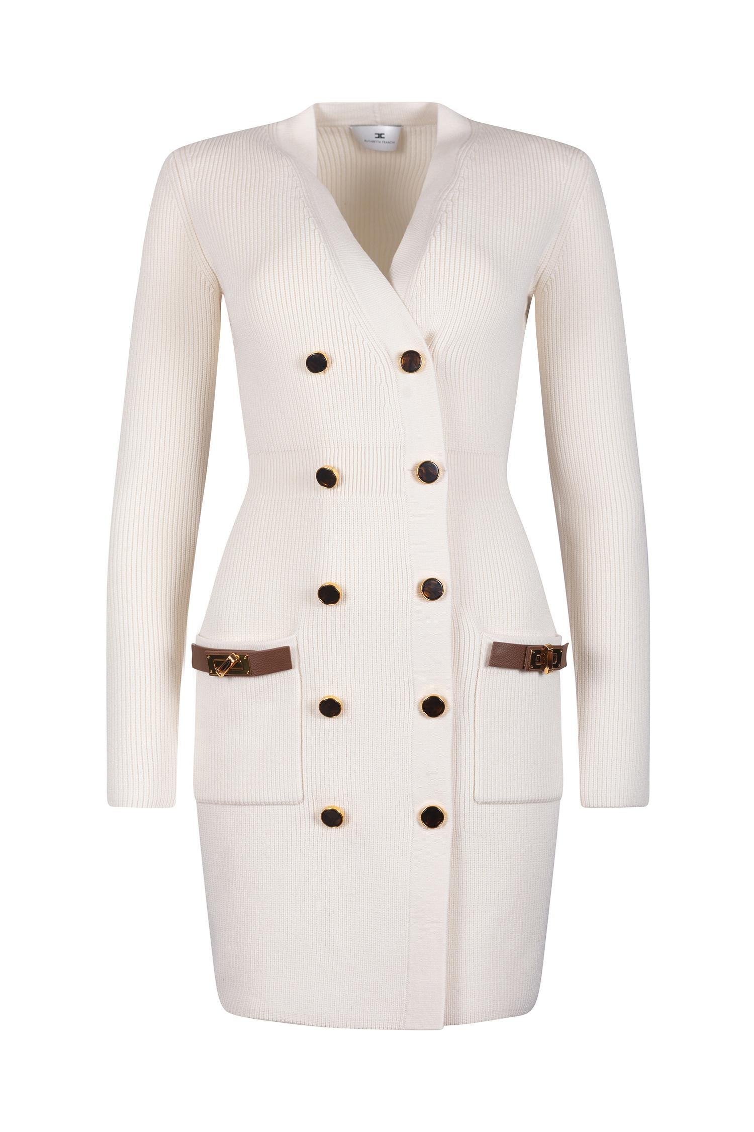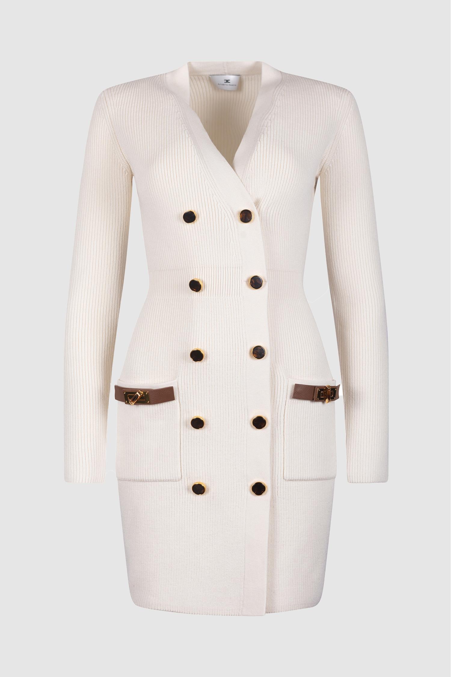 Mini abito robemanteau in maglia dalla vestibilità aderente. Dalla trama ricca e avvolgente, il vestito ha spalle strutturate, doppiopetto e tasche impreziosite dai cinturini con girello decorativo in metallo dorato. I bottoni dalle sfumature ambrate completano il capo.