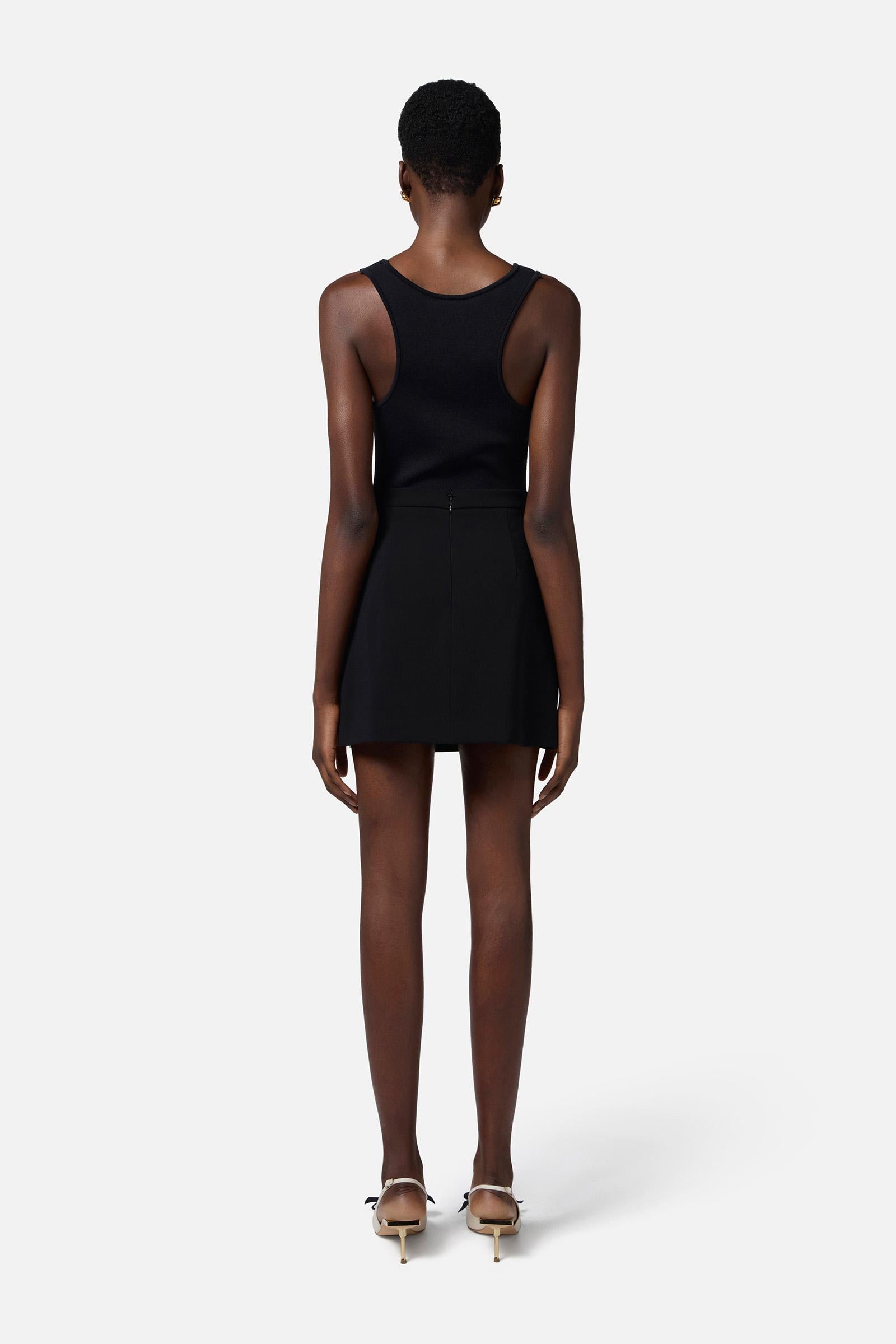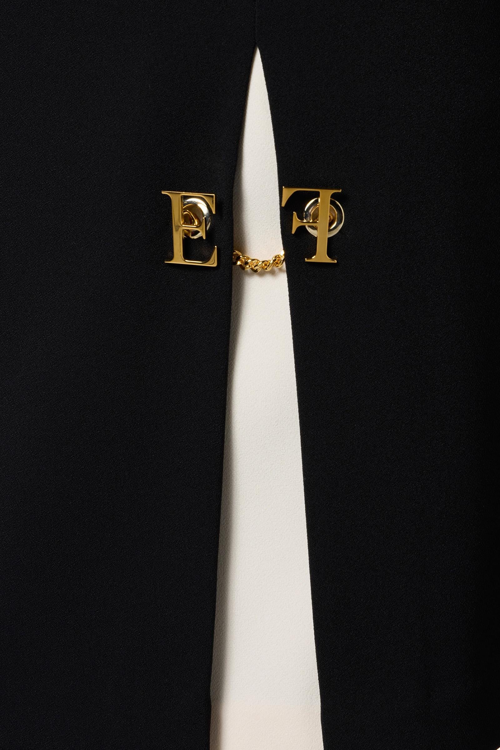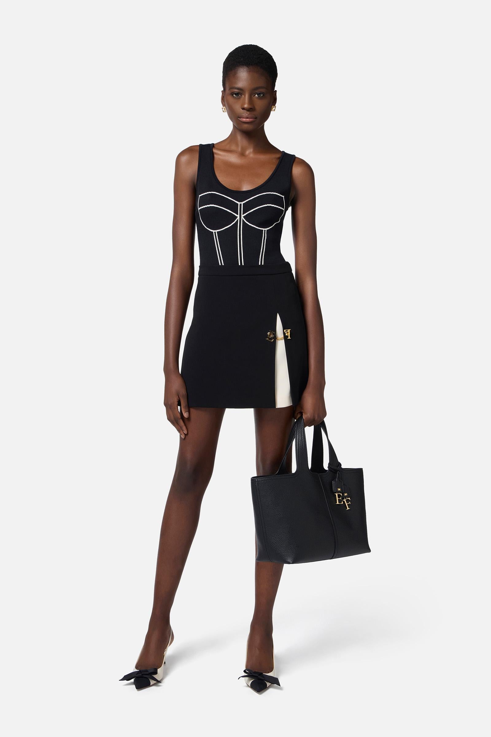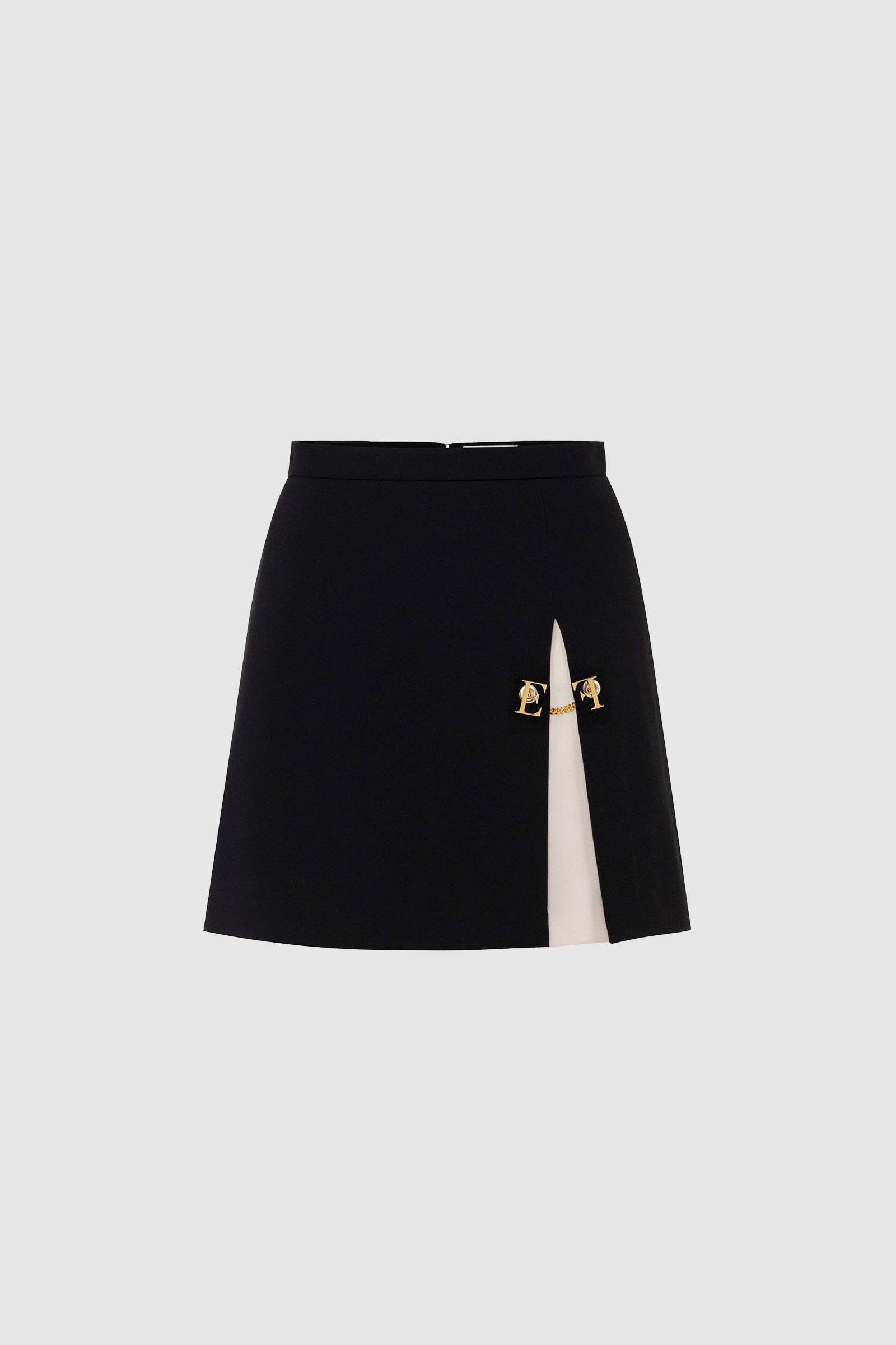Gonna corta in crêpe bicolore con vestibilità regular. Si distingue per lo spicchio a contrasto ottenuto con contropiega. Impreziosita dal maxi gemello con catenella e macro logo in metallo dorato che aggiunge luce.Composizione:98%Poliestere 02%Elastane