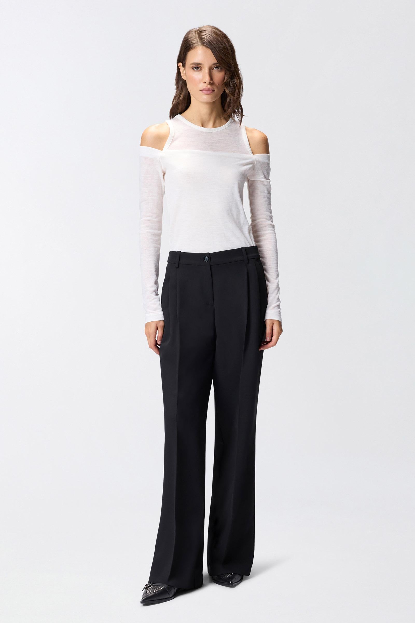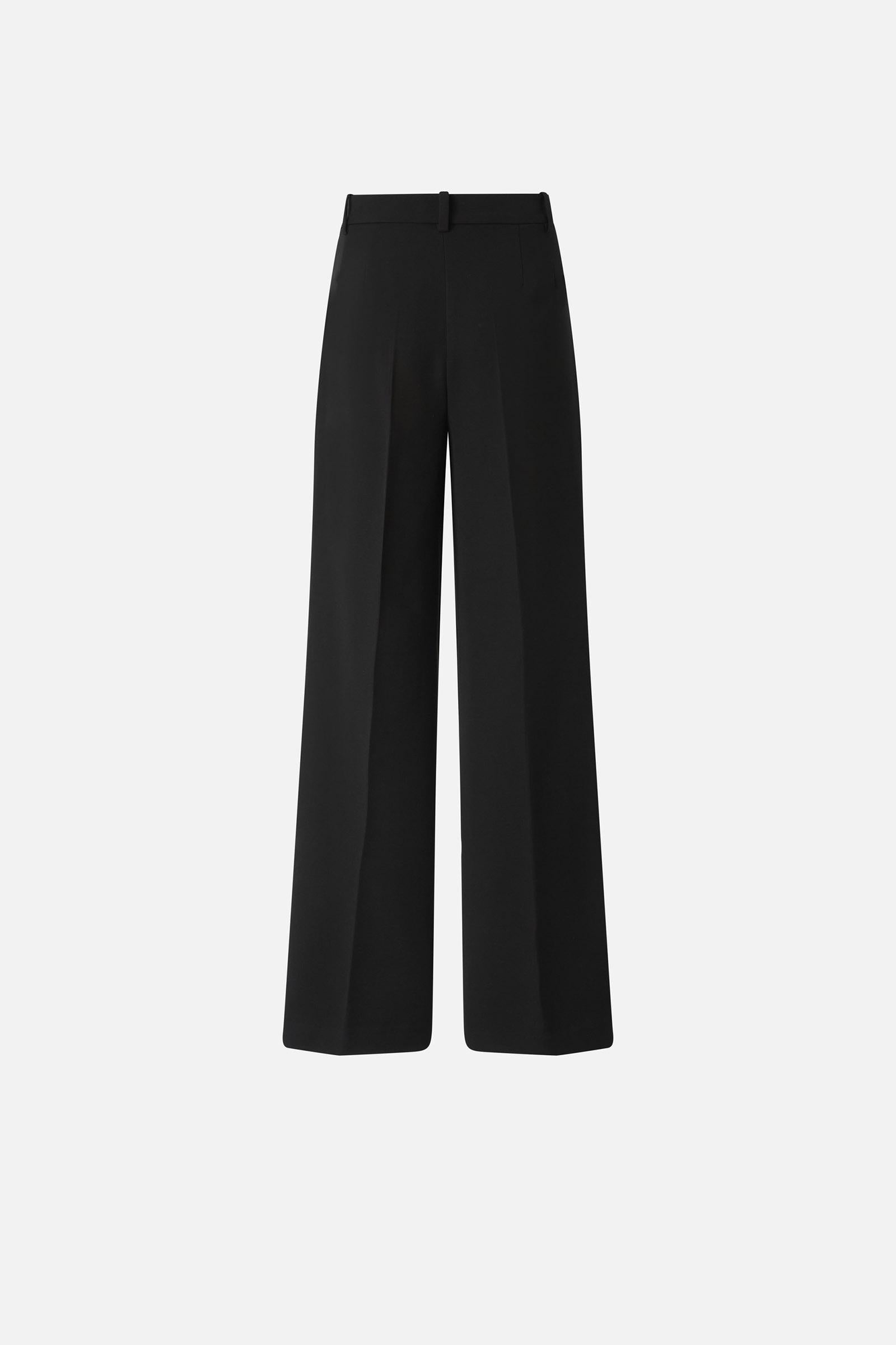 Pantalone femminile dalla silhouette ampia e fluida con elegante gamba palazzo che dona movimento ad ogni passo. Caratterizzato da vita alta che slancia la figura e chiusura frontale con bottone per un fit perfetto. Realizzato in tessuto morbido che cade naturalmente creando un effetto drappeggiato sofisticato. Perfetto da abbinare a top aderenti o camicie tucked-in per bilanciare le proporzioni e creare outfit eleganti sia per il giorno che per la sera.Tessuto Esterno: POLIESTERE 72% VISCOSA 23% ELASTAN 5% - Fodera: ACETATO 67% POLIESTERE 33%