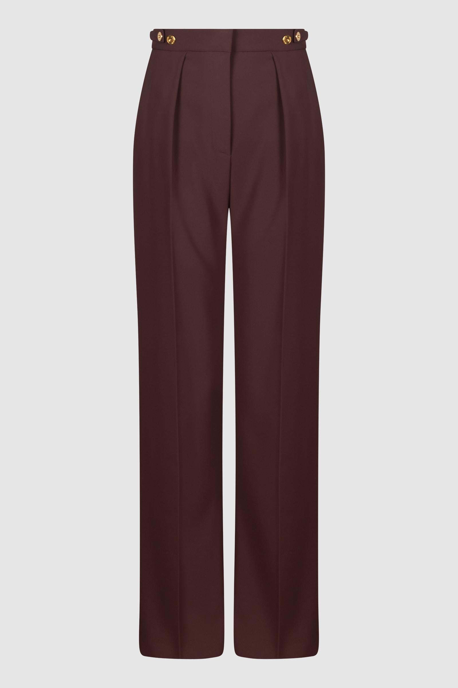 Pantaloni Elisabetta Franchi realizzati in tessuto fluido color marrone borgogna. Modello a vita alta con pinces frontali e dettagli iconici di bottoni logati dorati sui fianchi.