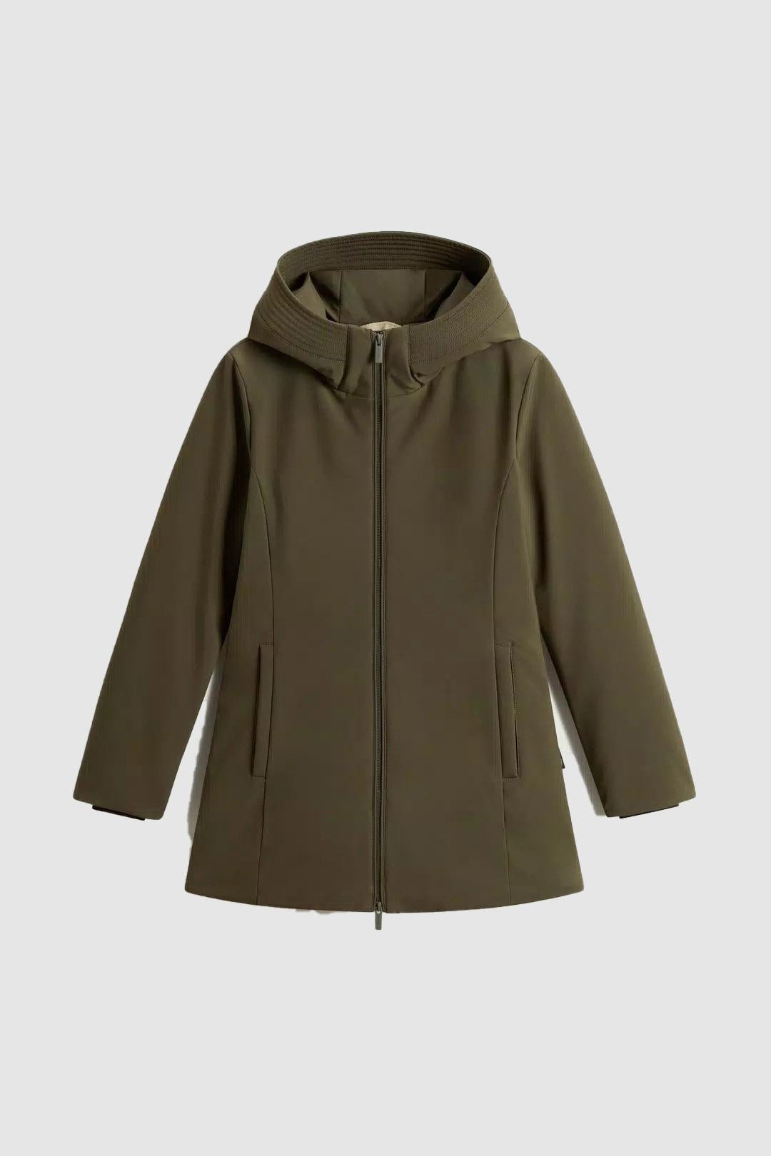 Un design iconico dalle linee contemporanee: il Firth Parka unisce l'eleganza della tradizione Woolrich a un tocco di femminilità, grazie alla silhouette slanciata valorizzata dalla coulisse interna regolabile in vita. Realizzato in Tech Softshell, un tessuto resistente all'acqua e antivento, è imbottito in piuma d'anatra con una trapuntatura Chevron all'interno. È dotato di cappuccio e collo alto per una protezione ottimale, presenta tasche a filetto, una comoda tasca interna con zip, polsini a costine e un'etichetta applicata lateralmente.Realizzato in tessuto Tech Softshell