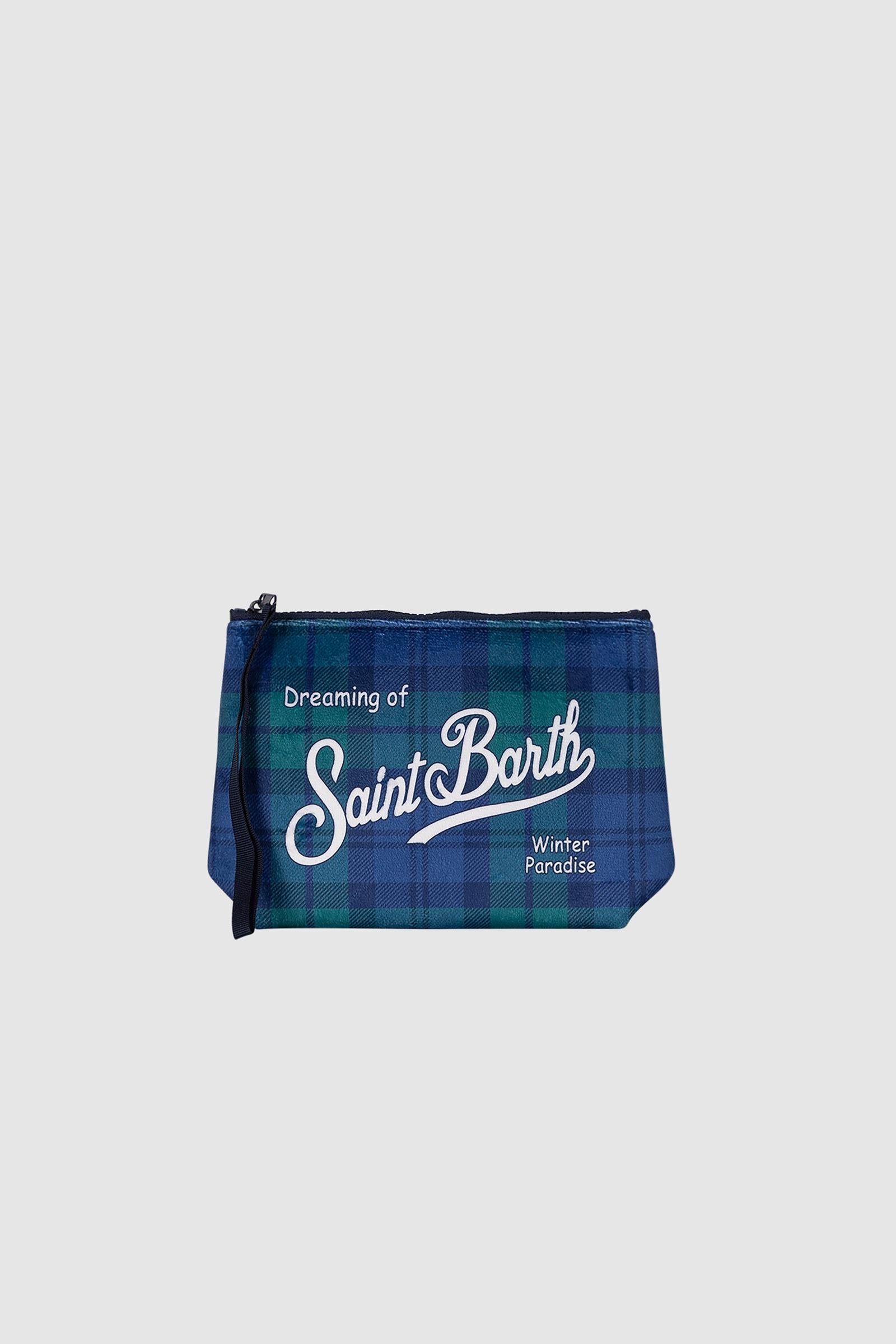 Lo stile iconico di MC2 Saint Barth incontra l'atmosfera invernale con la pochette "Dreaming of Saint Barth - Winter Paradise". Realizzata in morbido tessuto effetto tartan blu e verde, è perfetta come trousse, beauty case o mini bag per le tue giornate di viaggio o di relax in montagna.