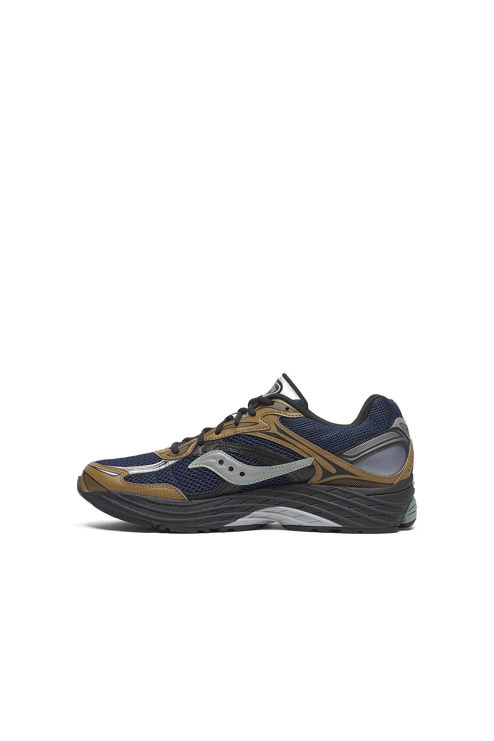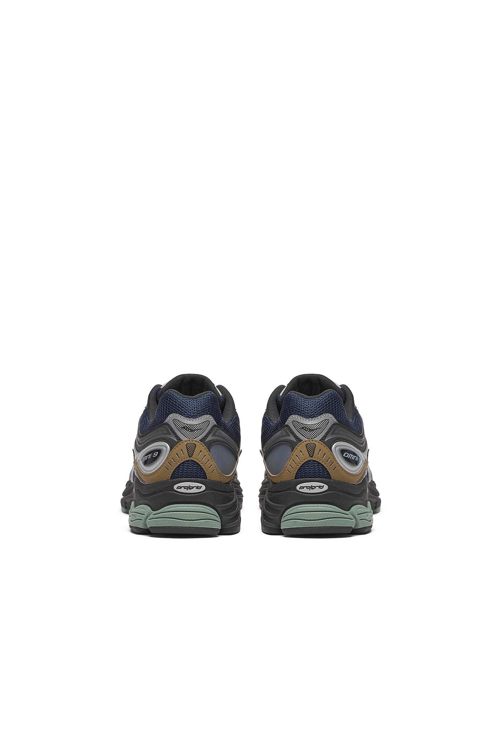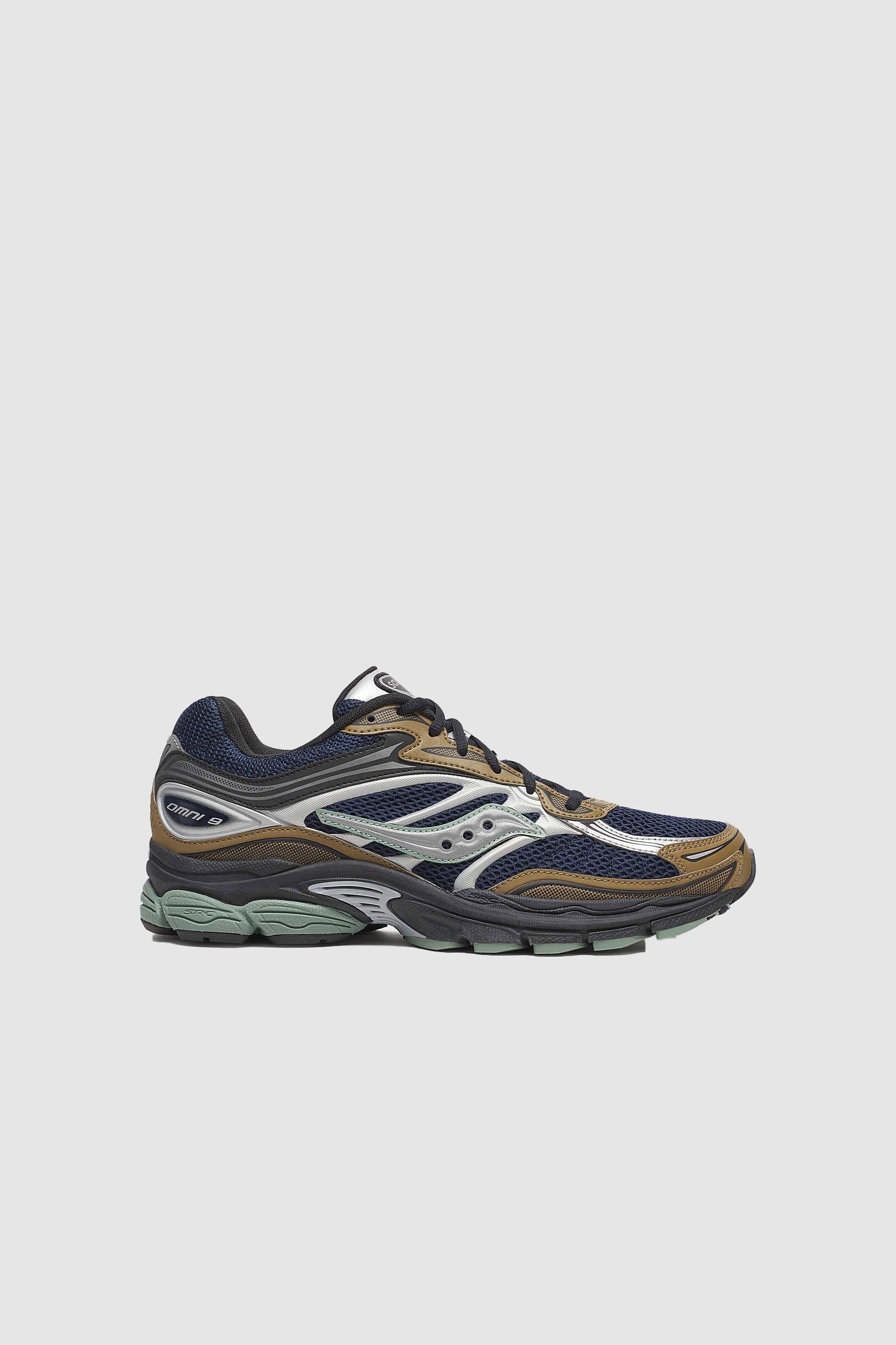 Il look dell'Omni 9 unisce toni tecnici e outdoor: blu navy, dettagli marroni e inserti verde oliva si combinano con accenti argentati per uno stile che comunica solidità e performance. Una scarpa pensata per runner esperti o per chi necessita di supporto extra.