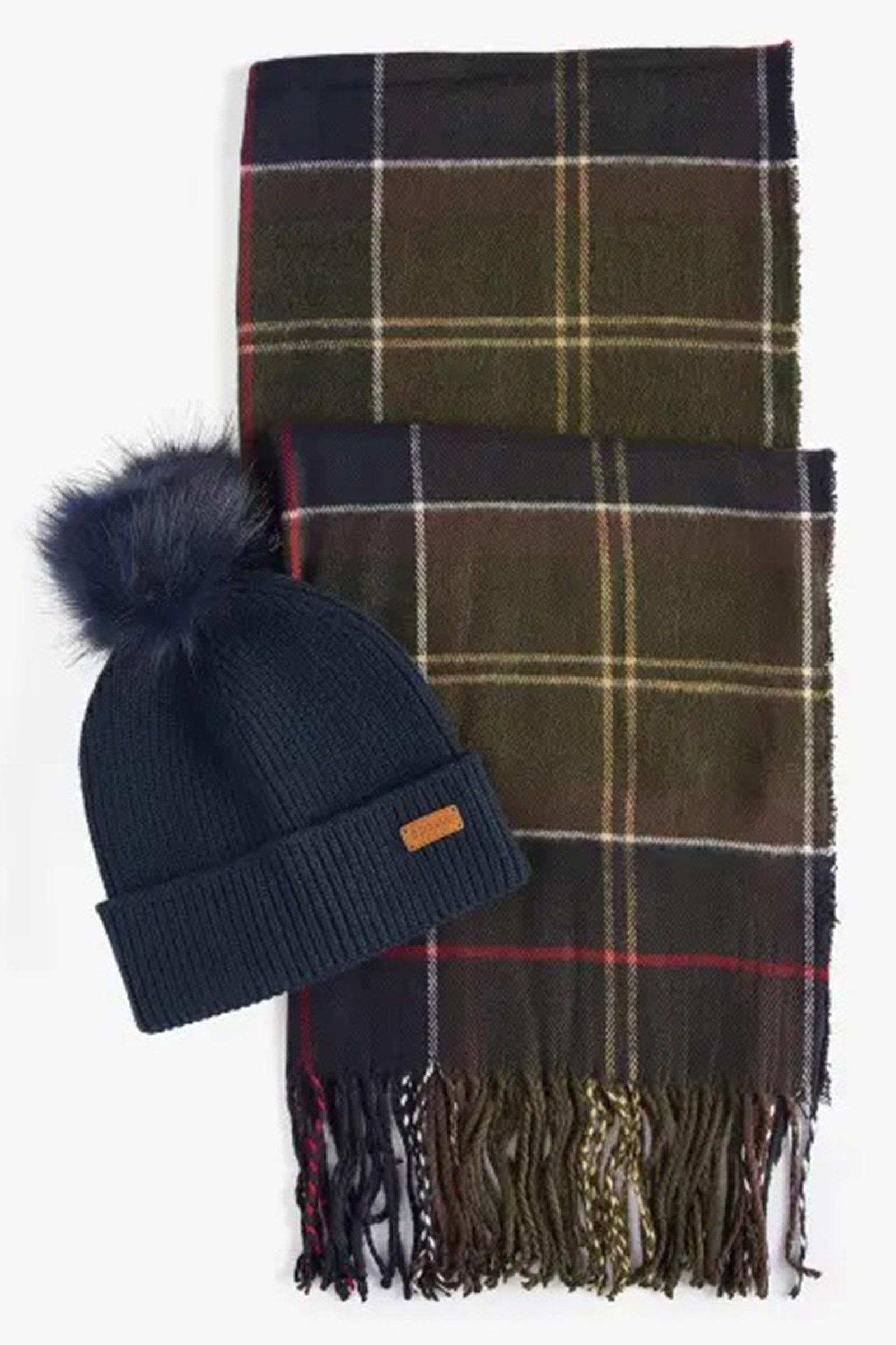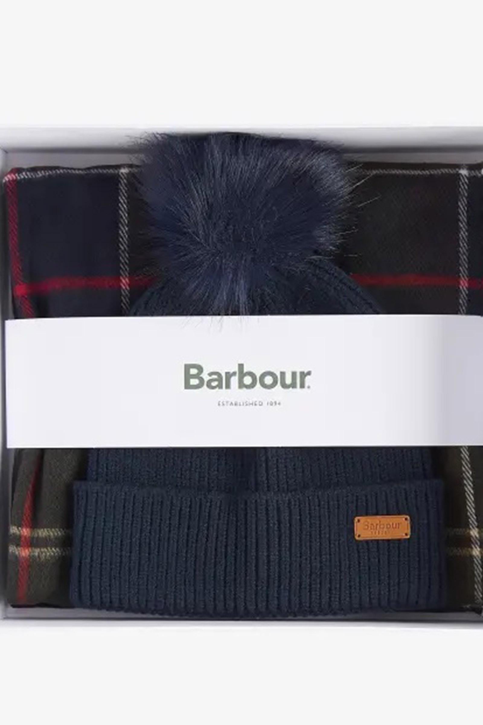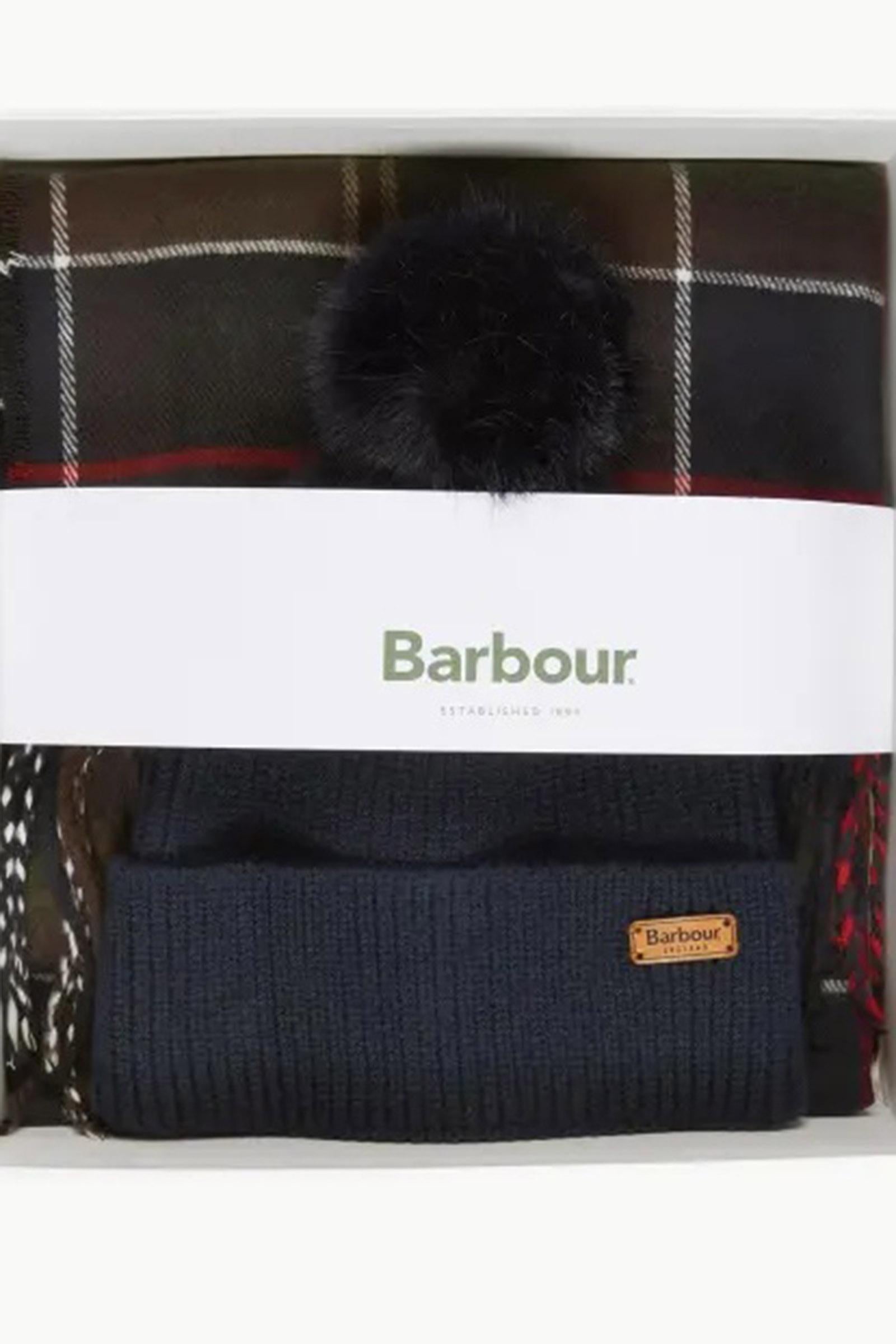 Il set regalo Barbour Dover Beanie & Hailes Scarf presenta un pon pon di pelliccia sintetica e una sciarpa tartan con nappe. Presentato in una scatola regalo, questo set è un regalo ideale per Natale o per un compleanno.Berretto: 53% viscosa, 26% poliestere, 21% poliammide Sciarpa: 100% acrilico Lavare esclusivamente a mano
