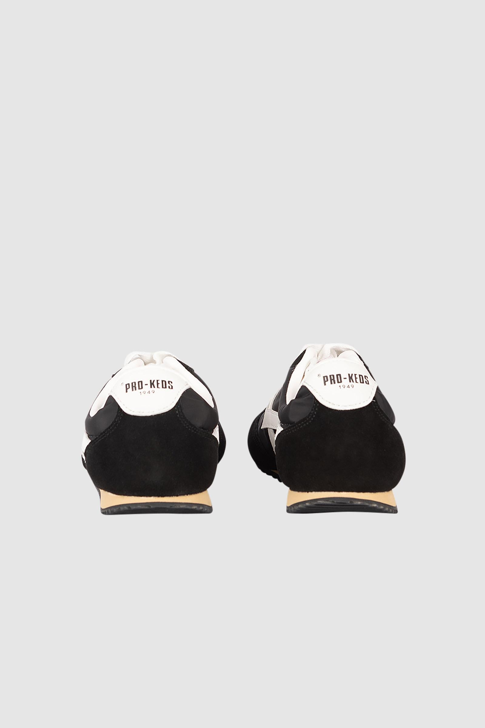La tomaia in pelle liscia nera è completata da inserti in suede tono su tono su punta e tallone, che aggiungono texture e raffinatezza al modello. Sul lato è presente il caratteristico logo Pro-Keds a motivo zig-zag in bianco, elemento distintivo che crea un contrasto deciso e pulito, valorizzando il profilo della scarpa.
