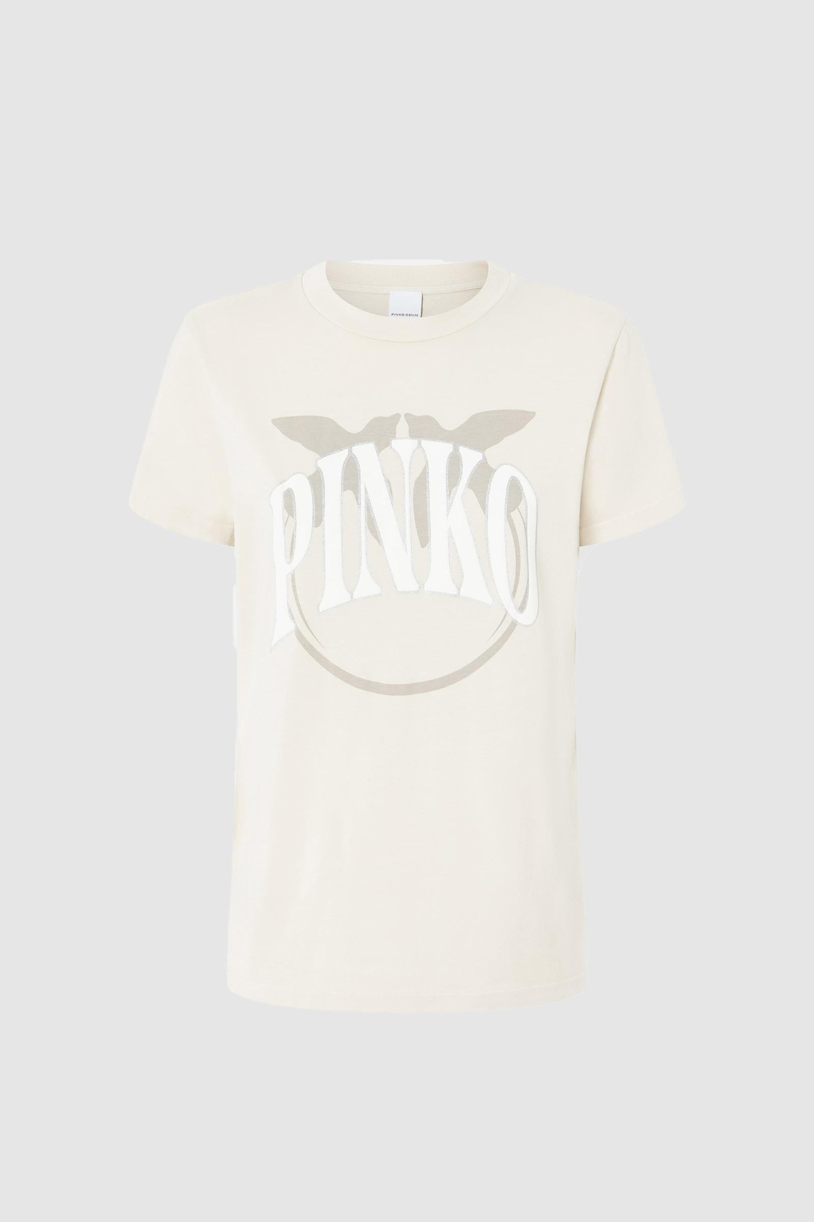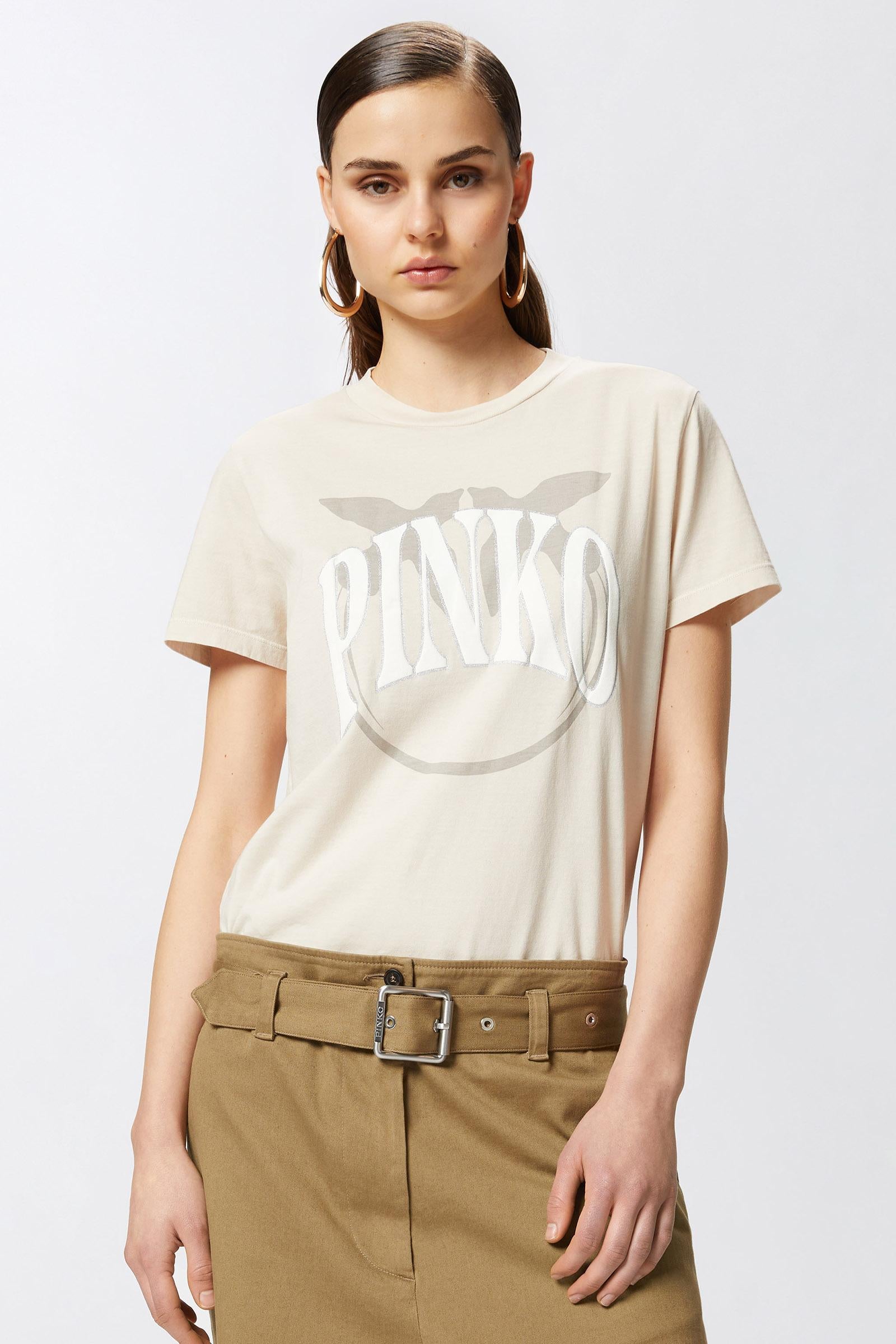 T-shirt classica a maniche corte in jersey di cotone personalizzata con maxi stampa che combina il lettering PINKO e il logo uccellini Love Birds, con uno speciale outline glitterato che aggiunge un iconico tocco scintillante. Iconica e versatile, aggiungi la t-shirt stampata nel tuo colore preferito a qualsiasi look da giorno per un tocco personale che non passa inosservato.1° Tessuto Esterno: COTONE 100% - 2° Tessuto Esterno: COTONE 100%