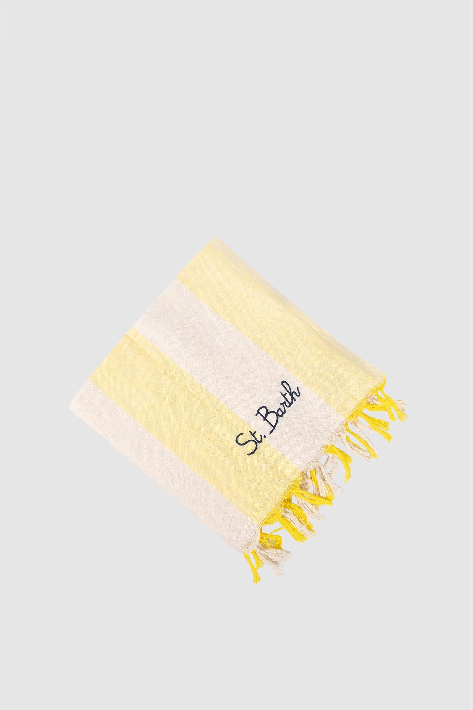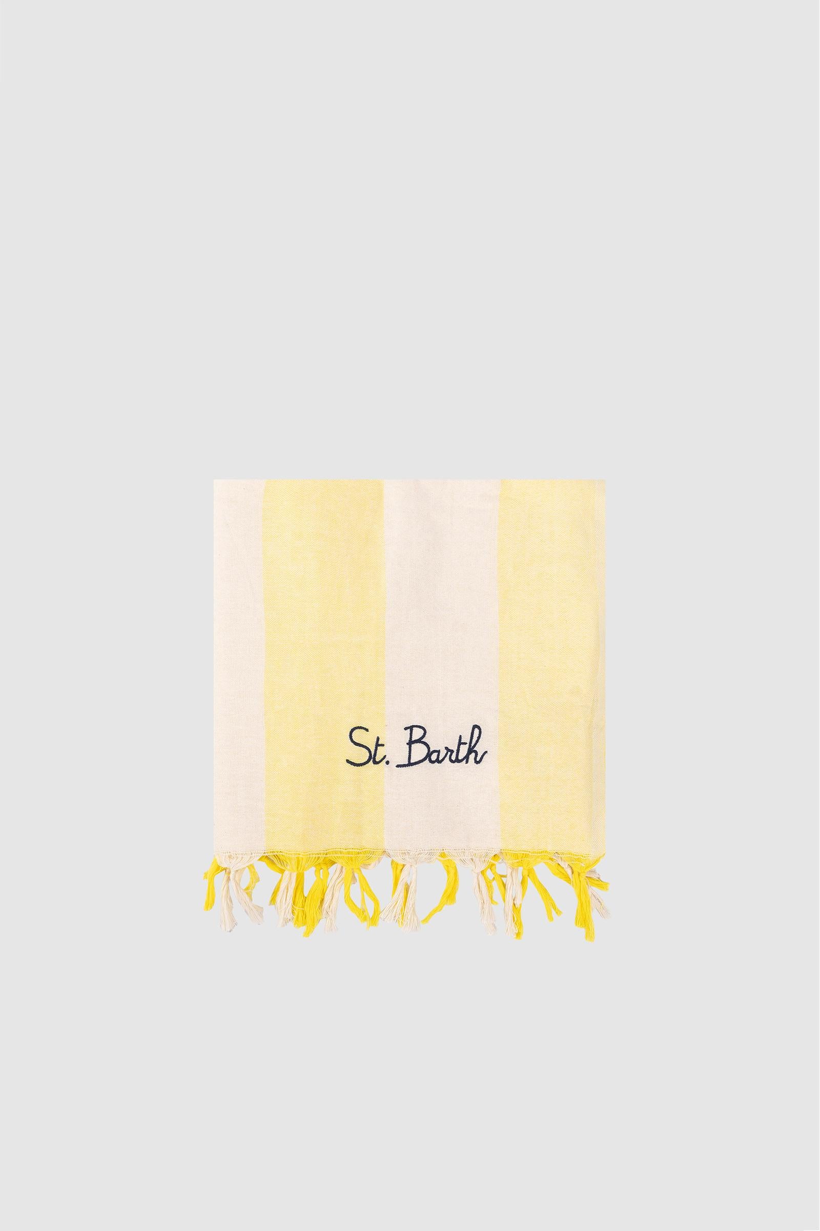 Porta lo spirito delle vacanze sempre con te con questo telo mare firmato St. Barth. Realizzato in morbido cotone, si distingue per il design a righe larghe giallo pastello e panna, completato da frange annodate a mano e dal ricamo "St. Barth" in elegante filo blu.