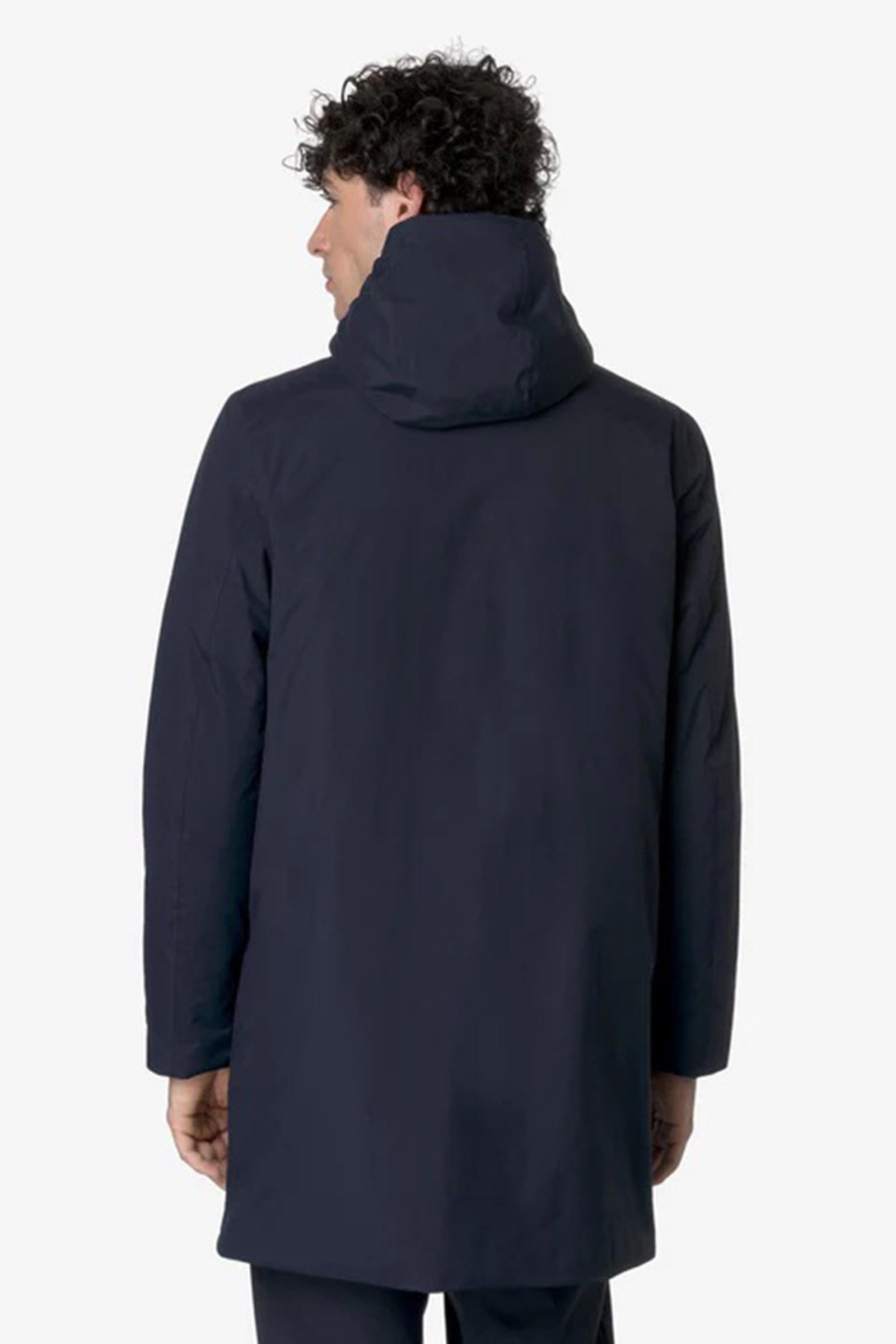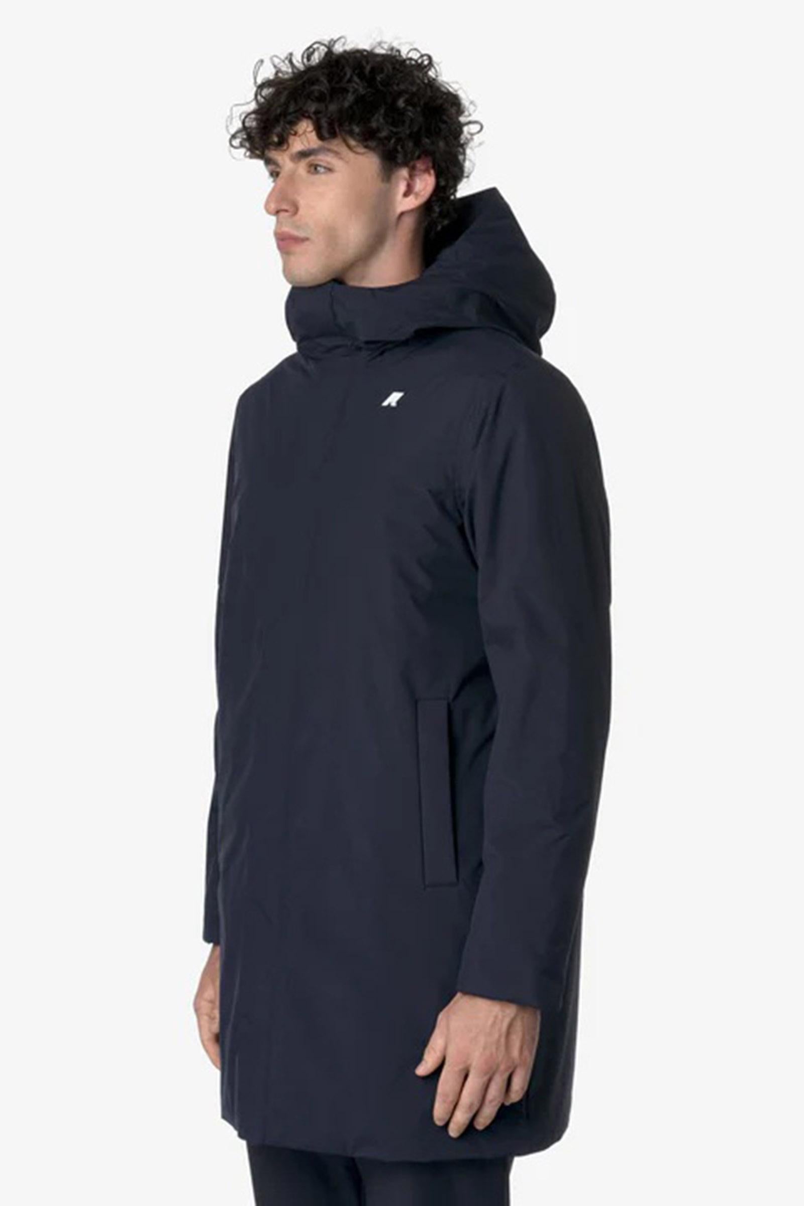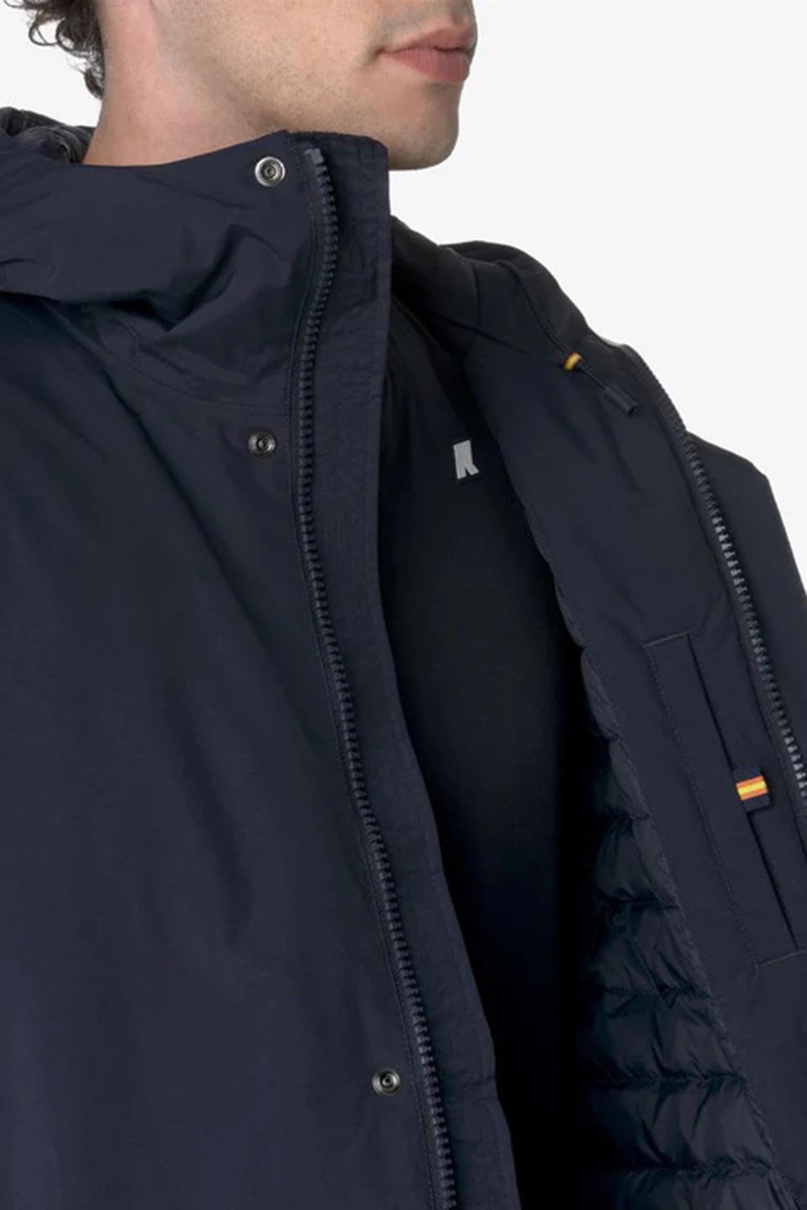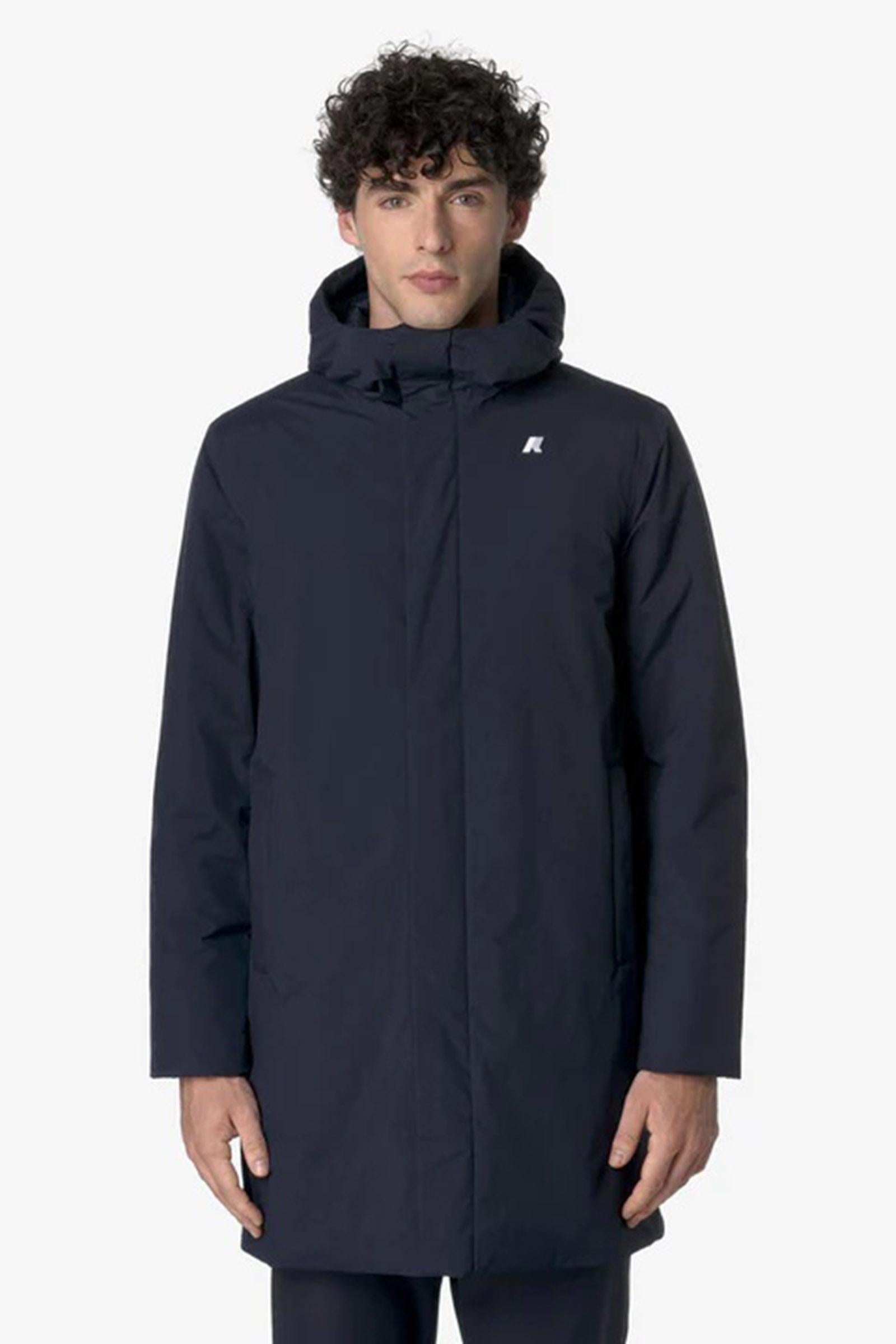 La giacca lunga da uomo Thomas è progettata per la mezza stagione perchè combina l'esterno in nylon ottoman dalla mano fresca e croccante con l'imbottitura mista in piuma e poliestere e la fodera in nylon riciclato che rispettano l'ambiente. All'interno il capo svela una rifinitura curata in ogni dettaglio con trapuntatura a righe orizzontali nella parte alta e il nastro multicolor K-Way al centro per un accento distintivo e deciso.