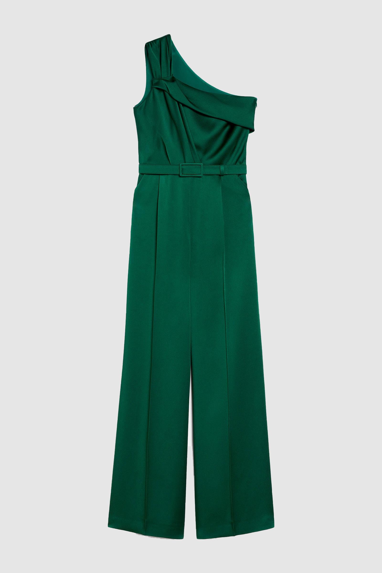 Tuta monospalla in enver satin, caratterizzata da motivo annodato drappeggiato sulla spalla destra e pantalone wide leg con pinces, piega stirata e tasche inserite nei fianchi. La cintura abbinata permette di evidenziare il punto vita. Semifoderata, si chiude con zip invisibile laterale.Composizione:Tessuto 71% acetato, 29% viscosa; fodera 85% acetato, 10% seta, 5% poliammide.